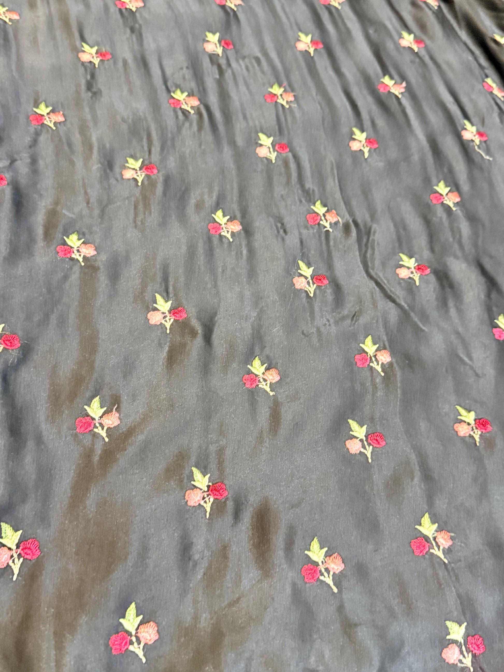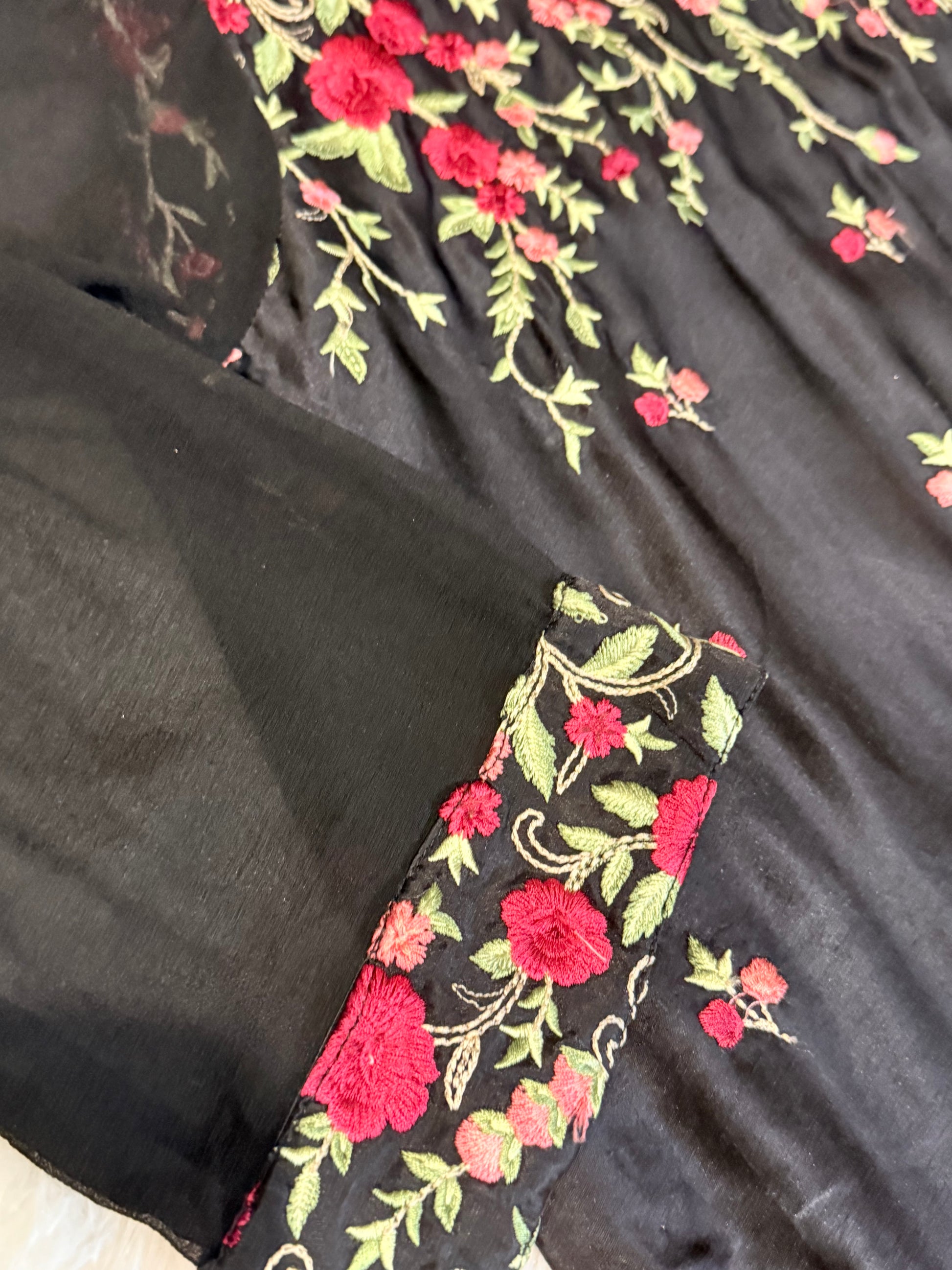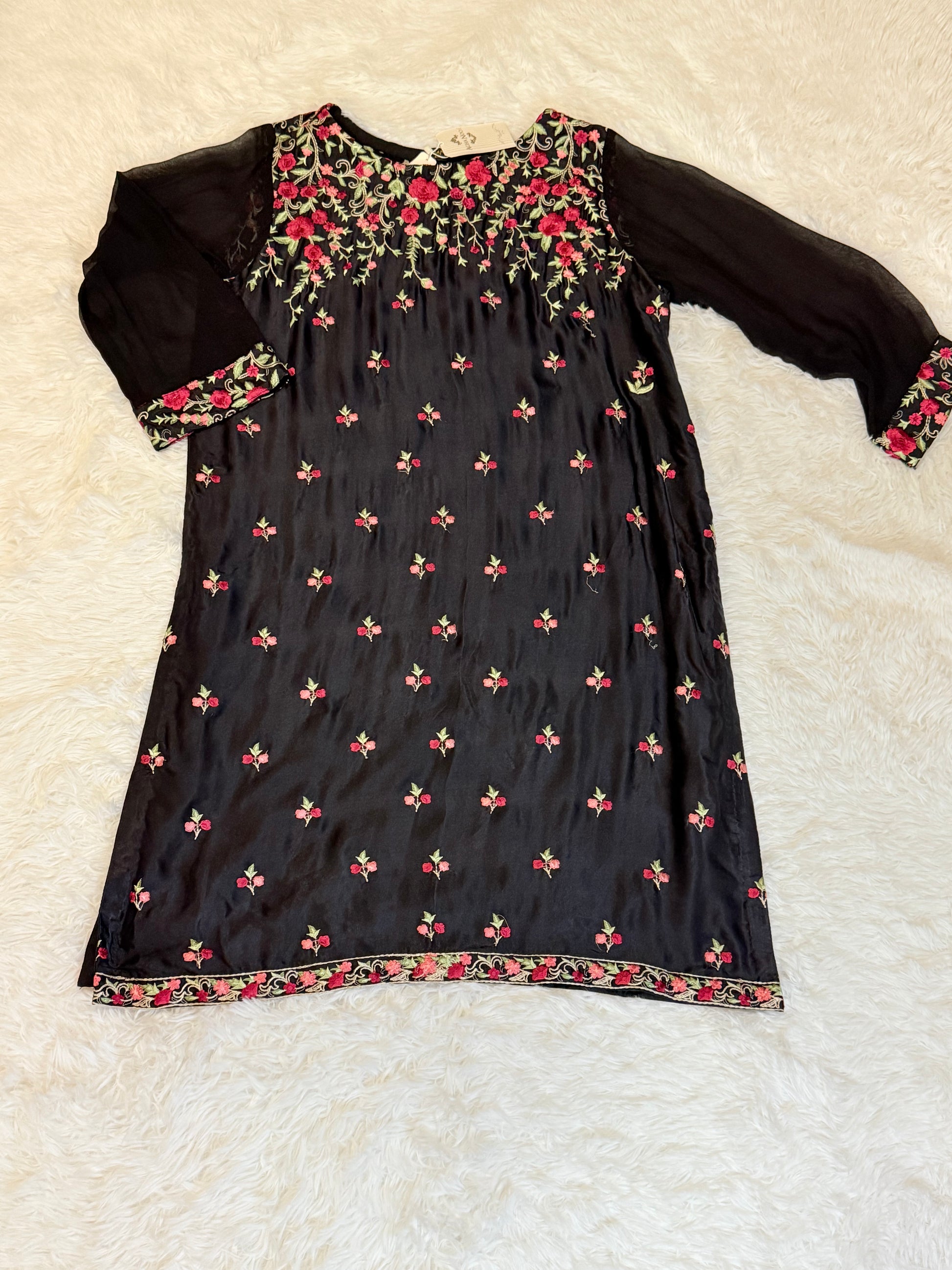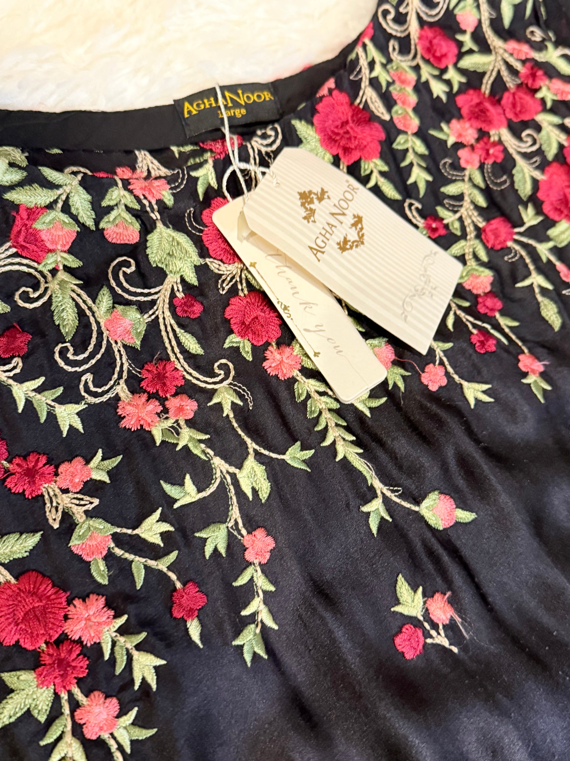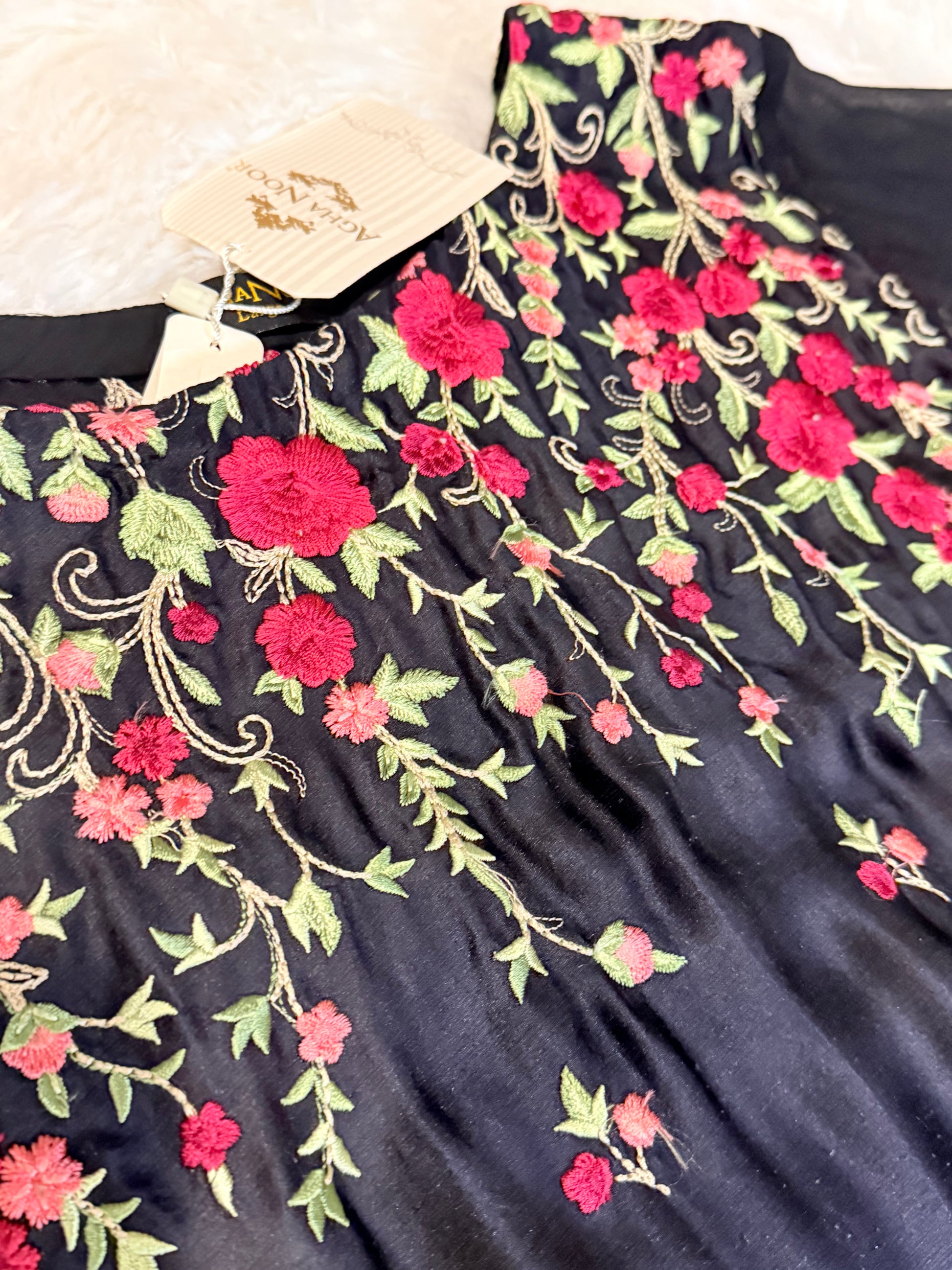 Agha Noor Black Silk Embroidered Shirt with Chiffon Sleeves.