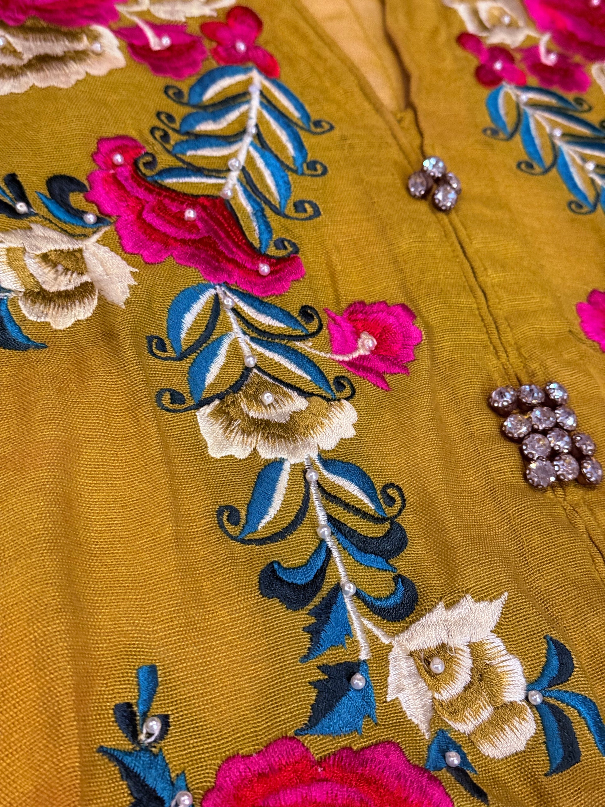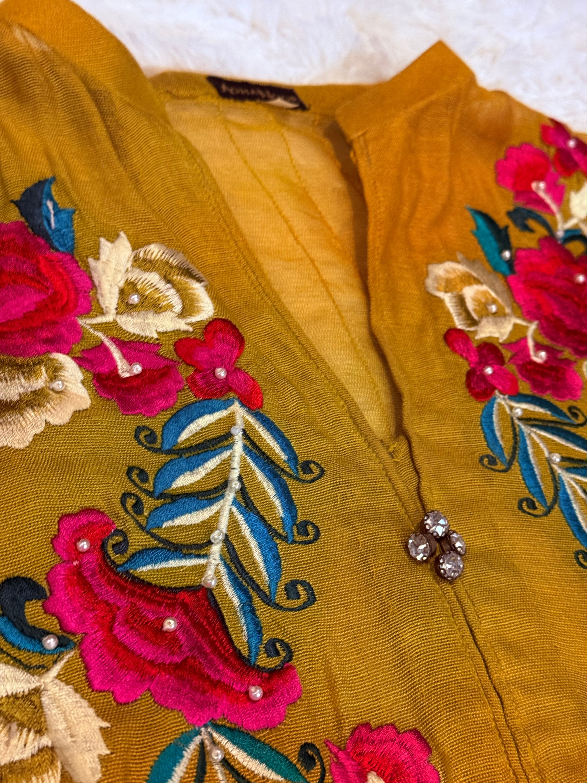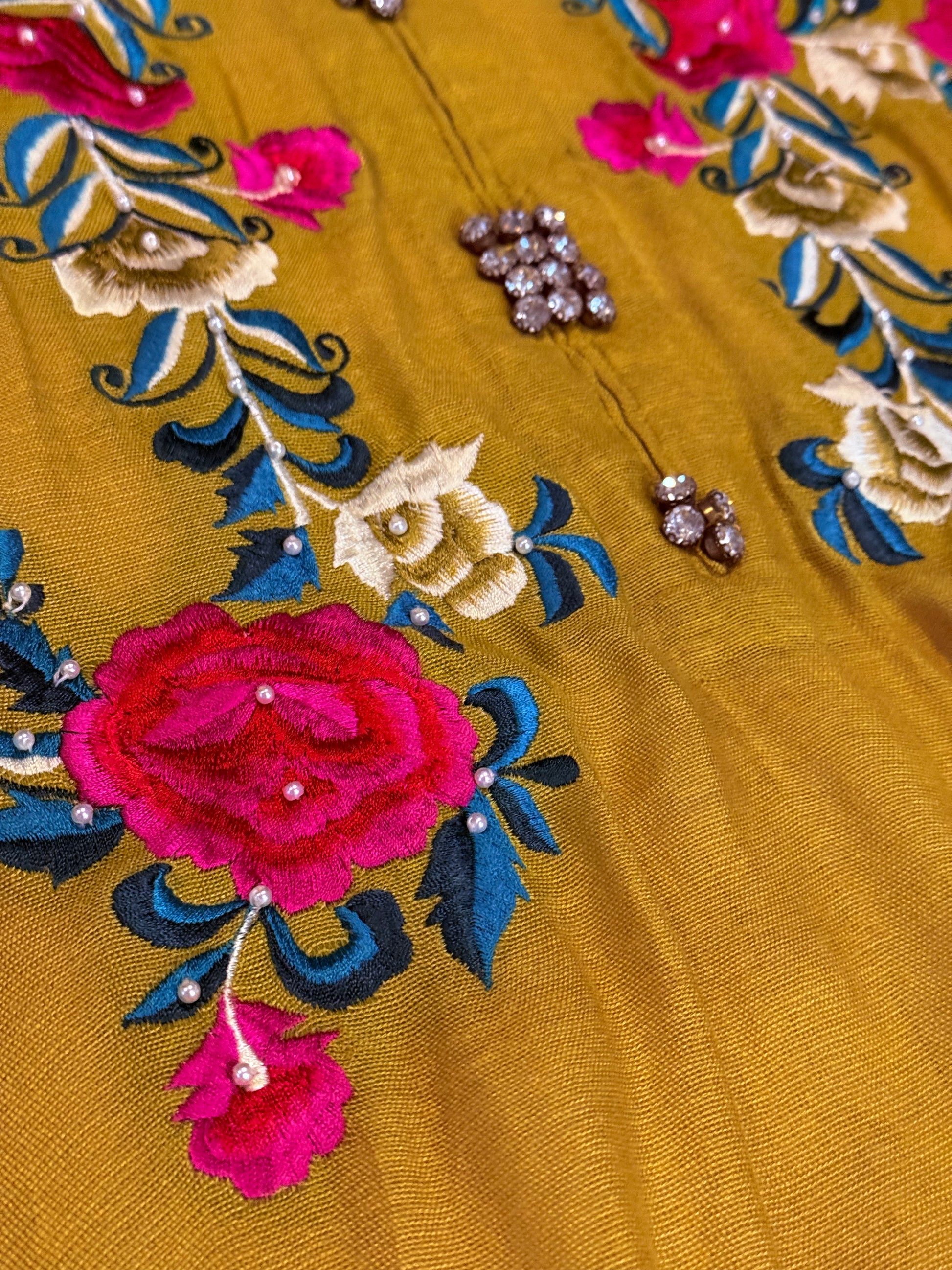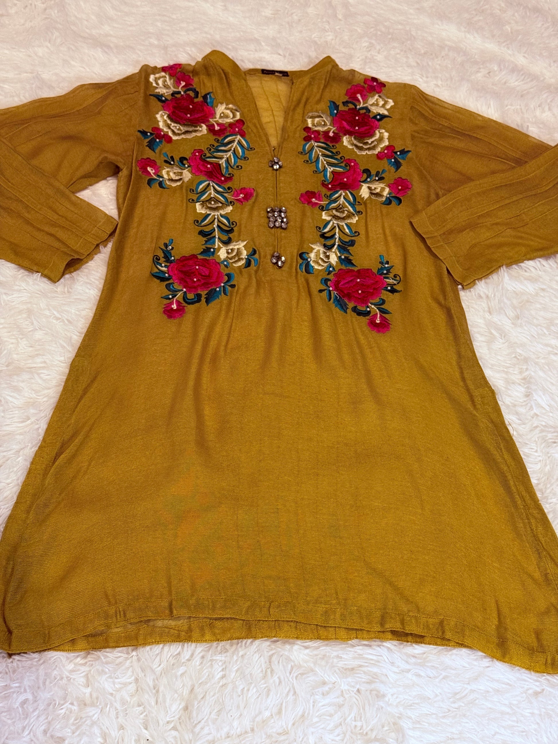 Mustard color shirt with magenta, teal and blue embroidery. Does not come with inner. Can be paired with white bottoms.