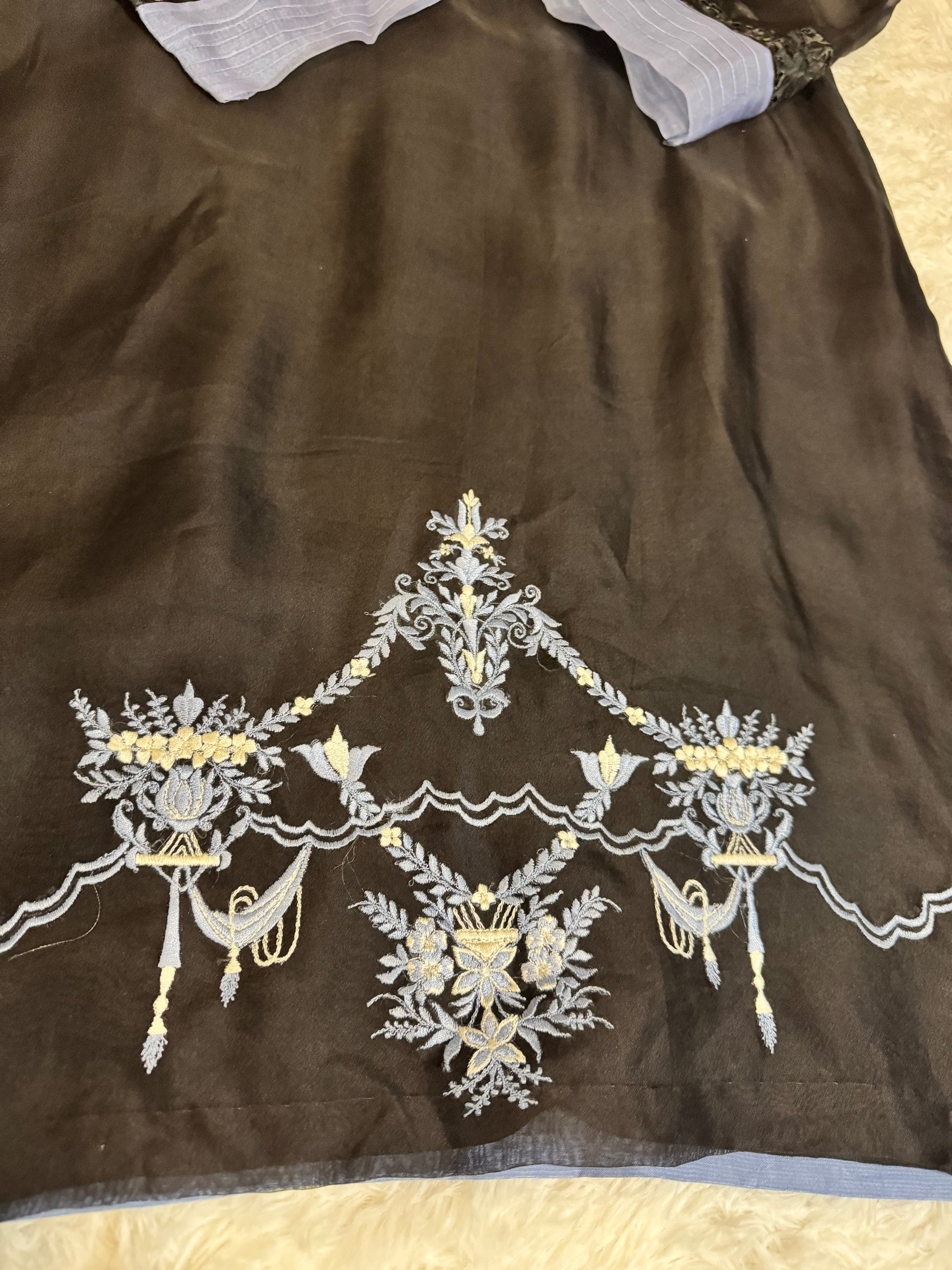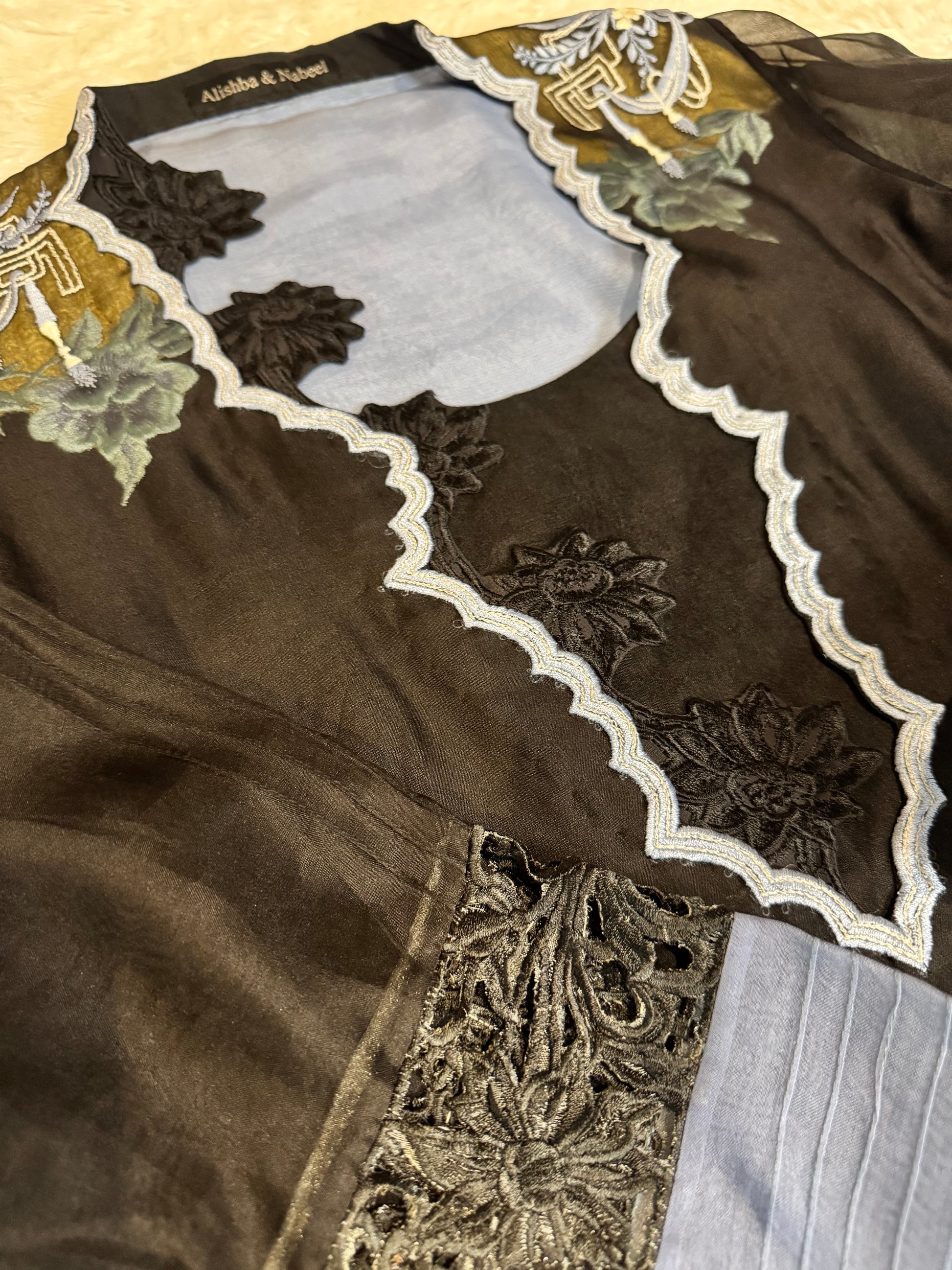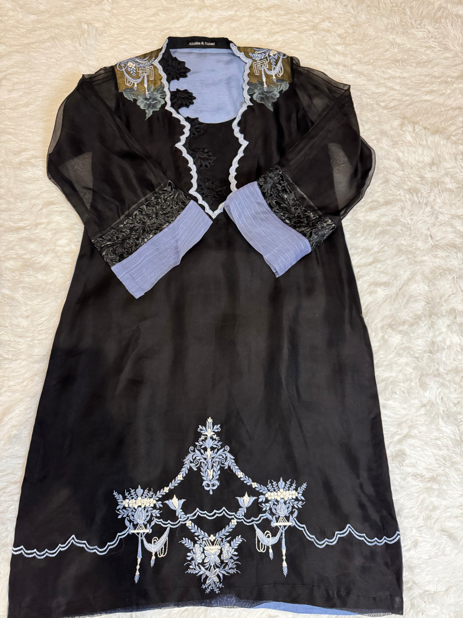 Alishba & Nabeel Silk Shirt with Embroidery and contrasting blue lining. Sleeves are made of organza with trim.