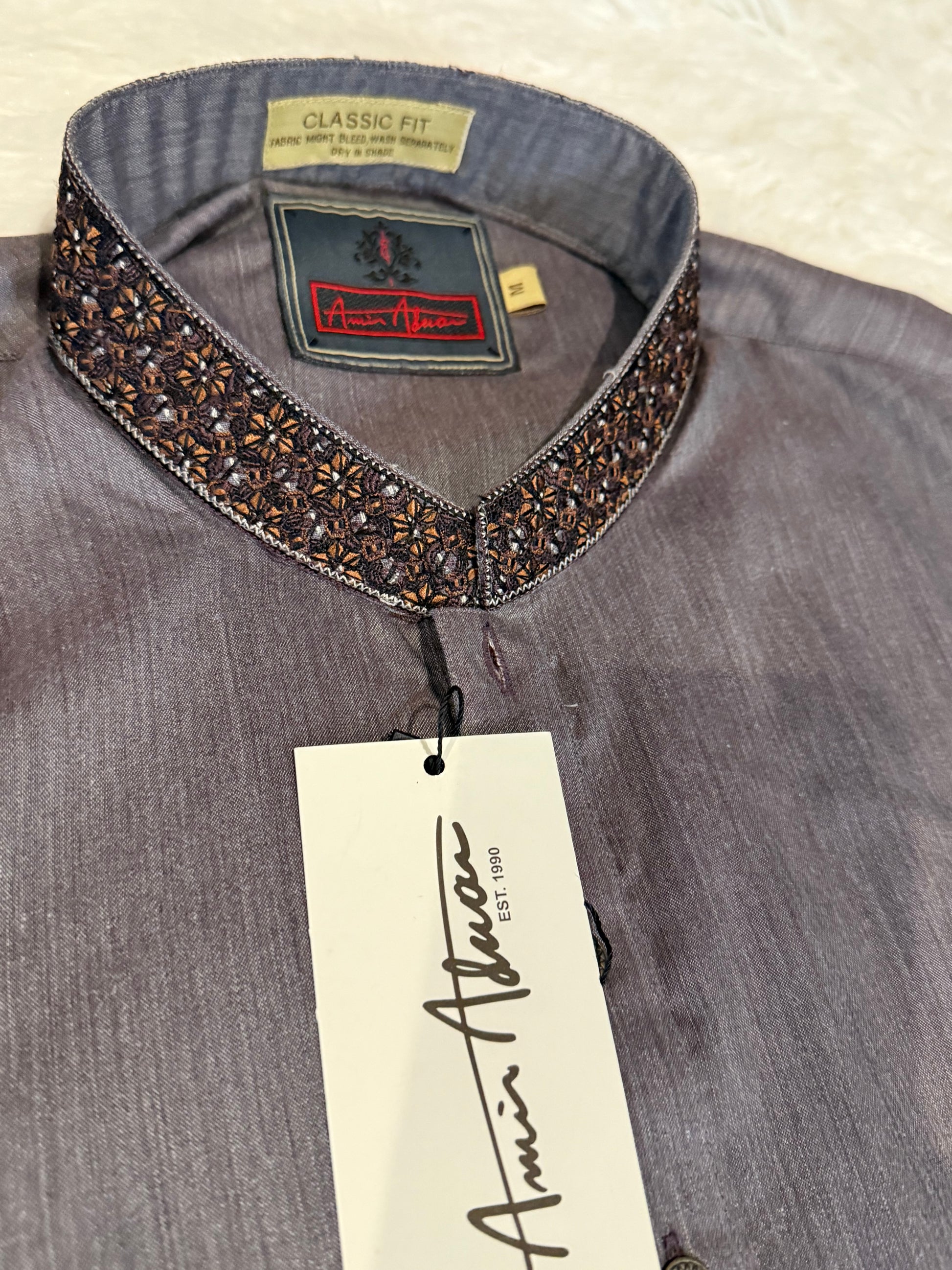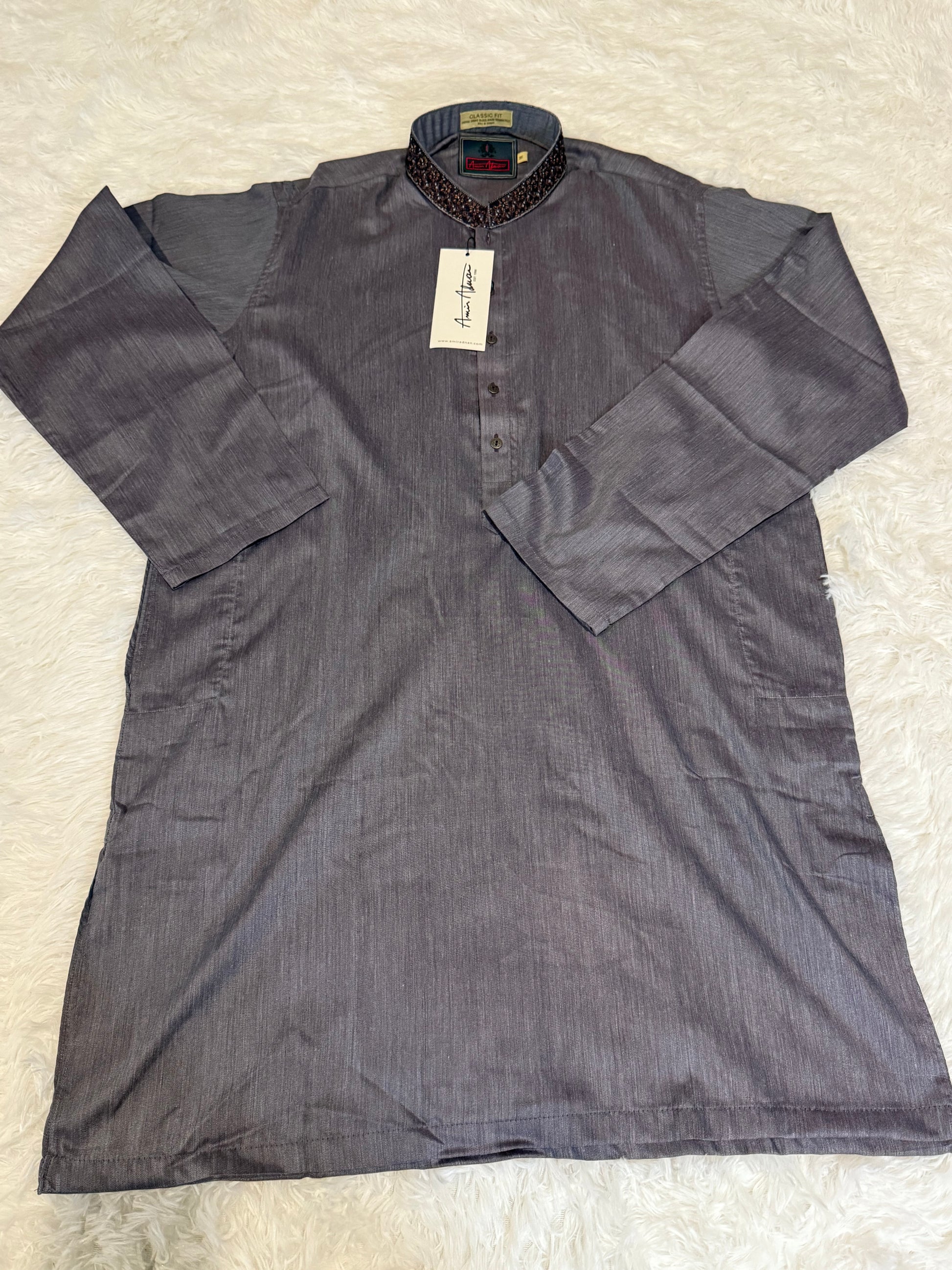 Amir Adnan Gray/Blue Kurta with Embroidered Collar.