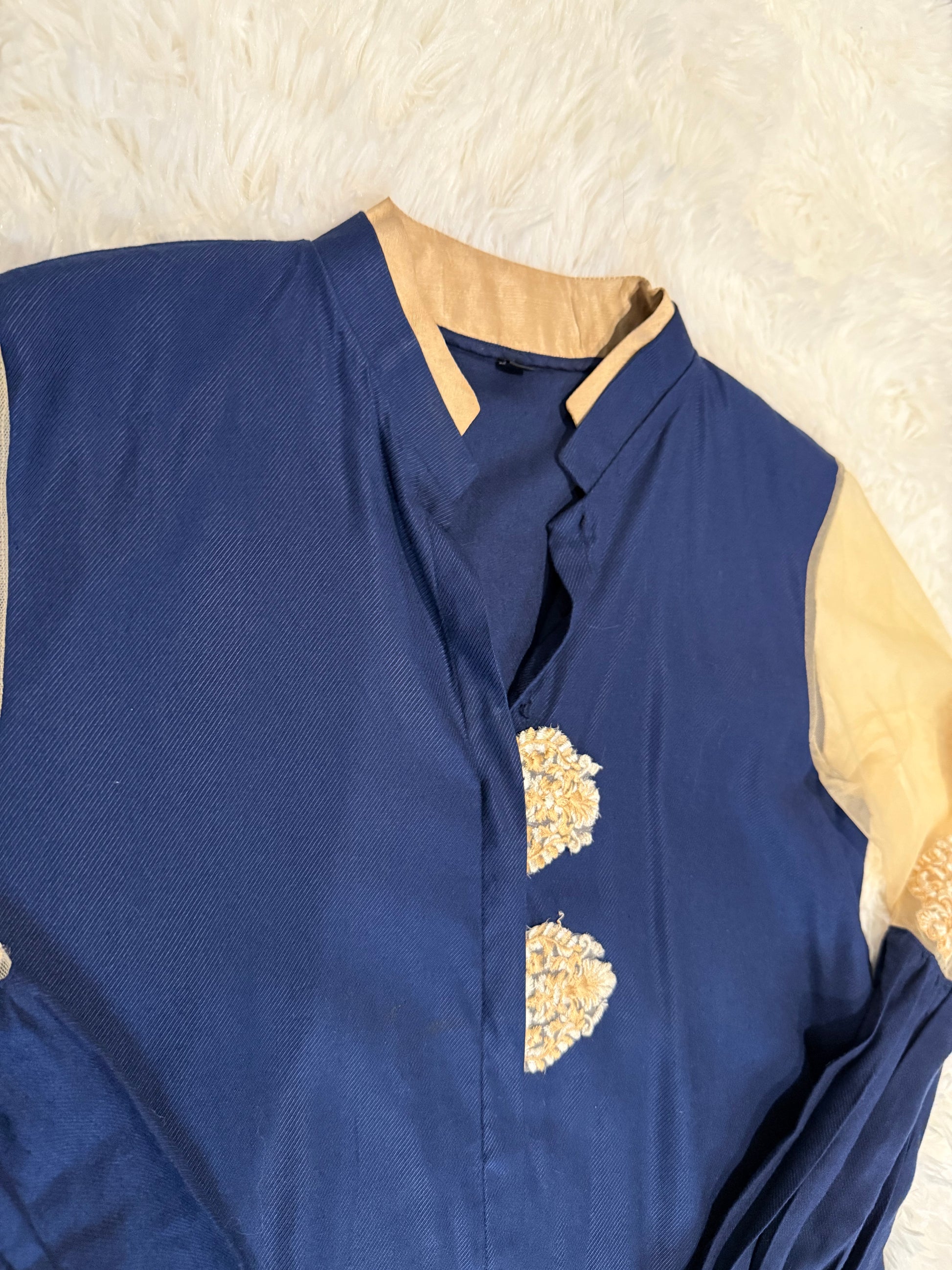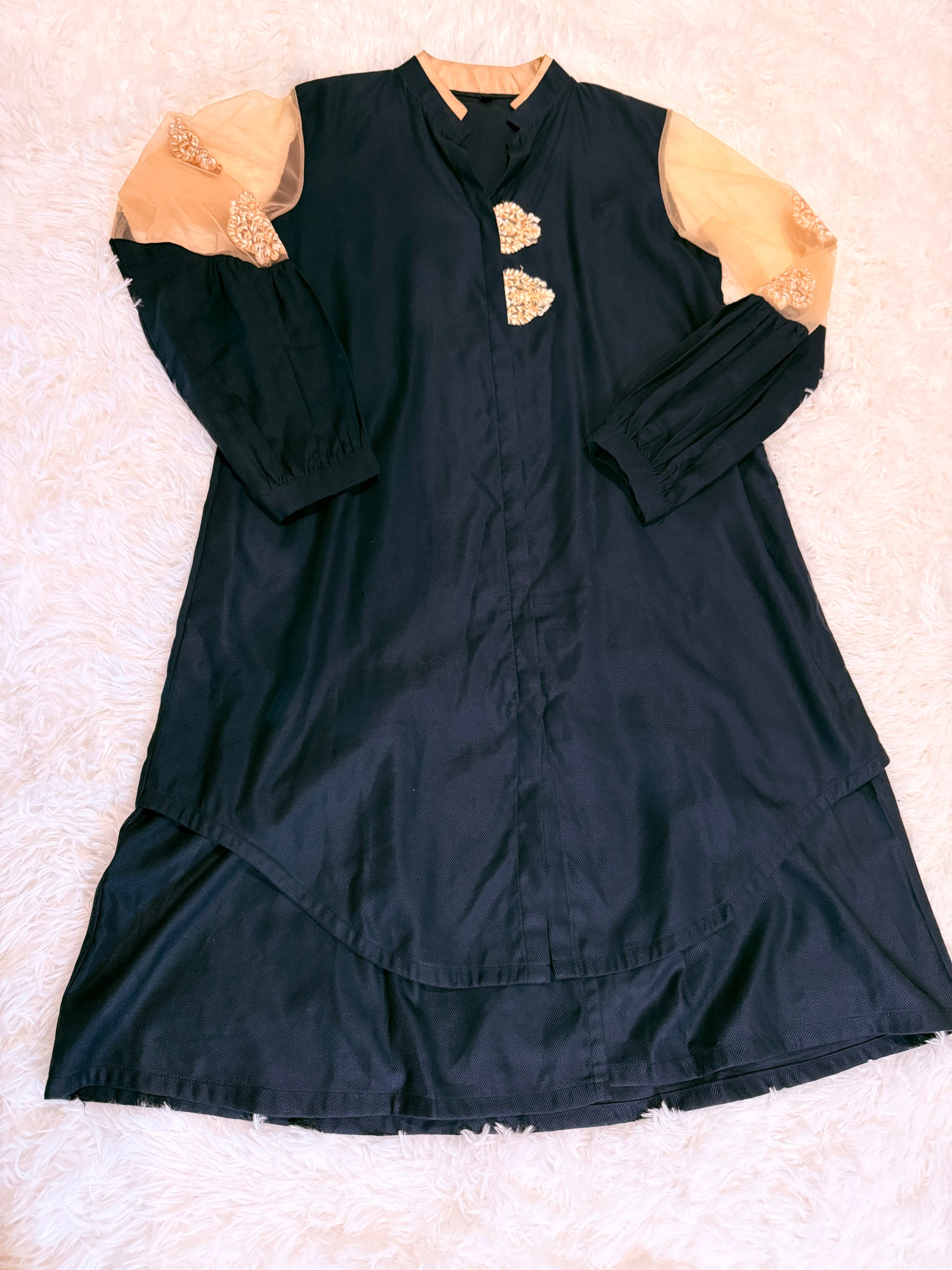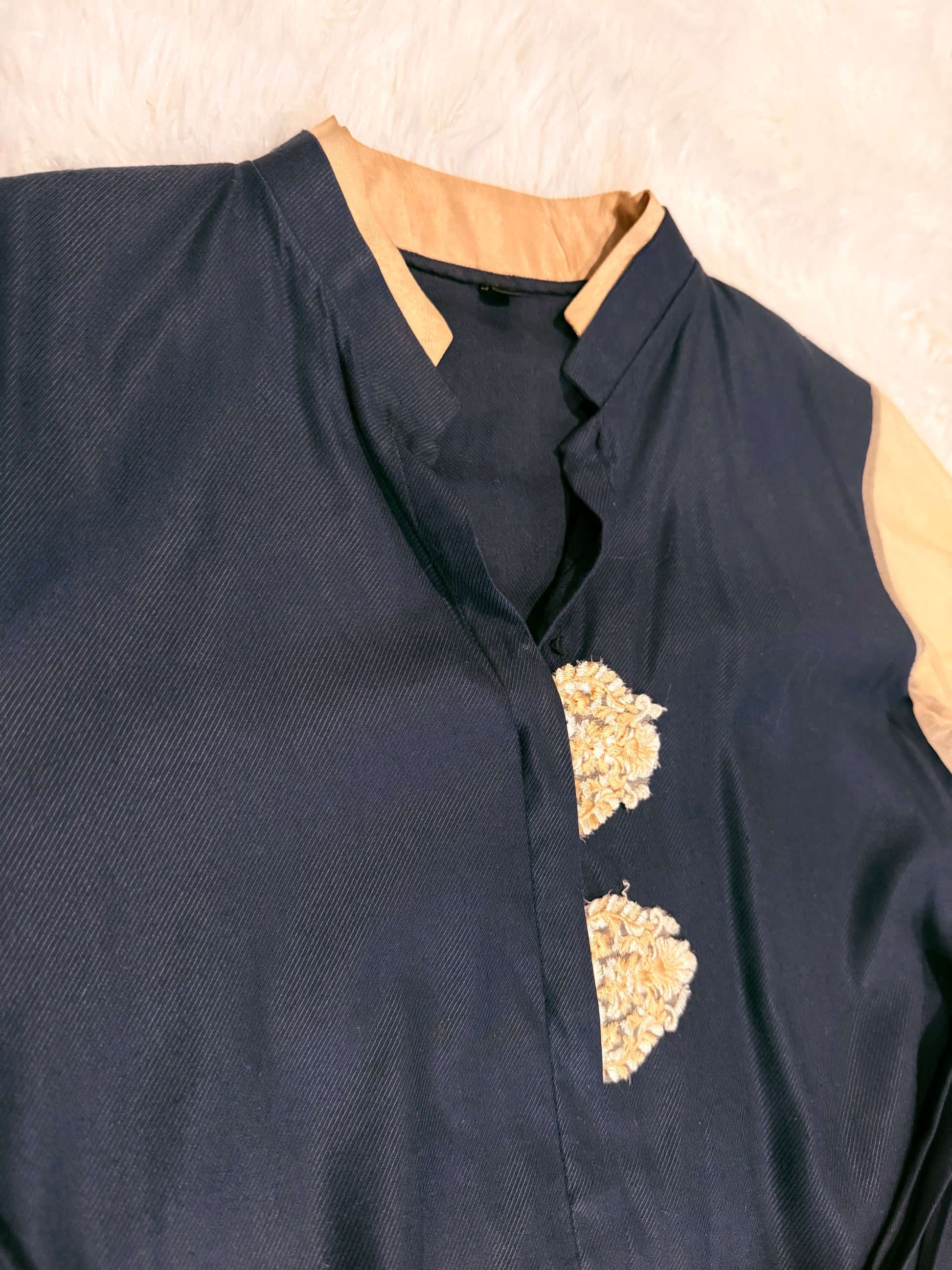 Asifa Nabeel Navy overlap style shirt with Golden Brown Embroidery and Half Lace Sleeves