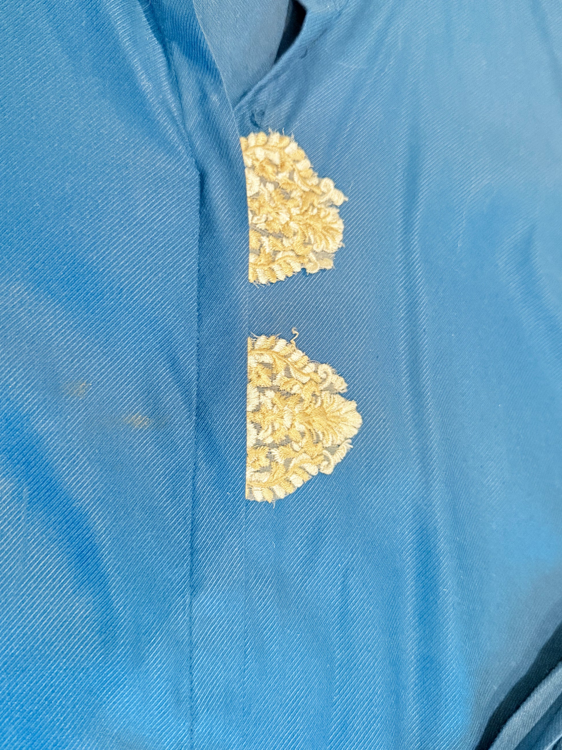Shirt with golden brown detailing and collar and lace sleeves with additional golden brown embroidery. Shirt is thick material good for colder weather.