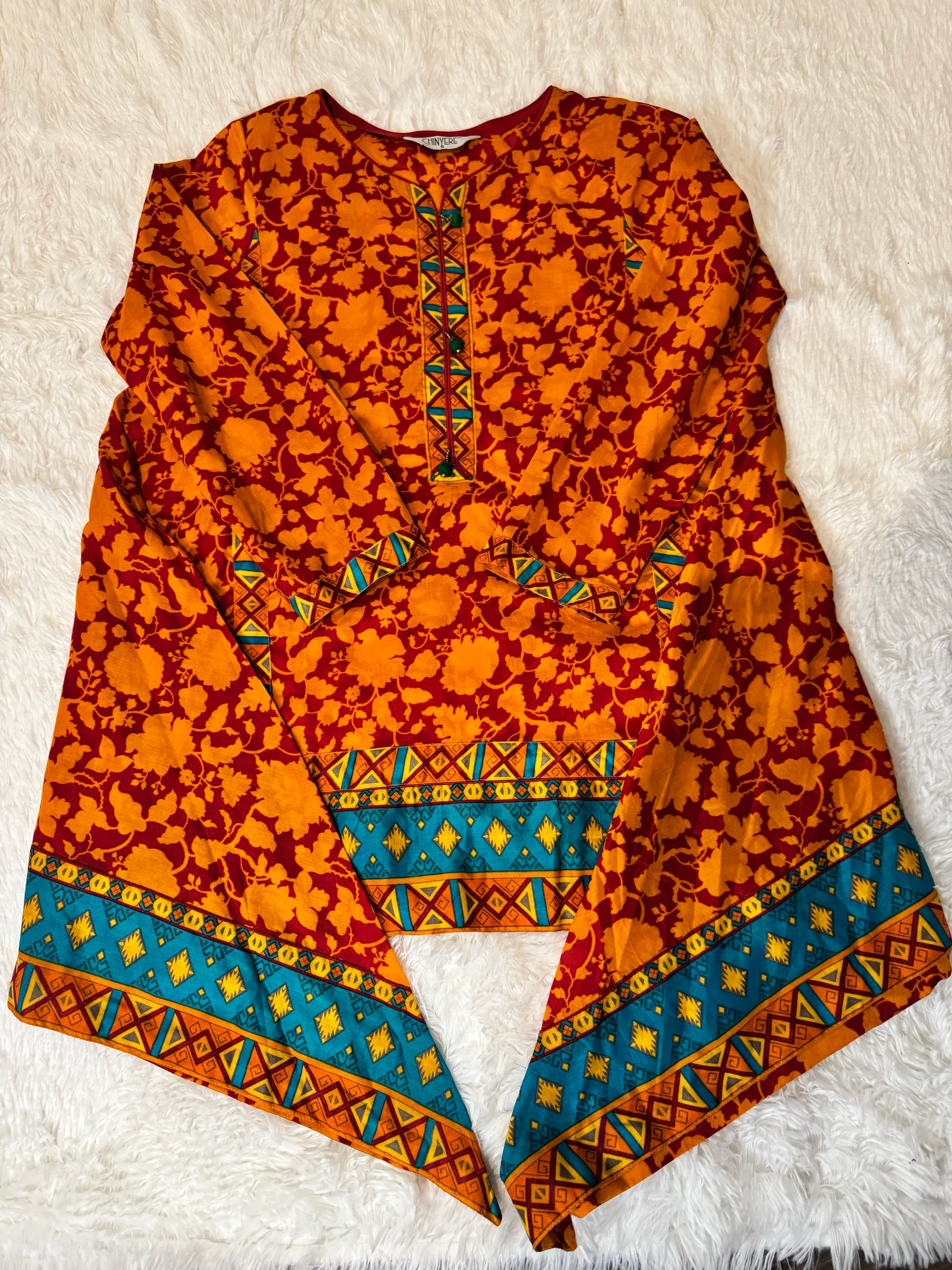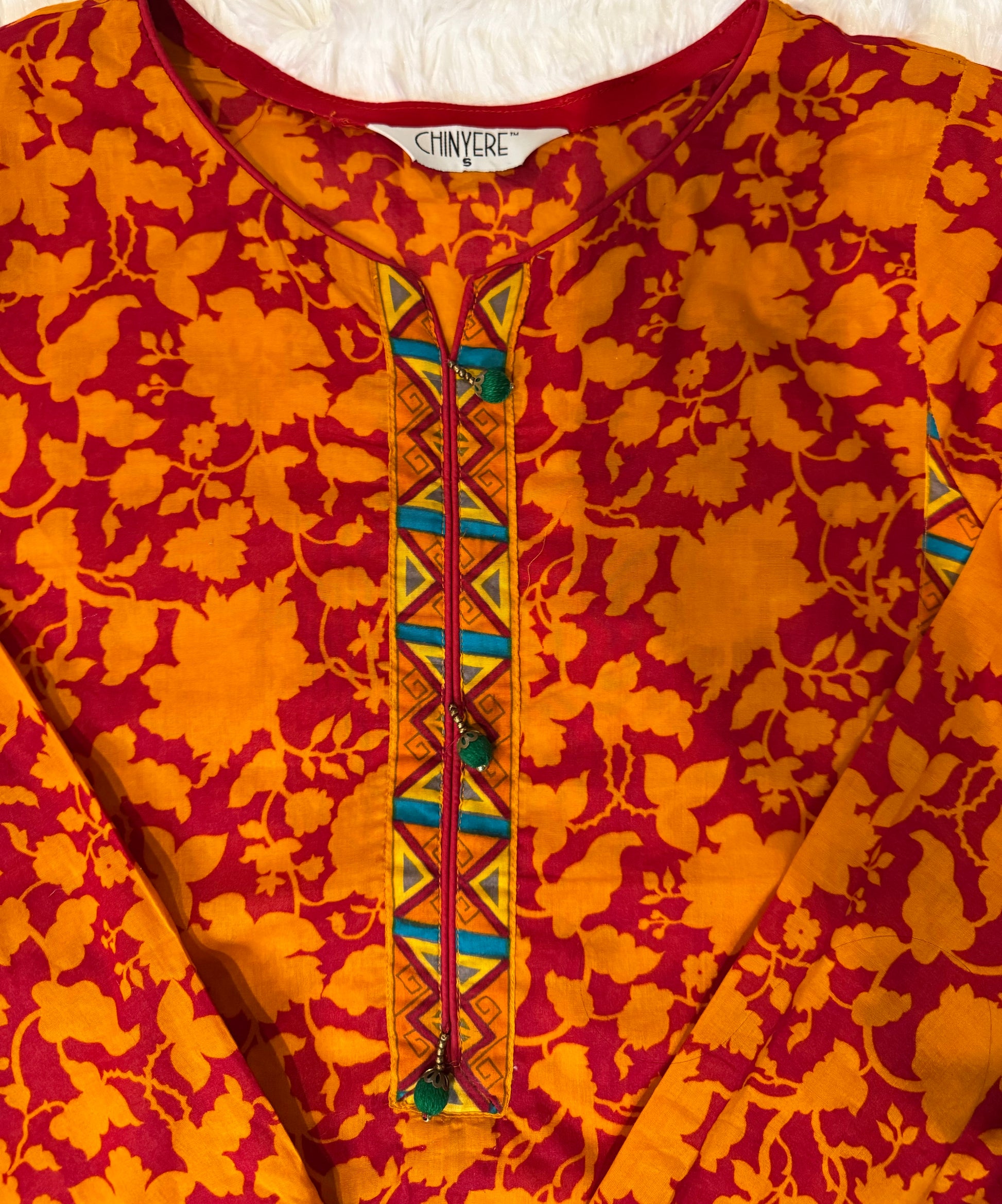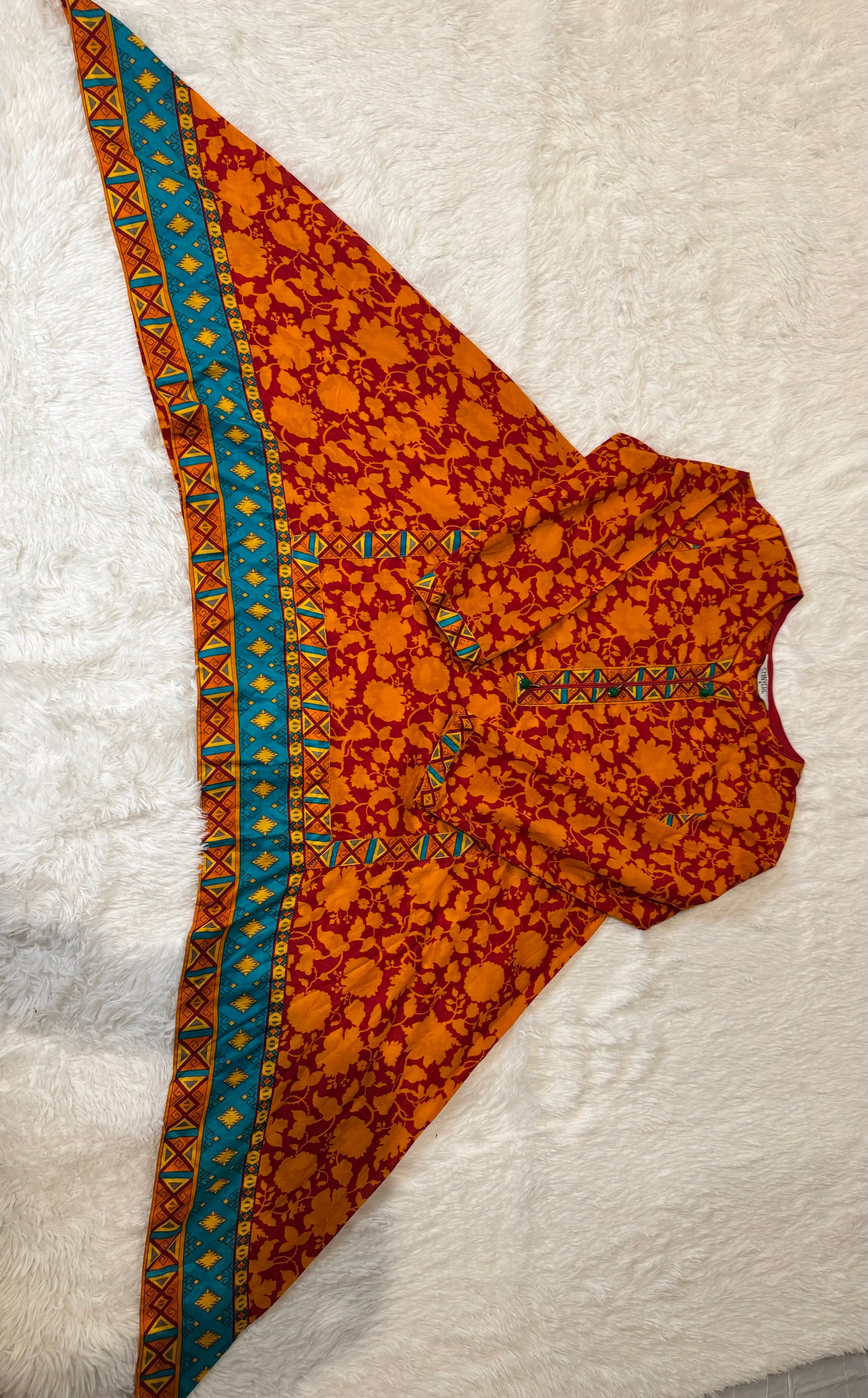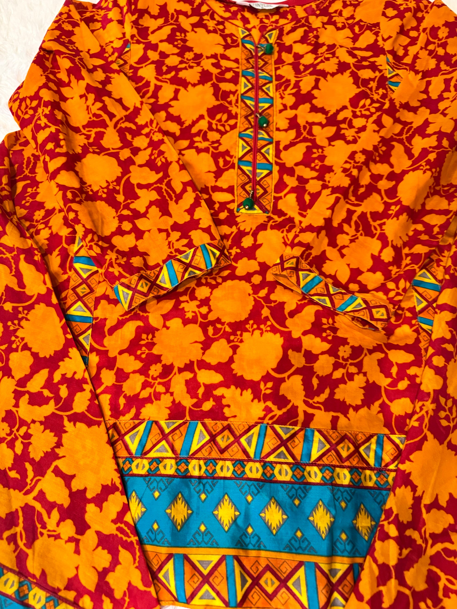 Orange Cotton Kurta with Turquoise contrast by Chinyere with button embellishments on collar.