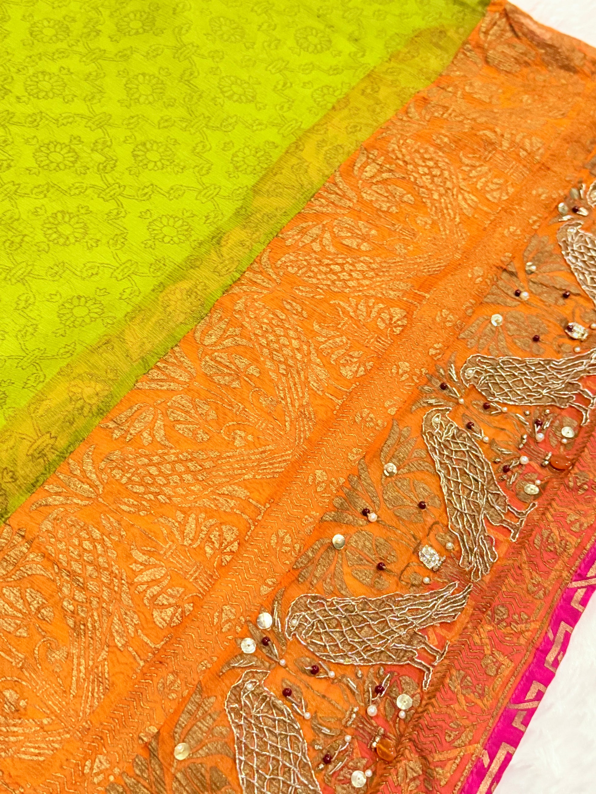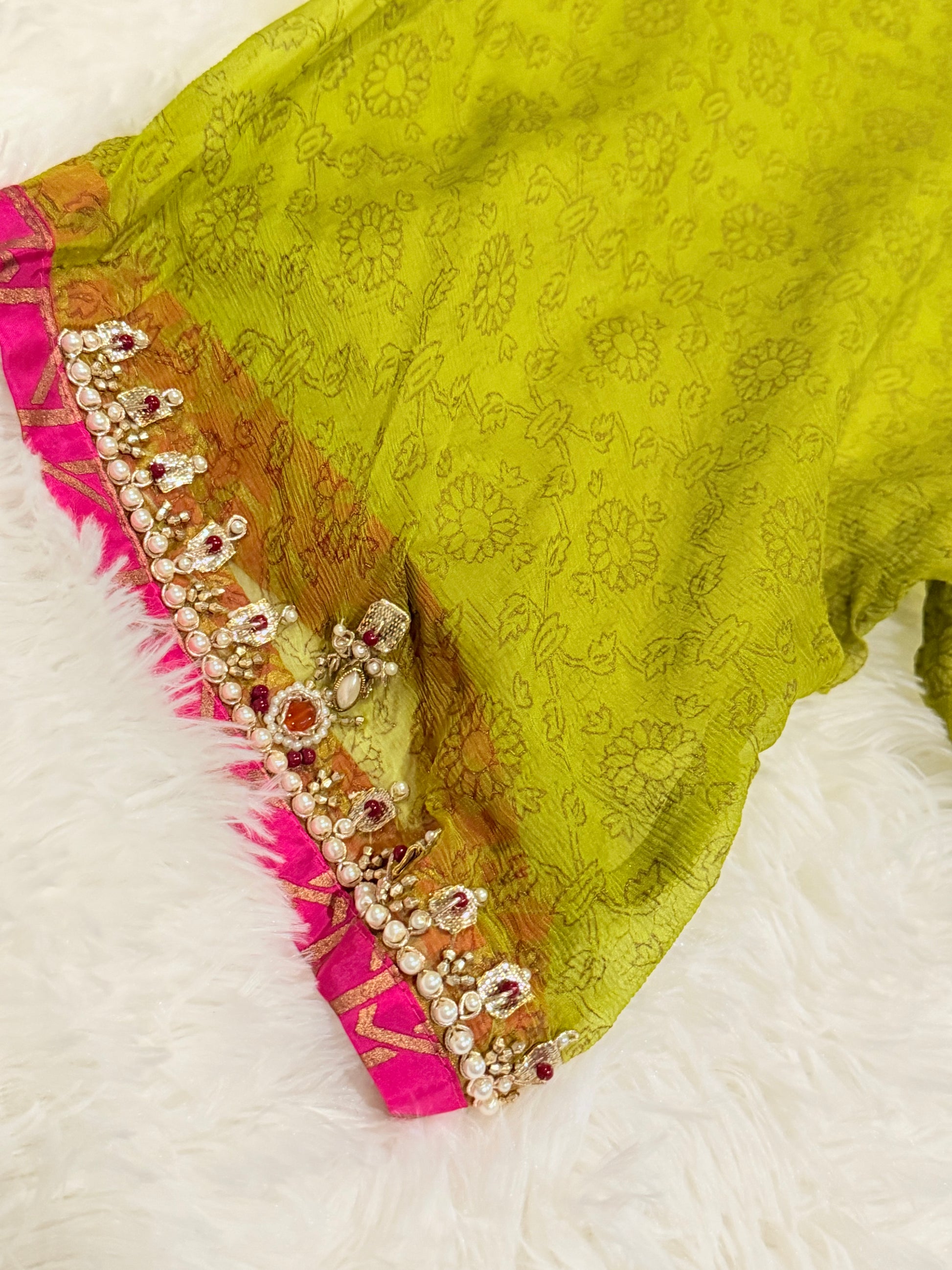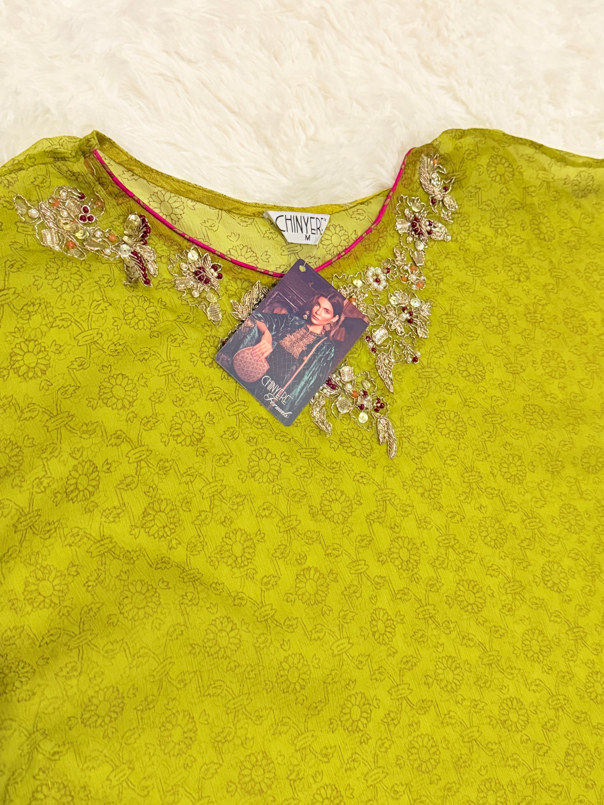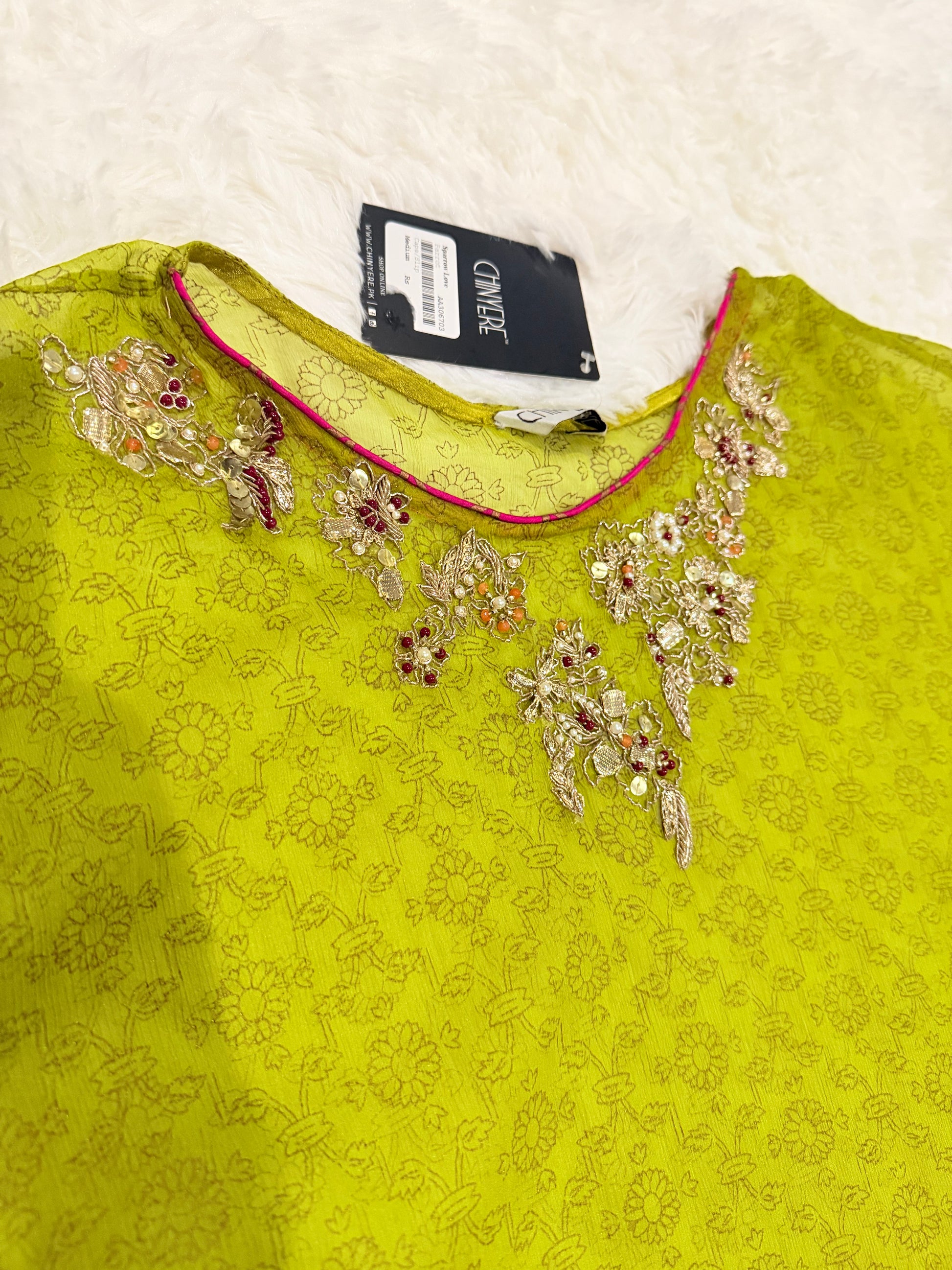 Chinyere Kurta style Formal shirt with Metallic Work and Sequins in Lime Green Color with Pink and Orange contrast.