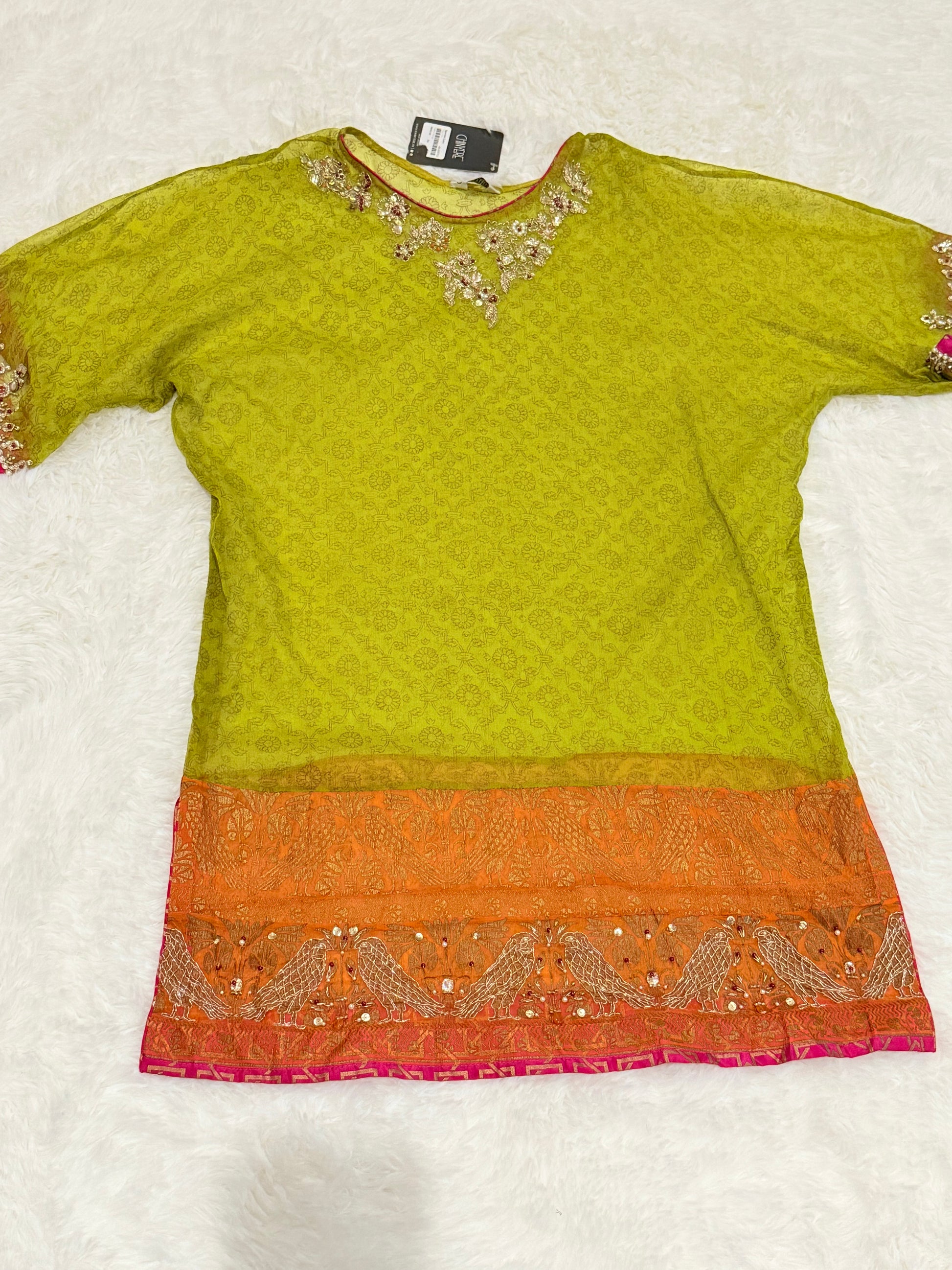 Perfect outfit for a dholki, mehendi function, can be paired with golden or matching bottoms to create the perfect look. Style of shirt is kurta/box cut so it is wide fitting.