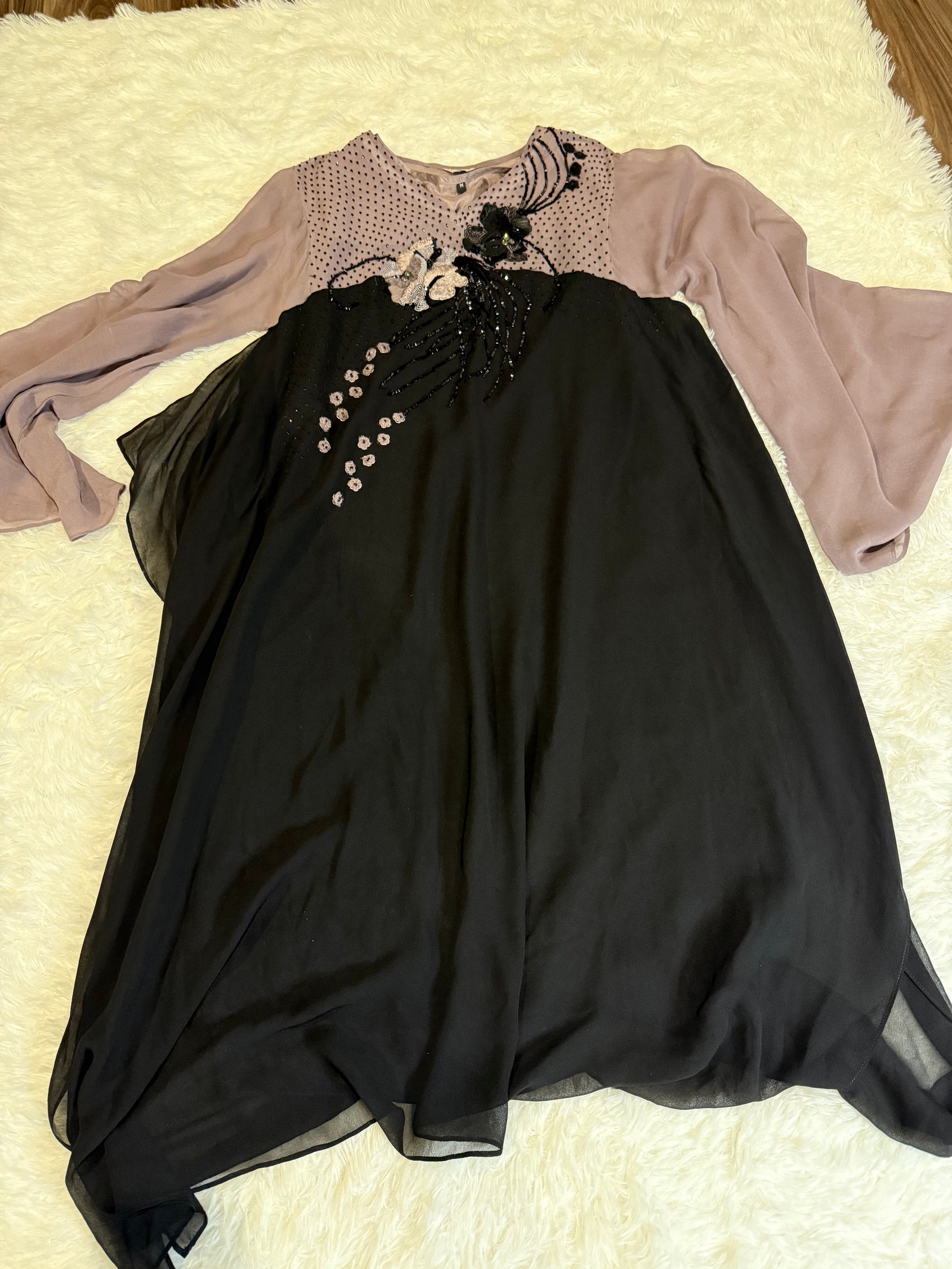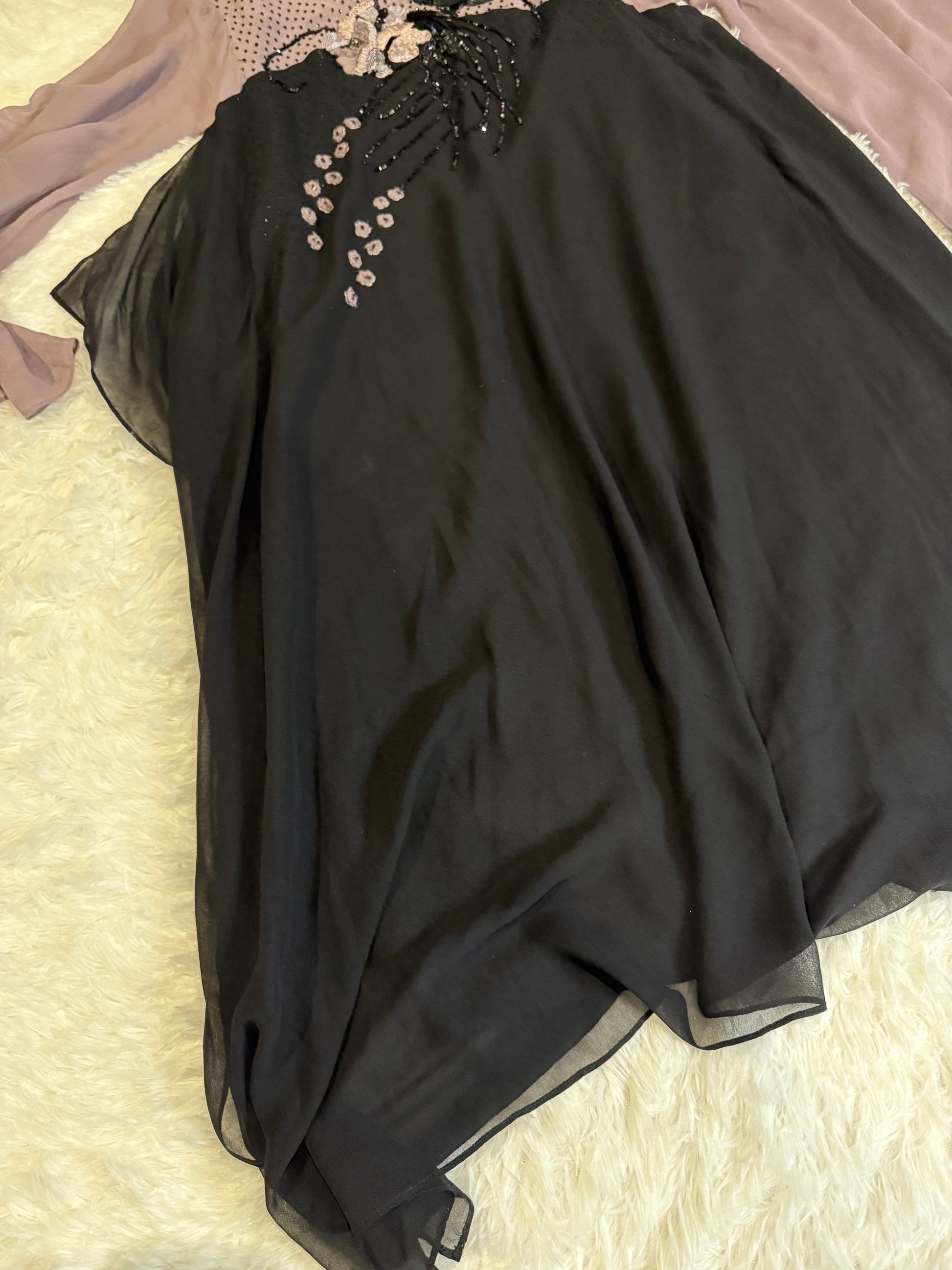 Chinyere Georgette Kameez (Poncho style) with Beautiful Purple and Black Embroidery & Sequins. Shirt has asymmetric drop hem style and beautiful long bell sleeves. Comes paired with 2 tone slip.