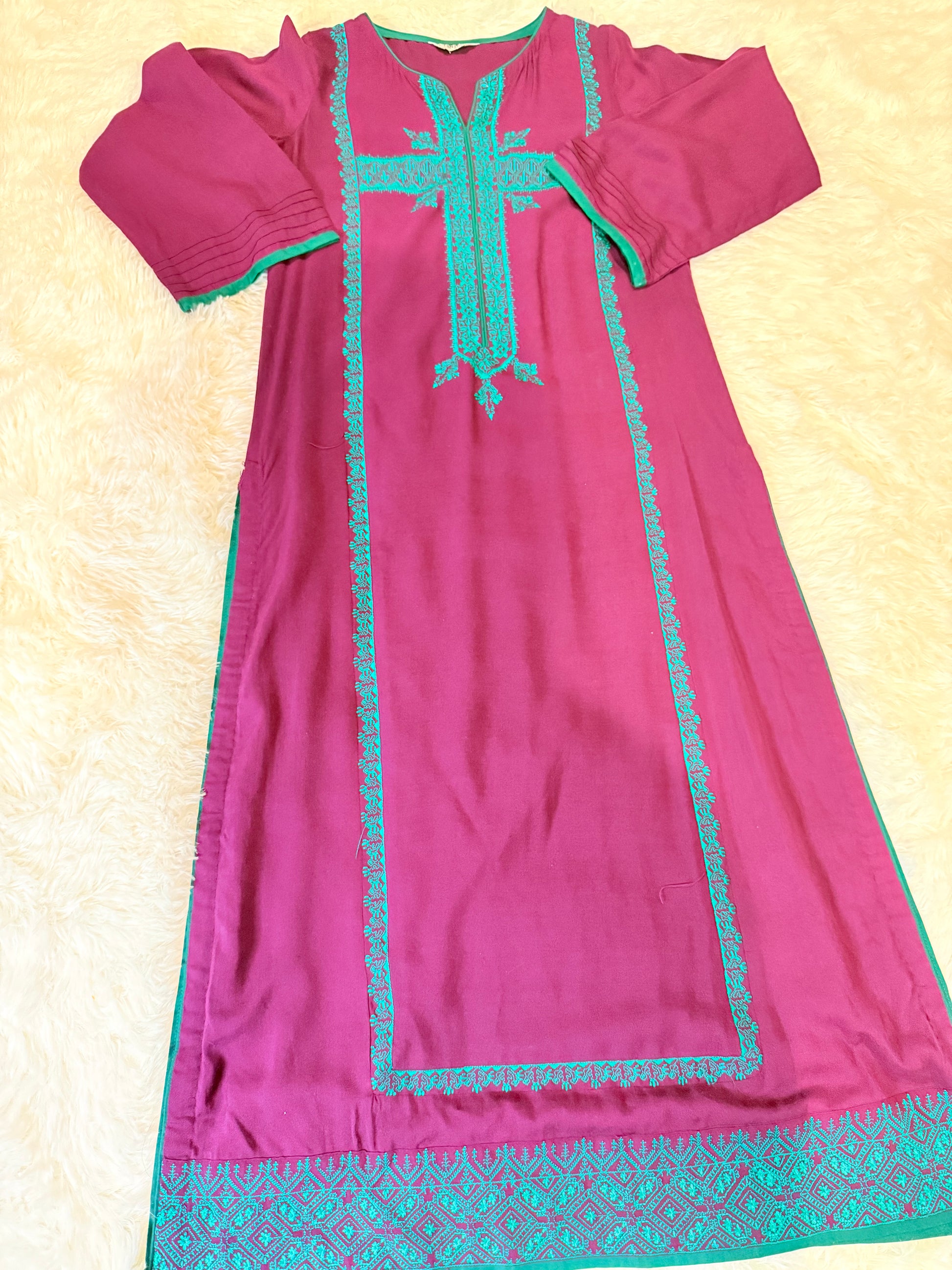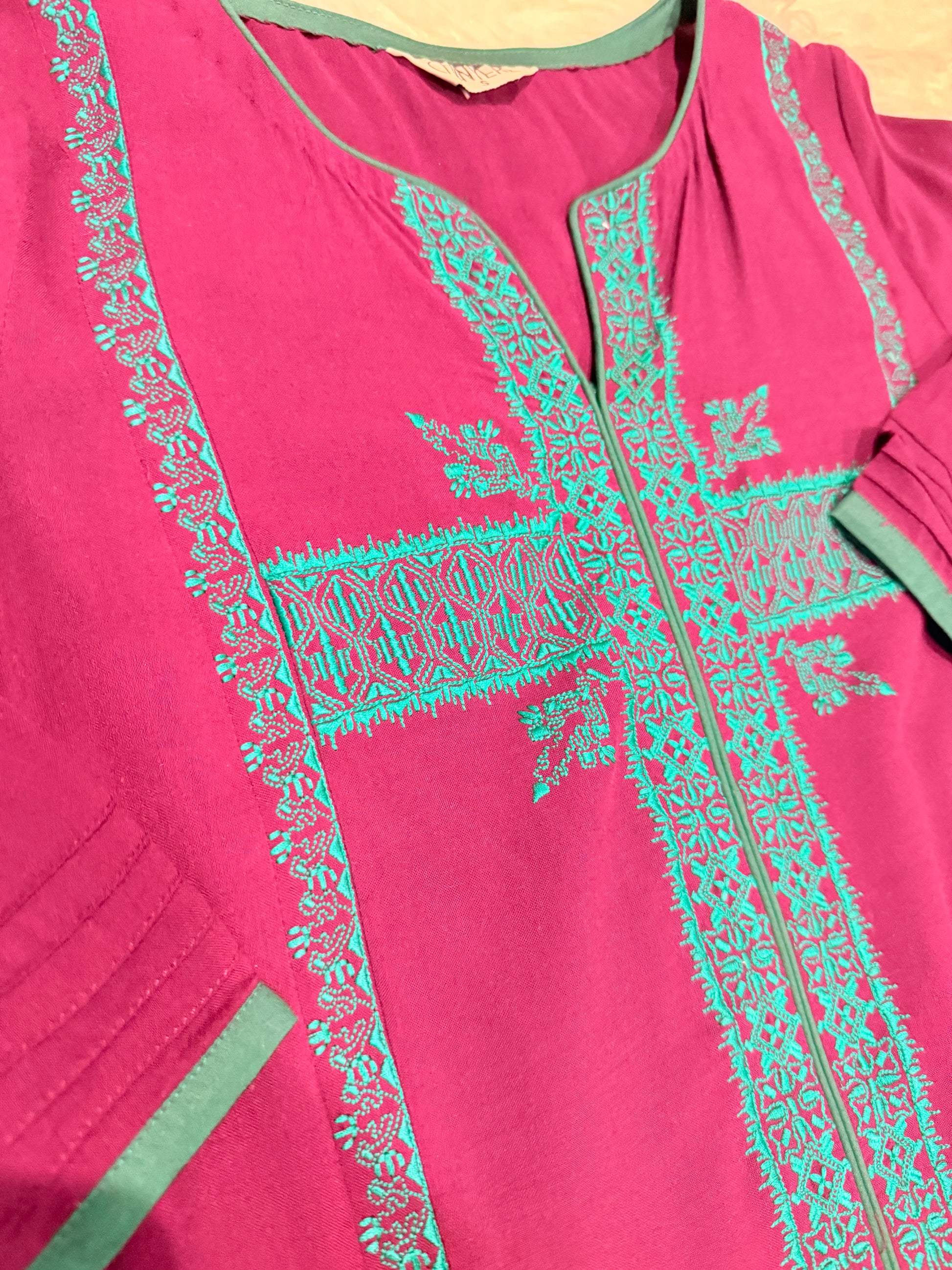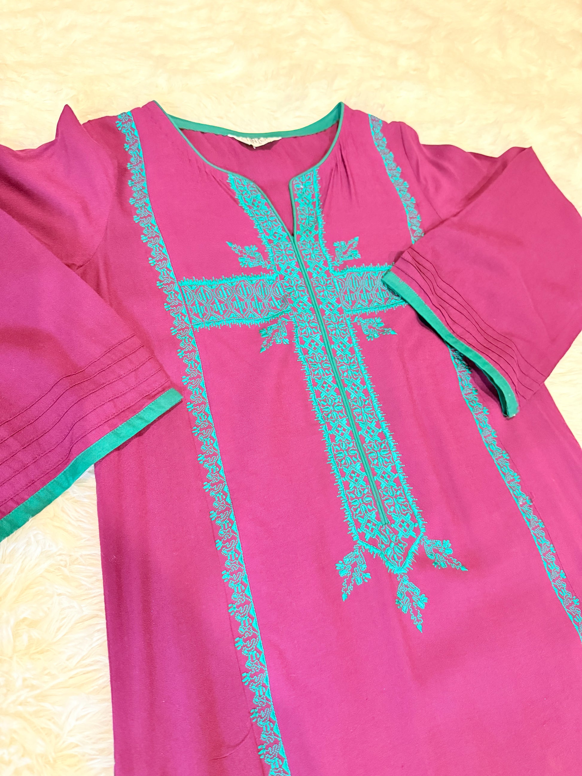 Long Kaaftan style shirt. Soft cotton material. Color is darker than in pictures, more a purple with teal threading. Can be work with leggings or paired with other bottoms.