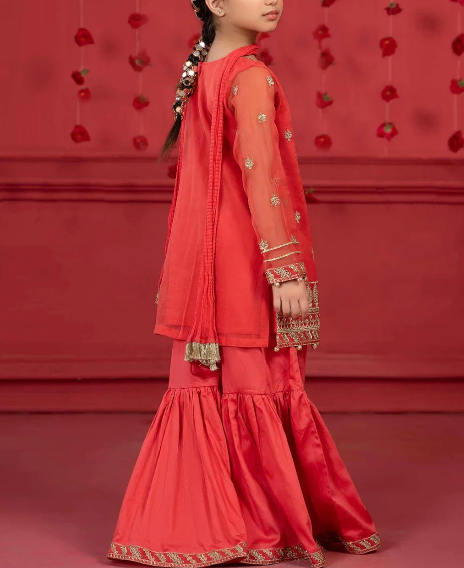 Maria B 3 Piece Embroidered Organza Gharara Suit Coral Pink (Girls), New with Tags