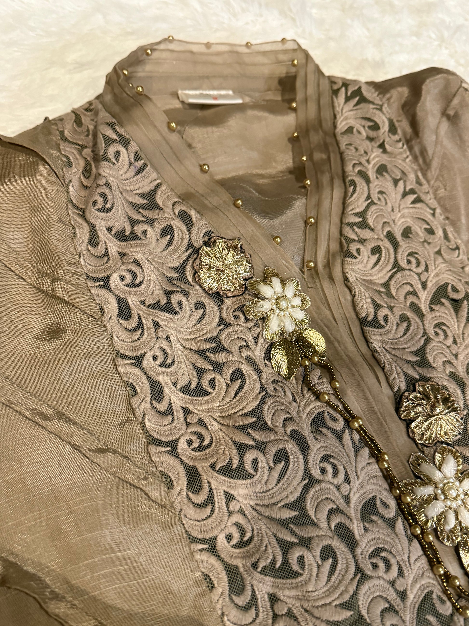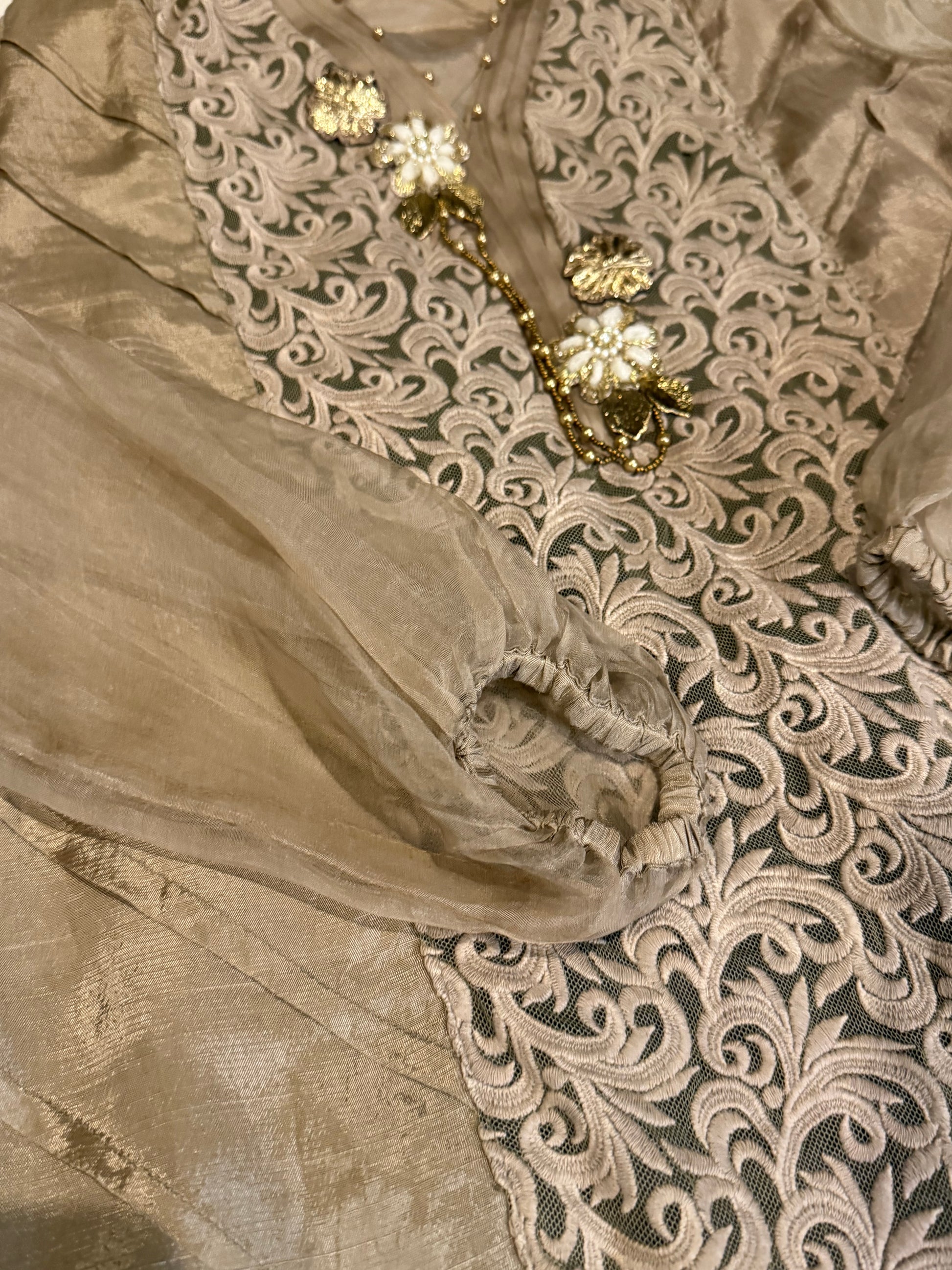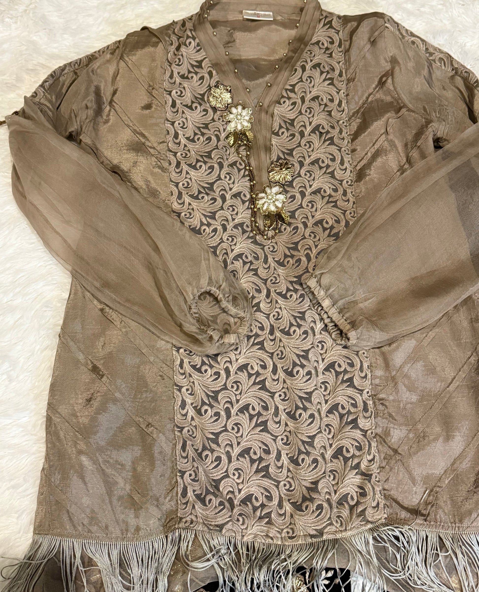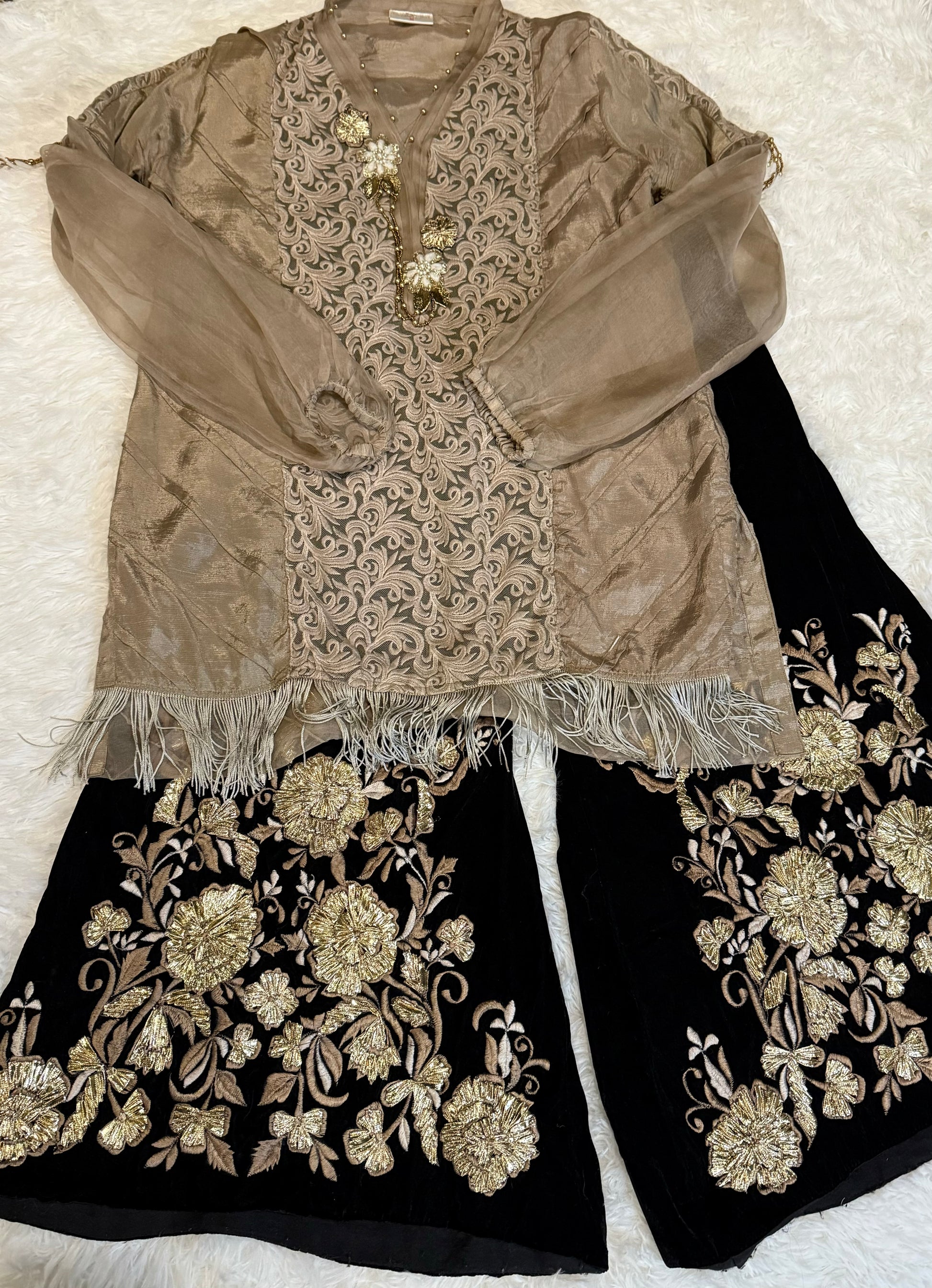 Fusion Chic outfit with shorter shirt paired with Wide Leg Gota and Embroidered thread pants. Elegant and Fancy all in one.