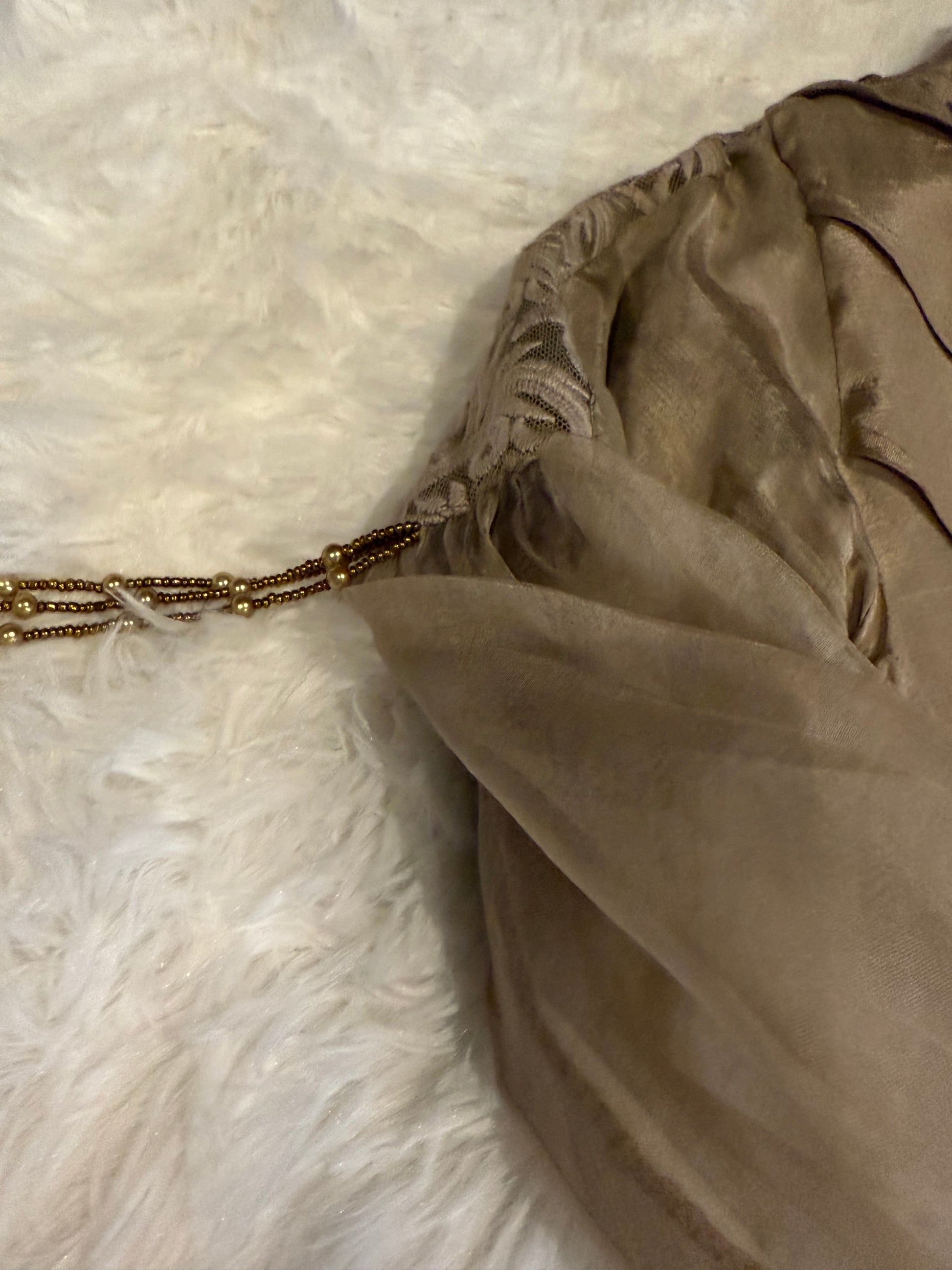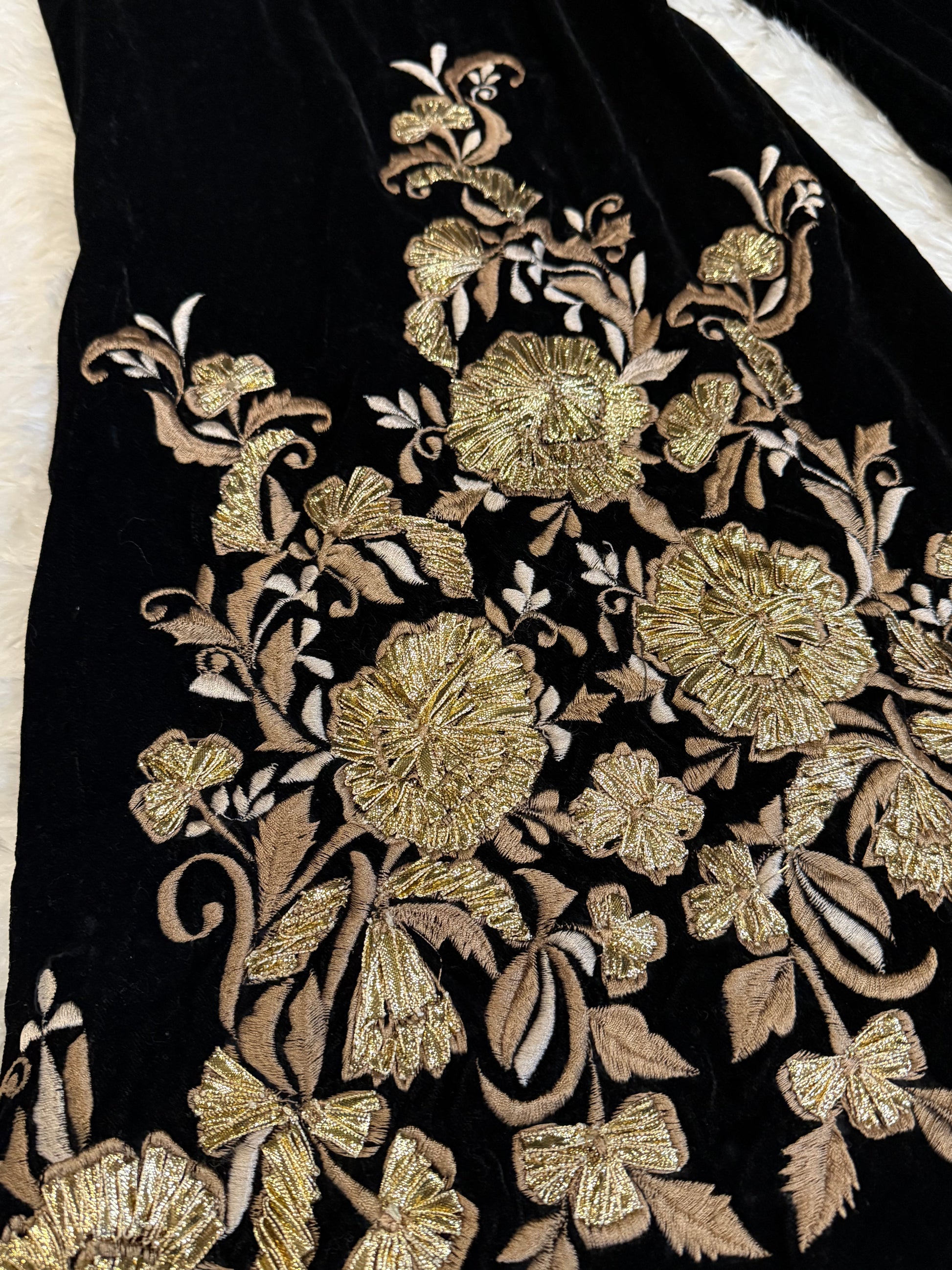 Cotton Ginny Organza and Silk Top with Embellishments with Wide Leg Embroidered Velvet Pants.