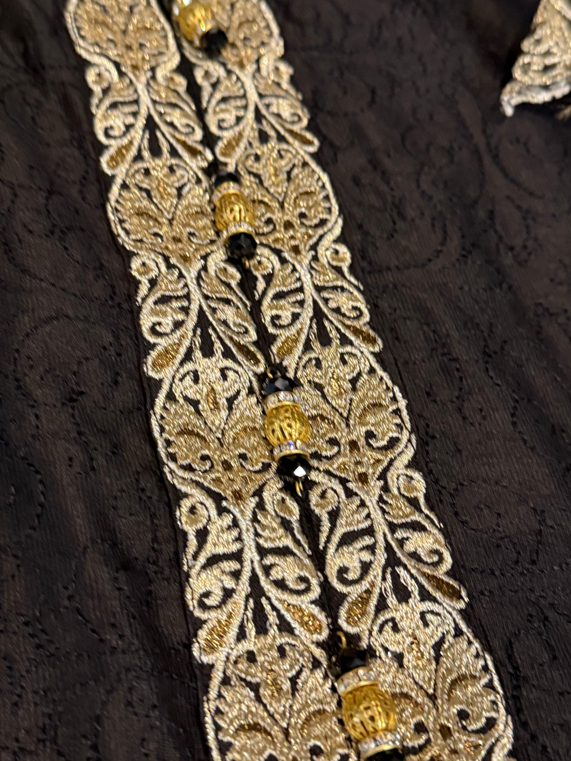 Button accents on front of shirt. Self-printed shirt.