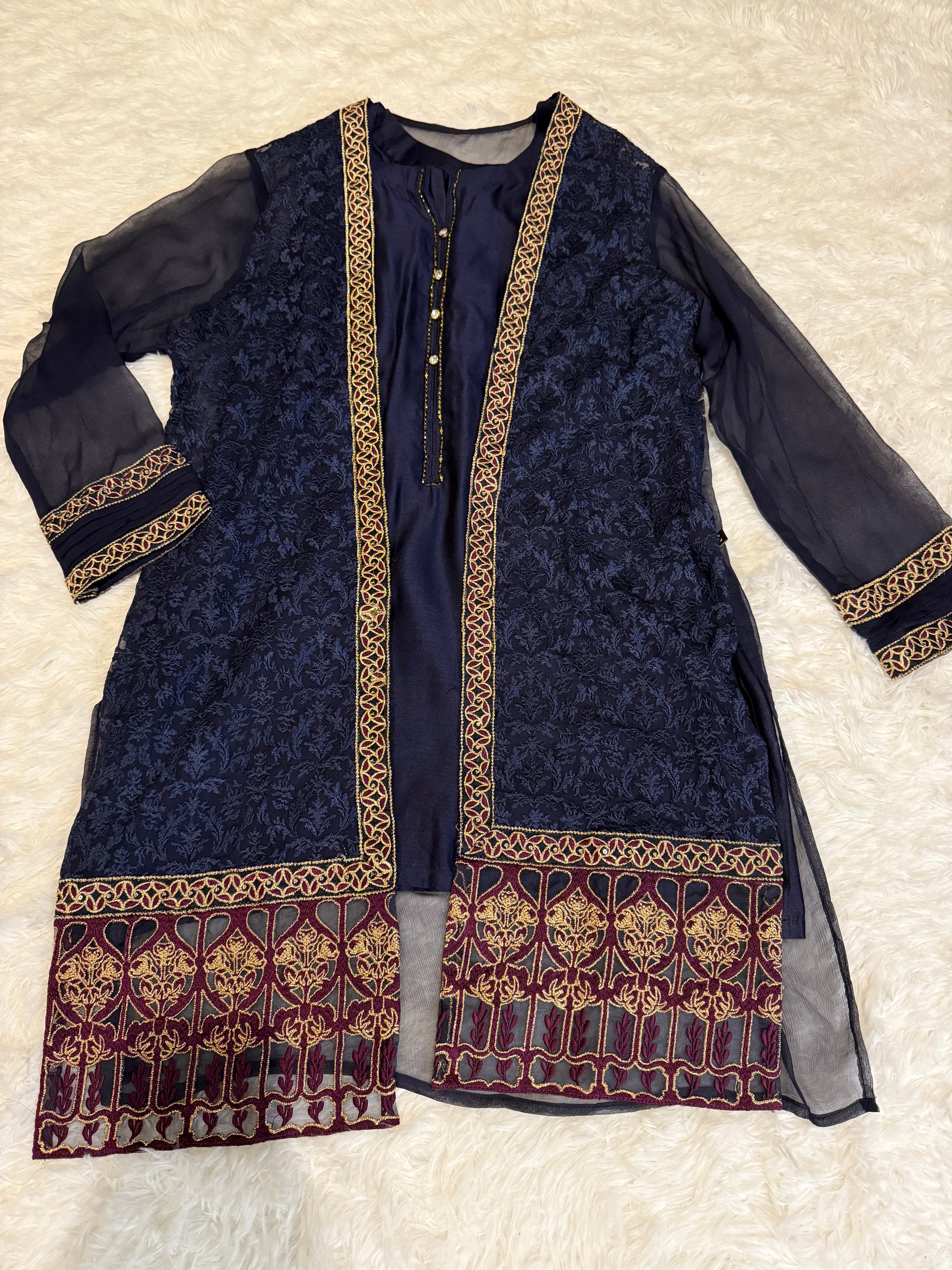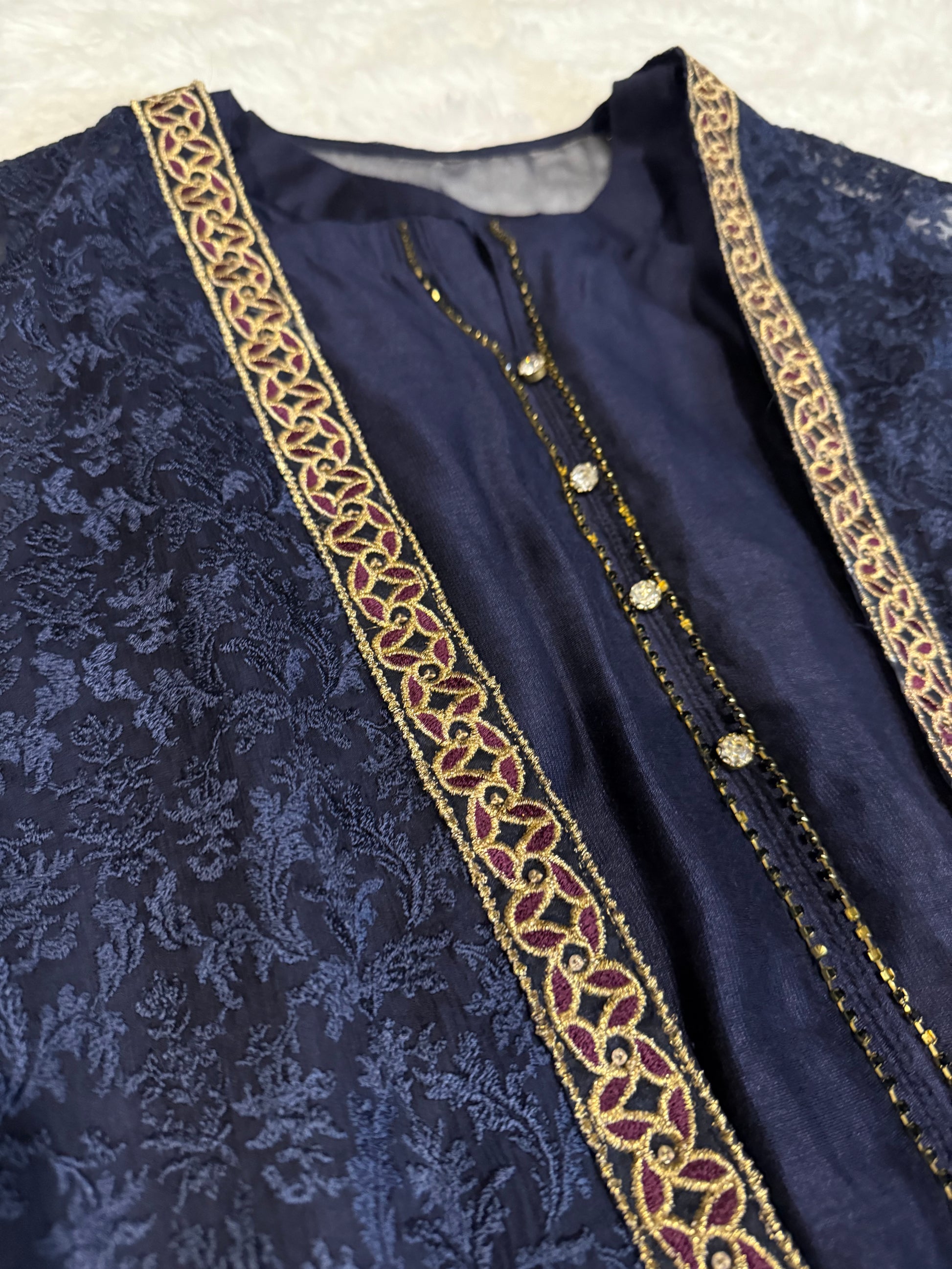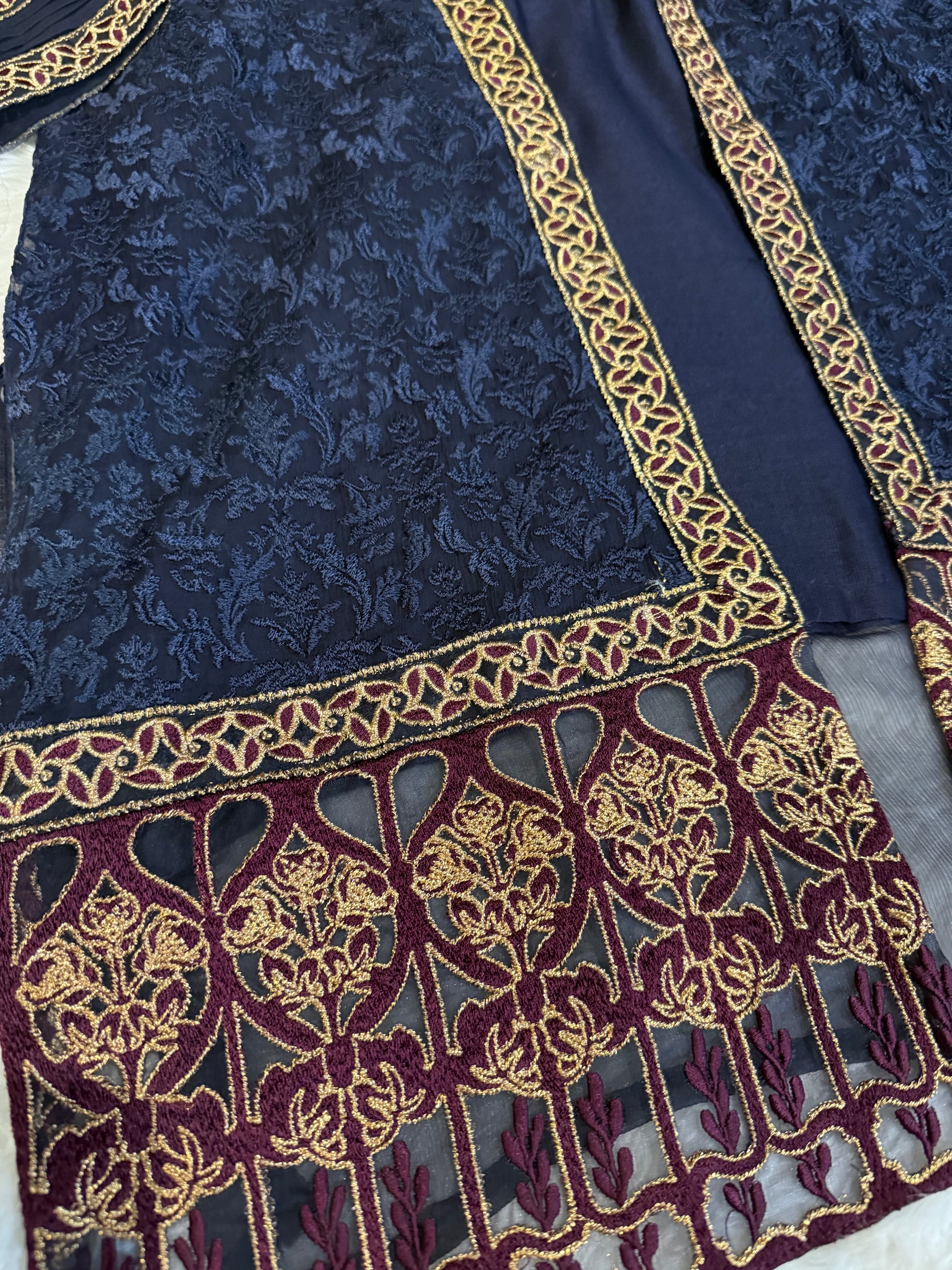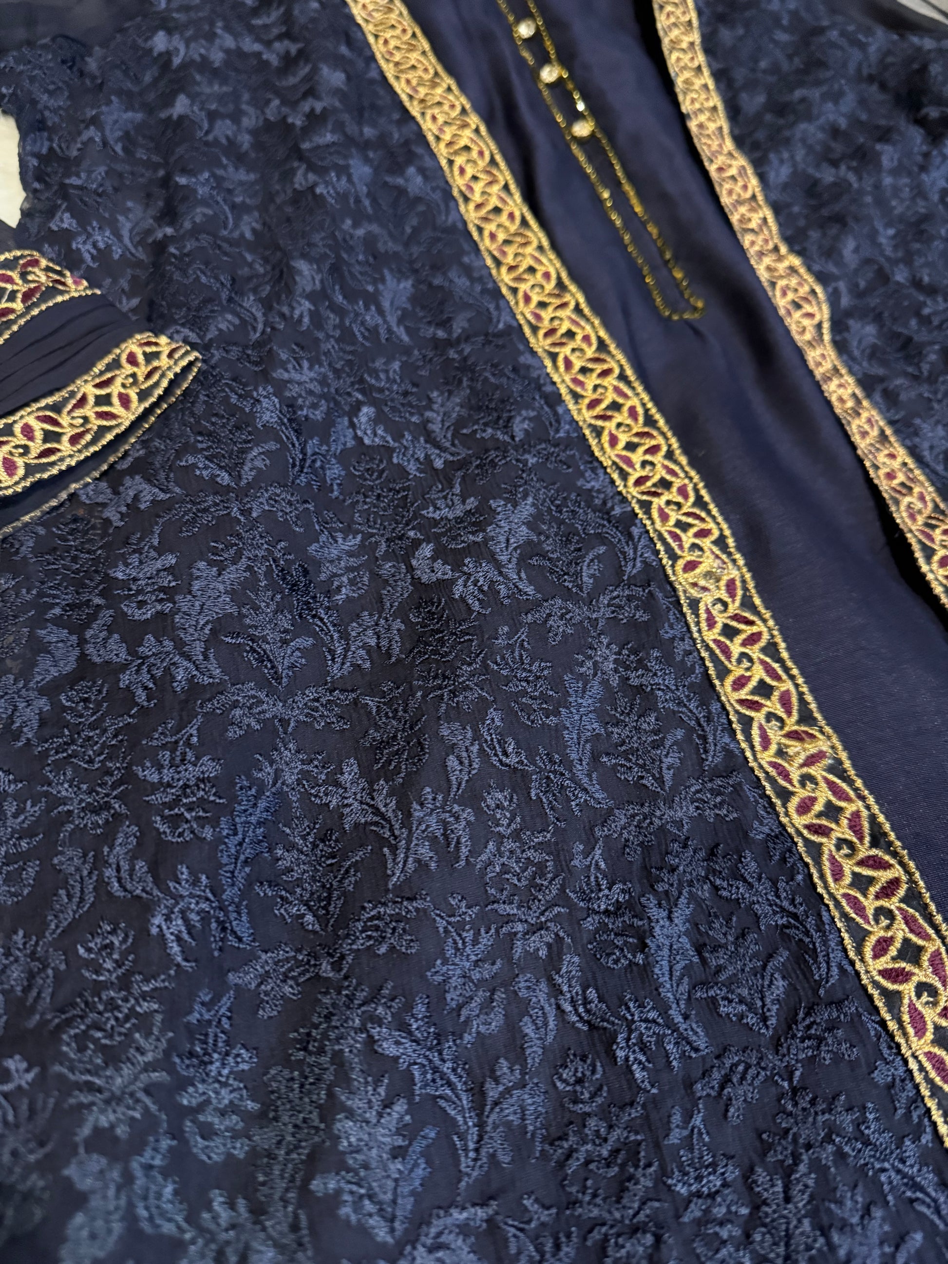 Dhanak Blue Gown with Embellished Slip and Chiffon Embroidered Jacket. Blue, Maroon and Golden Embroidery.
