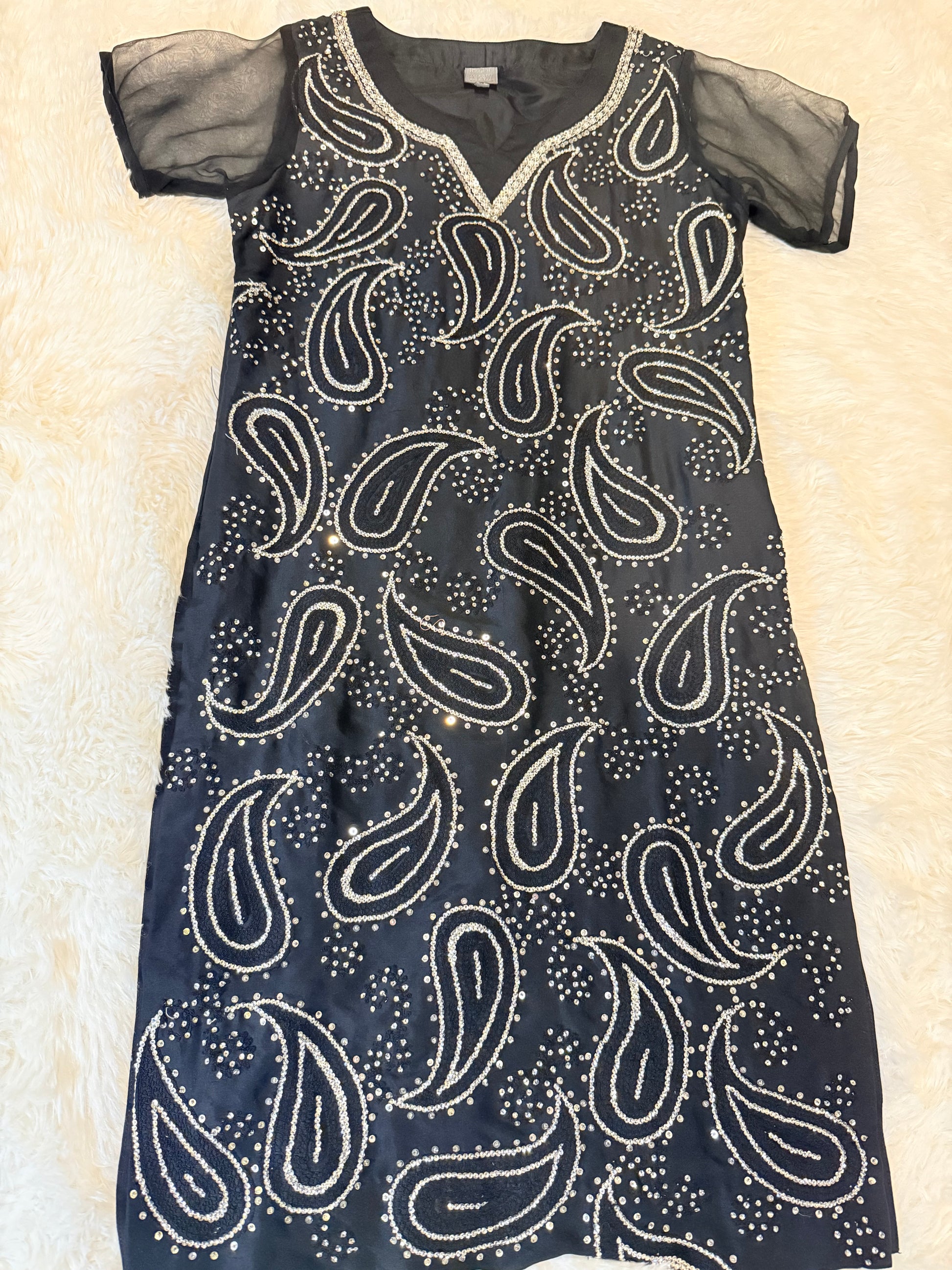 HSY Black Silk Shirt with Heavy Sequin Embroidery; Shirt has plain back and chiffon short sleeves.