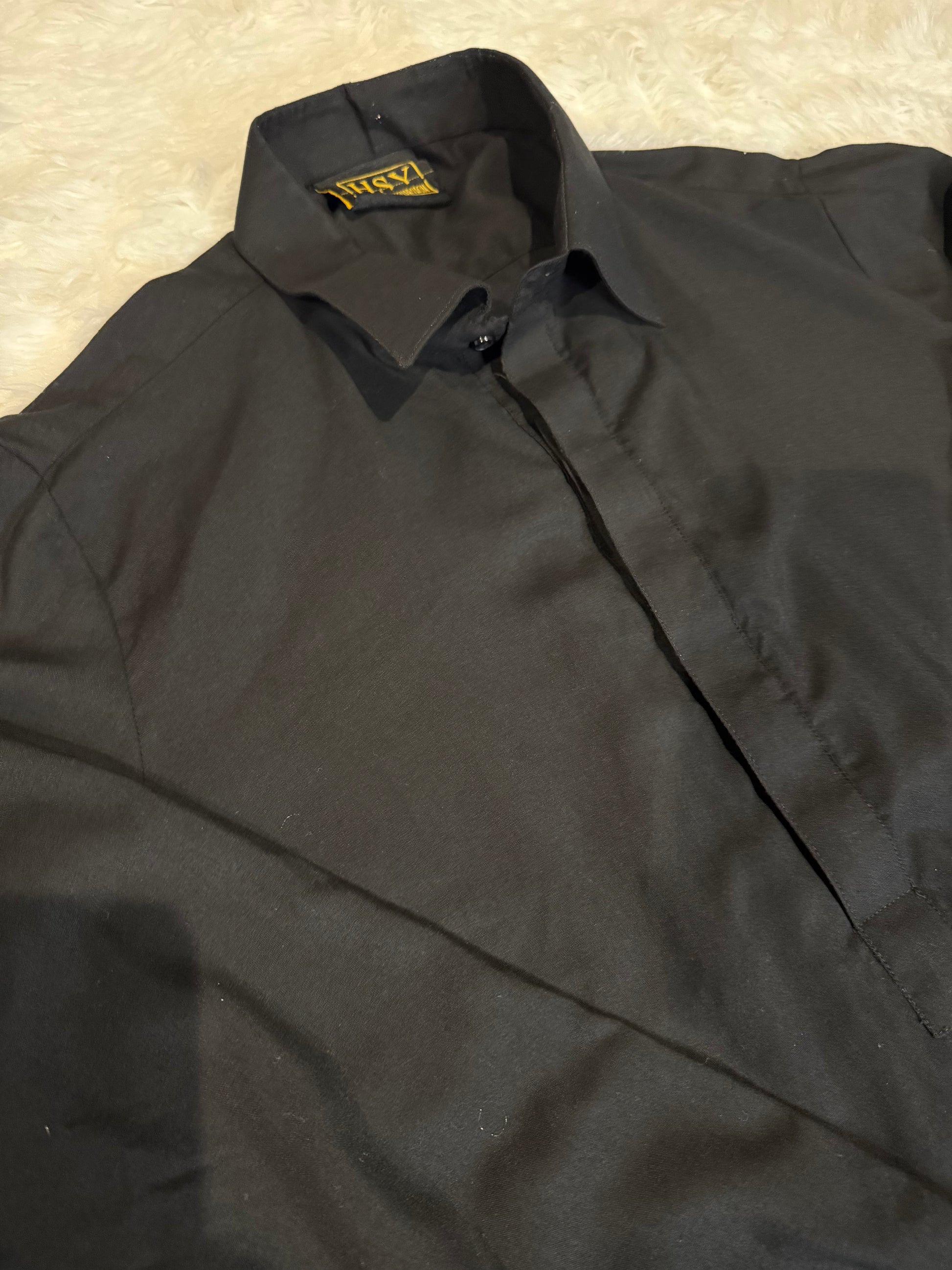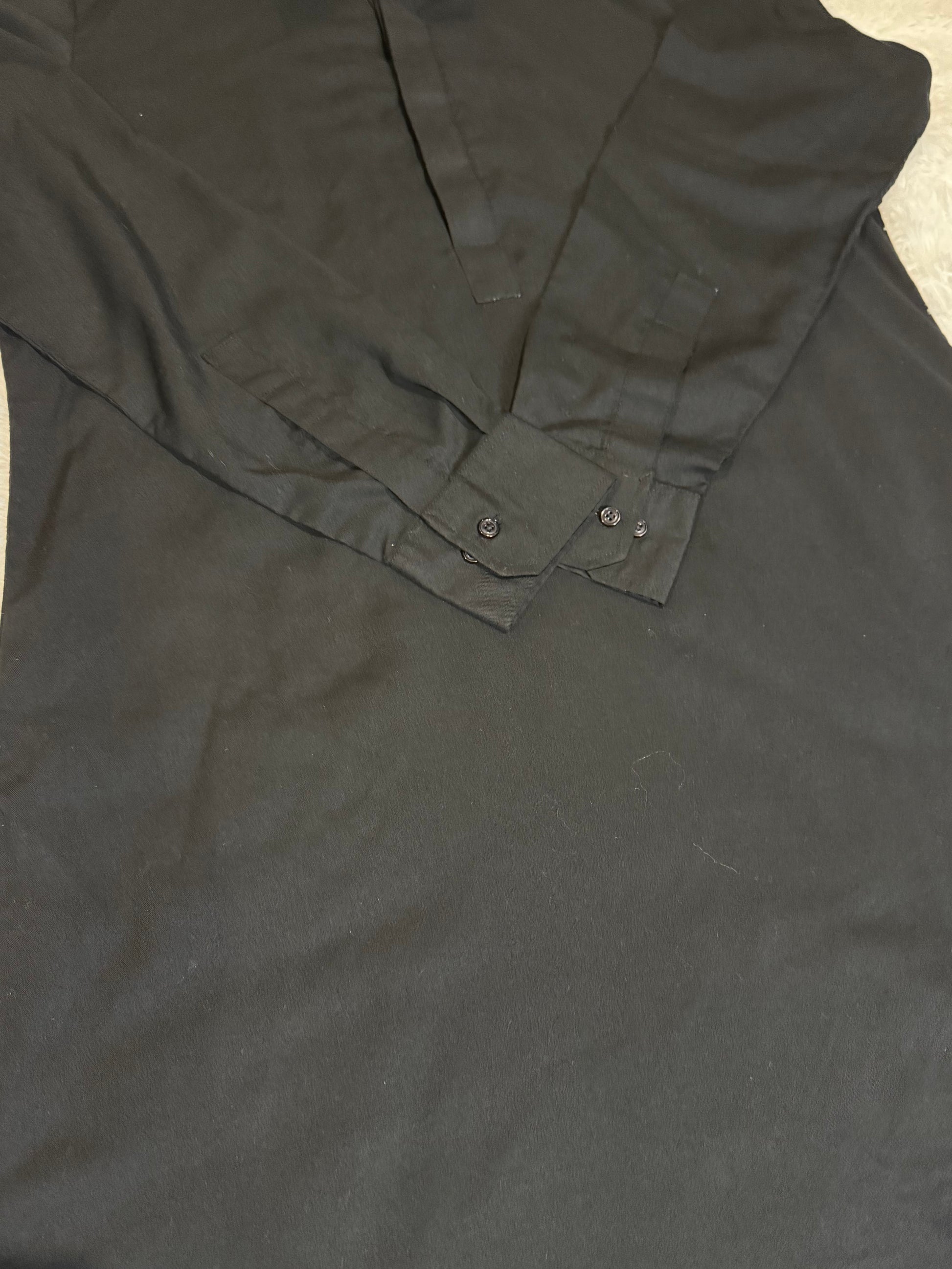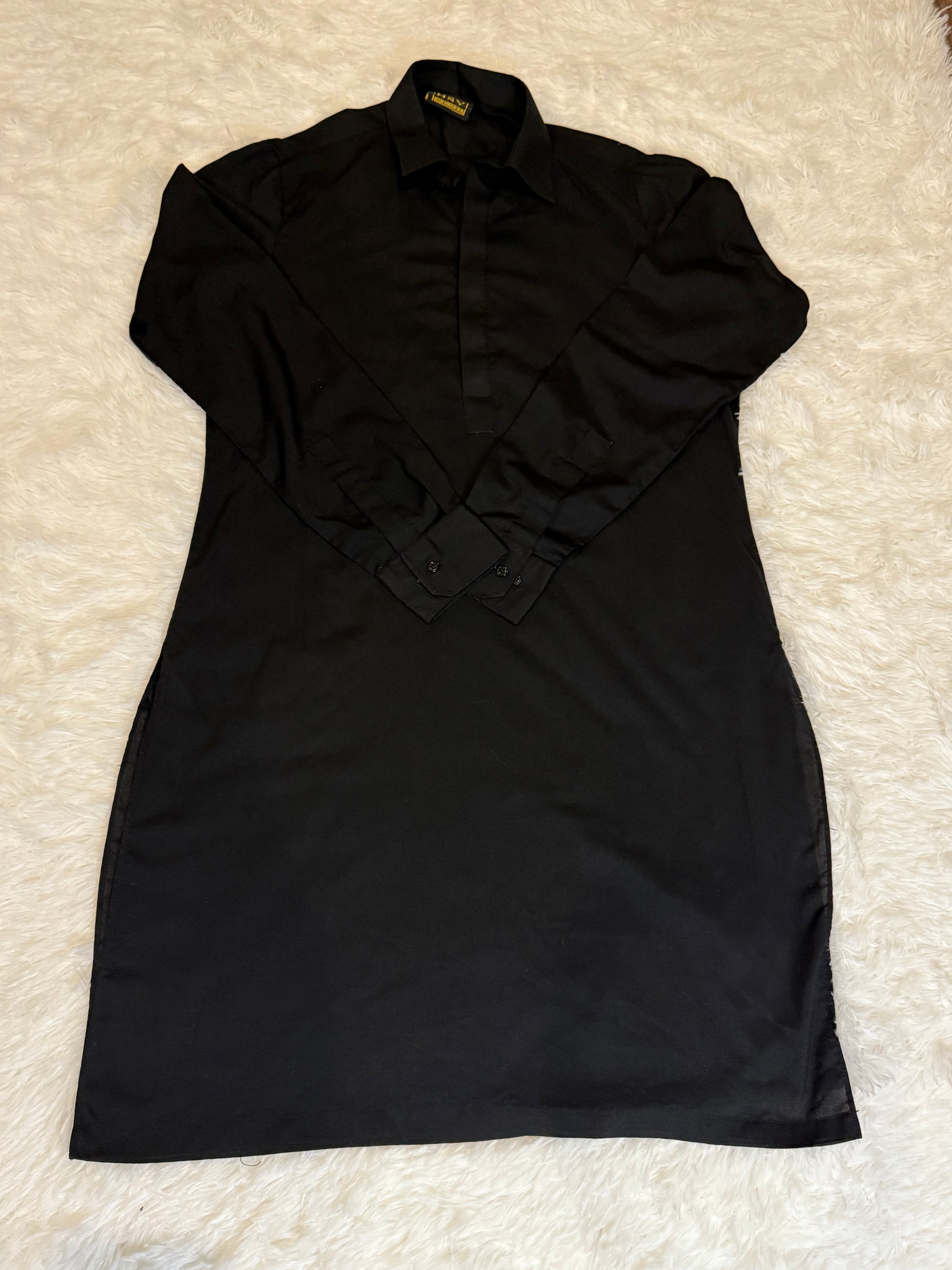 HSY Men’s Black Kurta with Collar and Cuff Sleeves. Size is Slim Fit Medium, please consult measurements for details. Material is a soft cotton.
