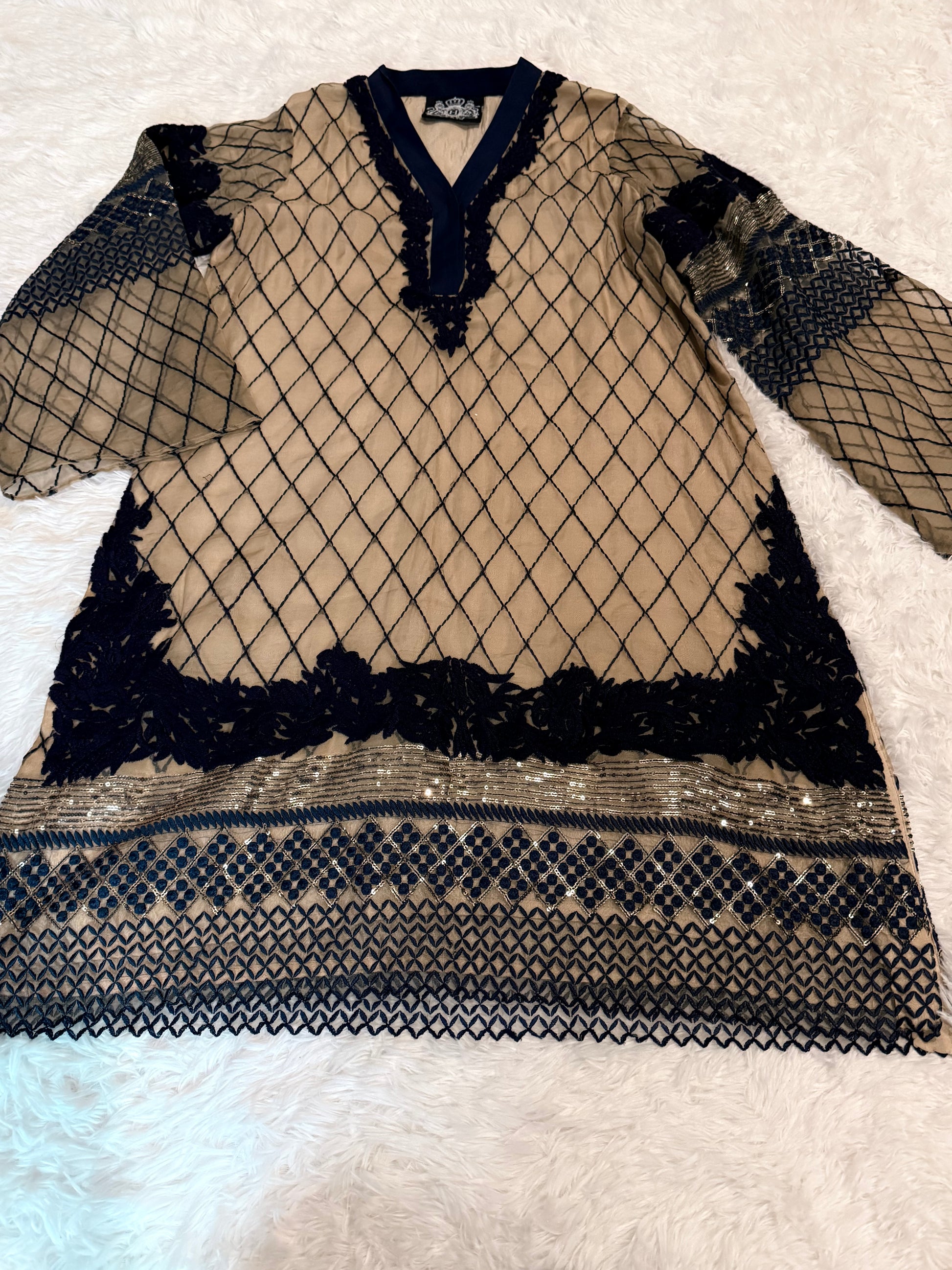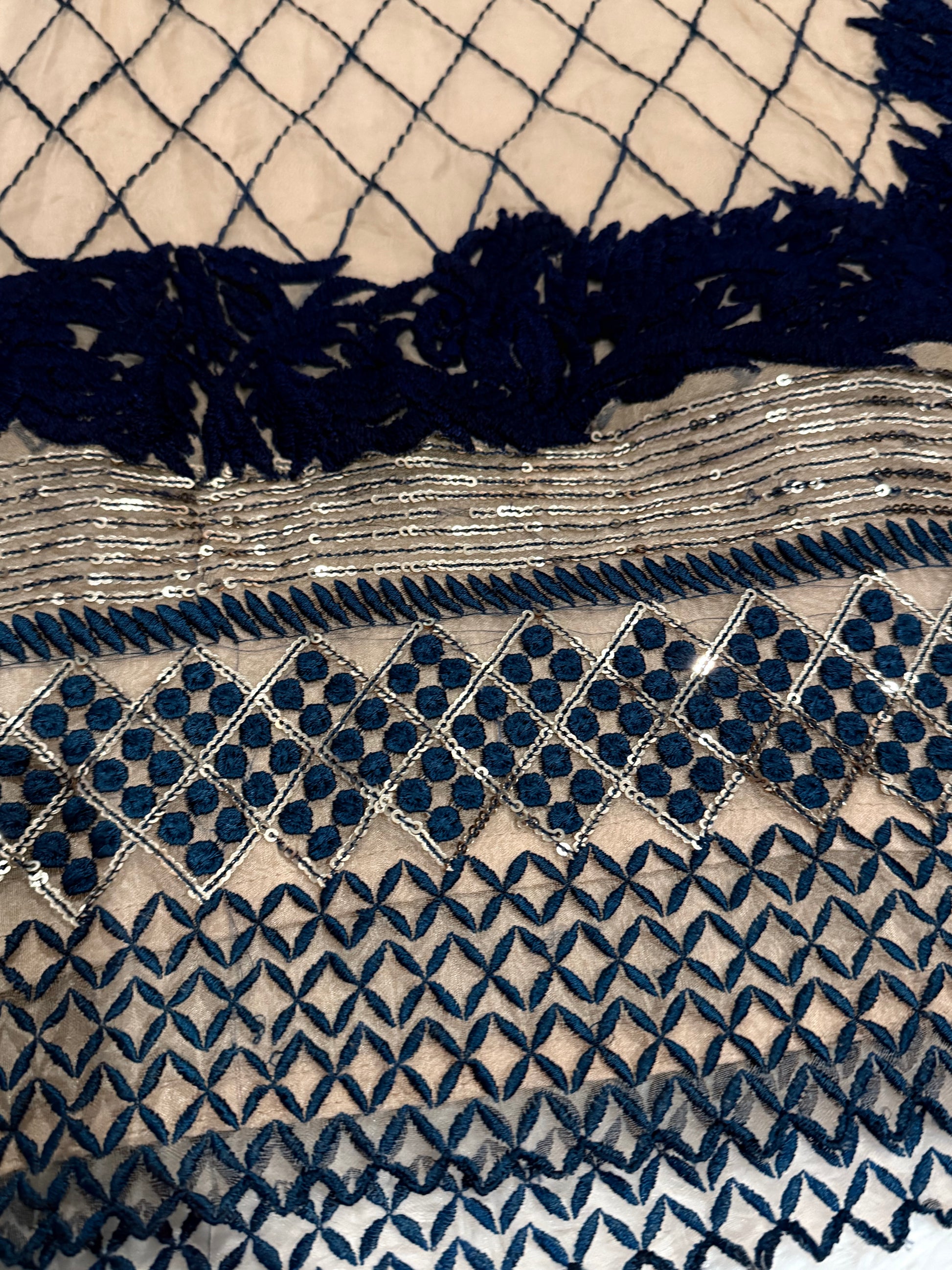 HSY Net Shirt in skin color with Navy Blue Embroidery and Sequins.