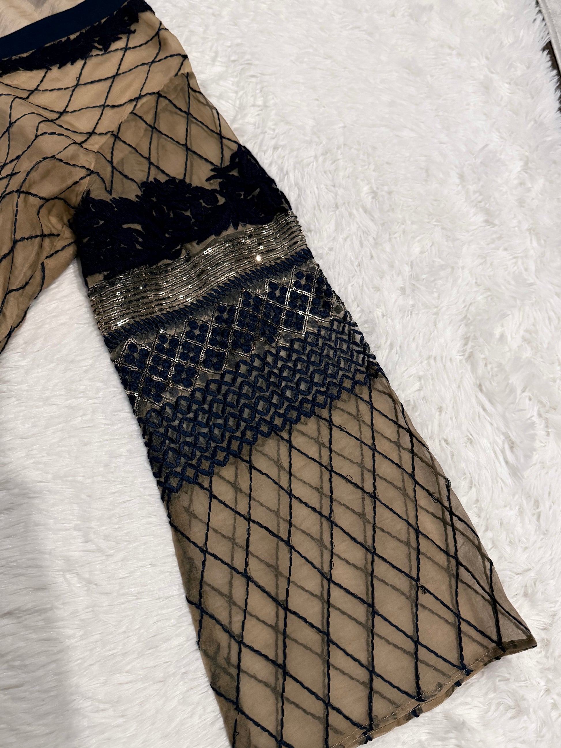 HSY Net Shirt in Skin color with Navy Blue Embroidery and Sequins