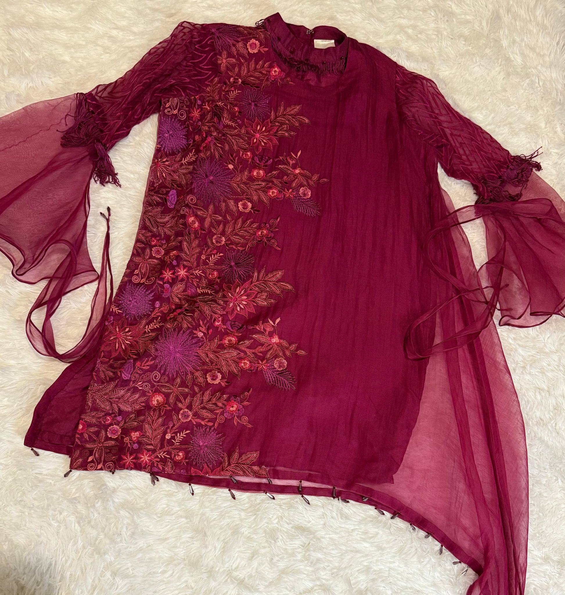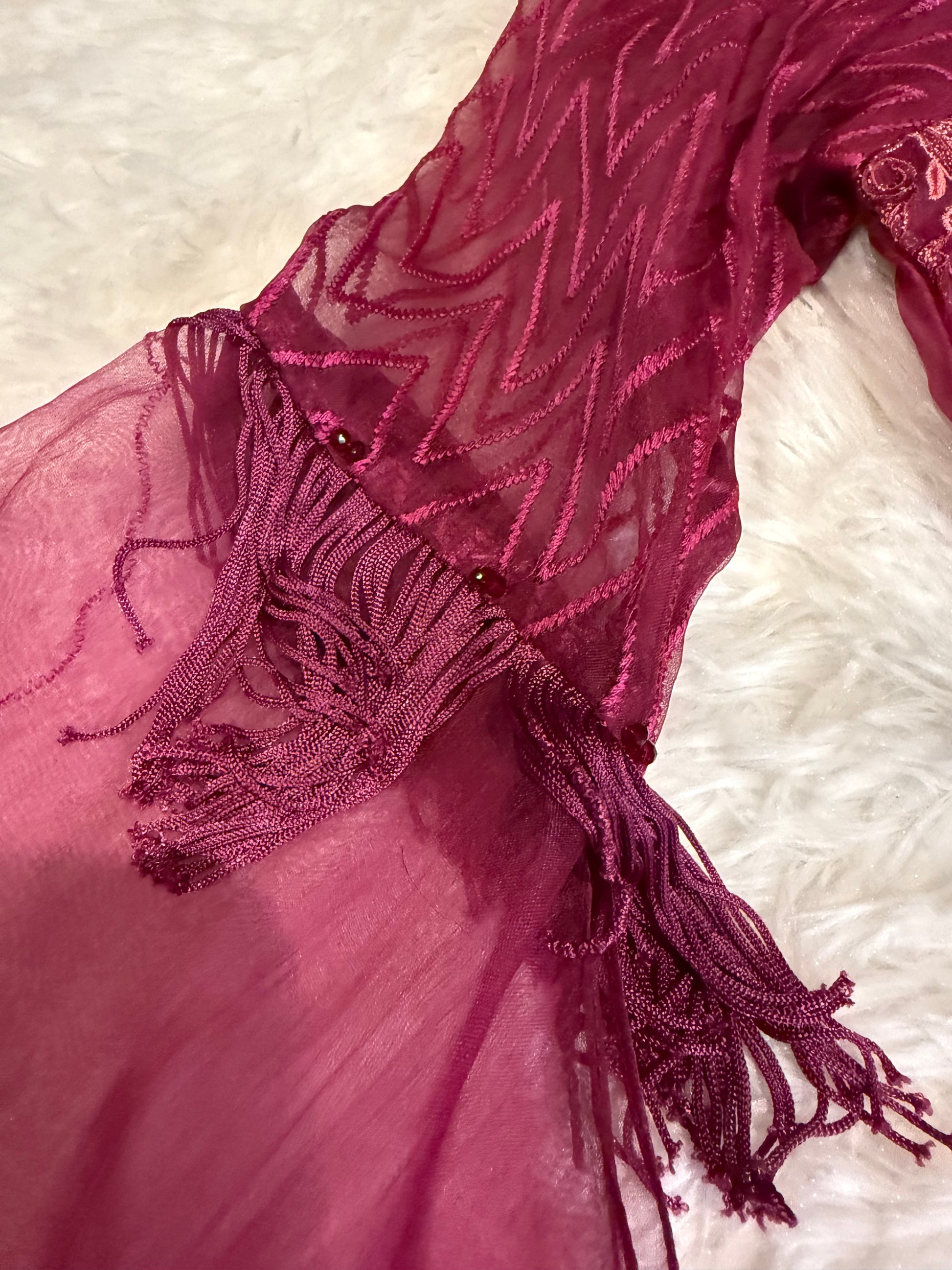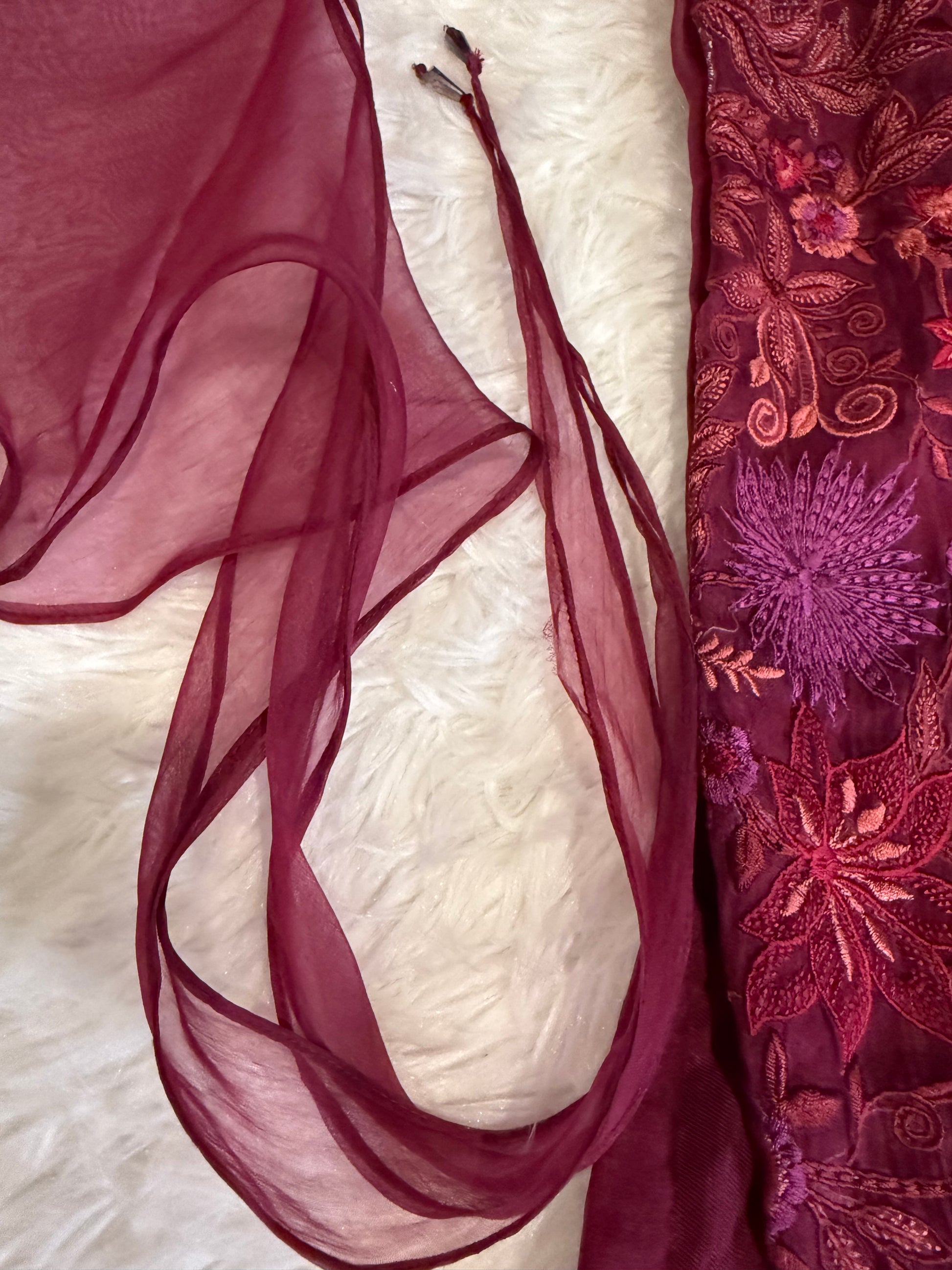Jeem Deep Fuchsia/Maroon Organza Kameez with One Drop Corner.