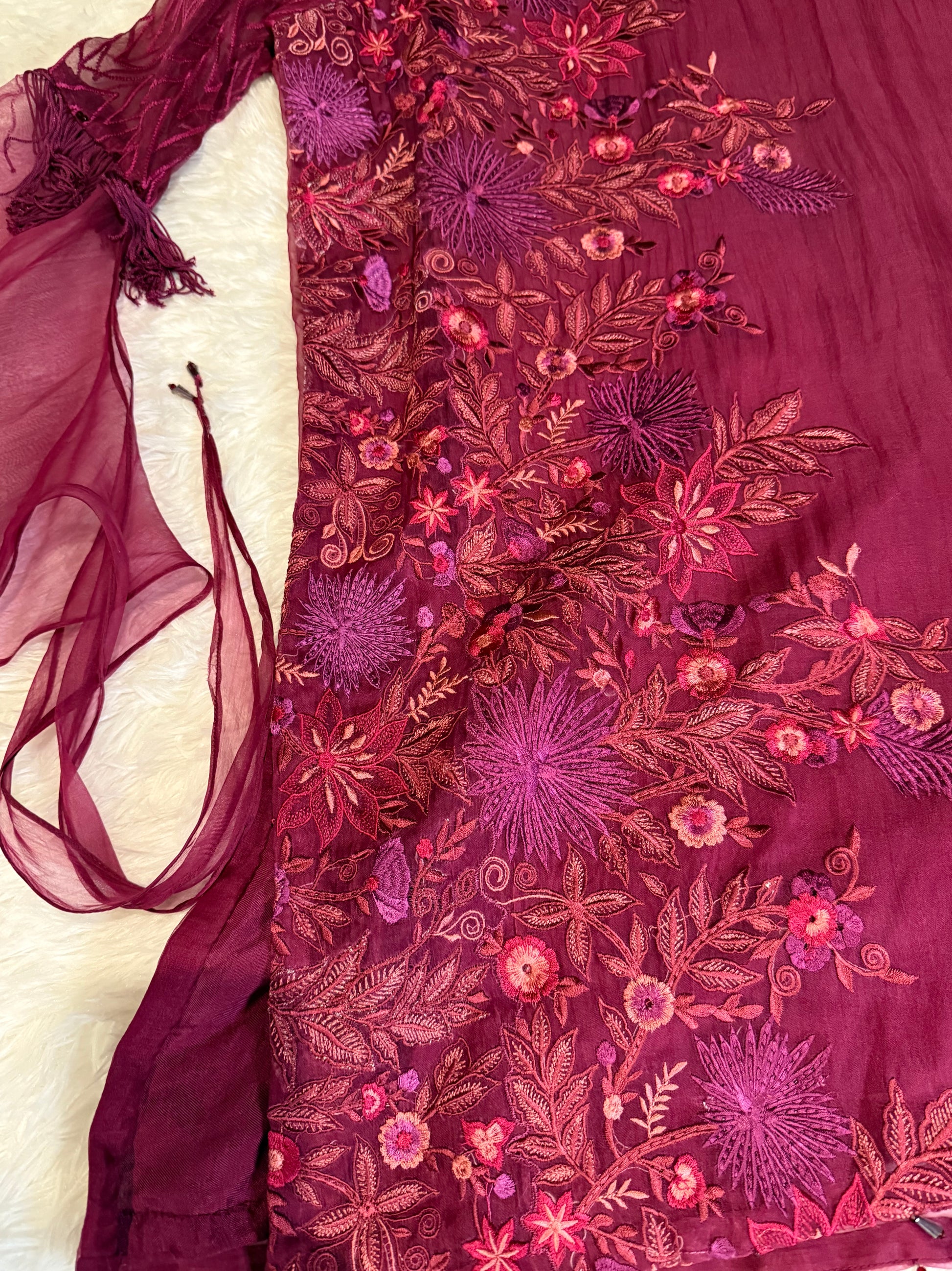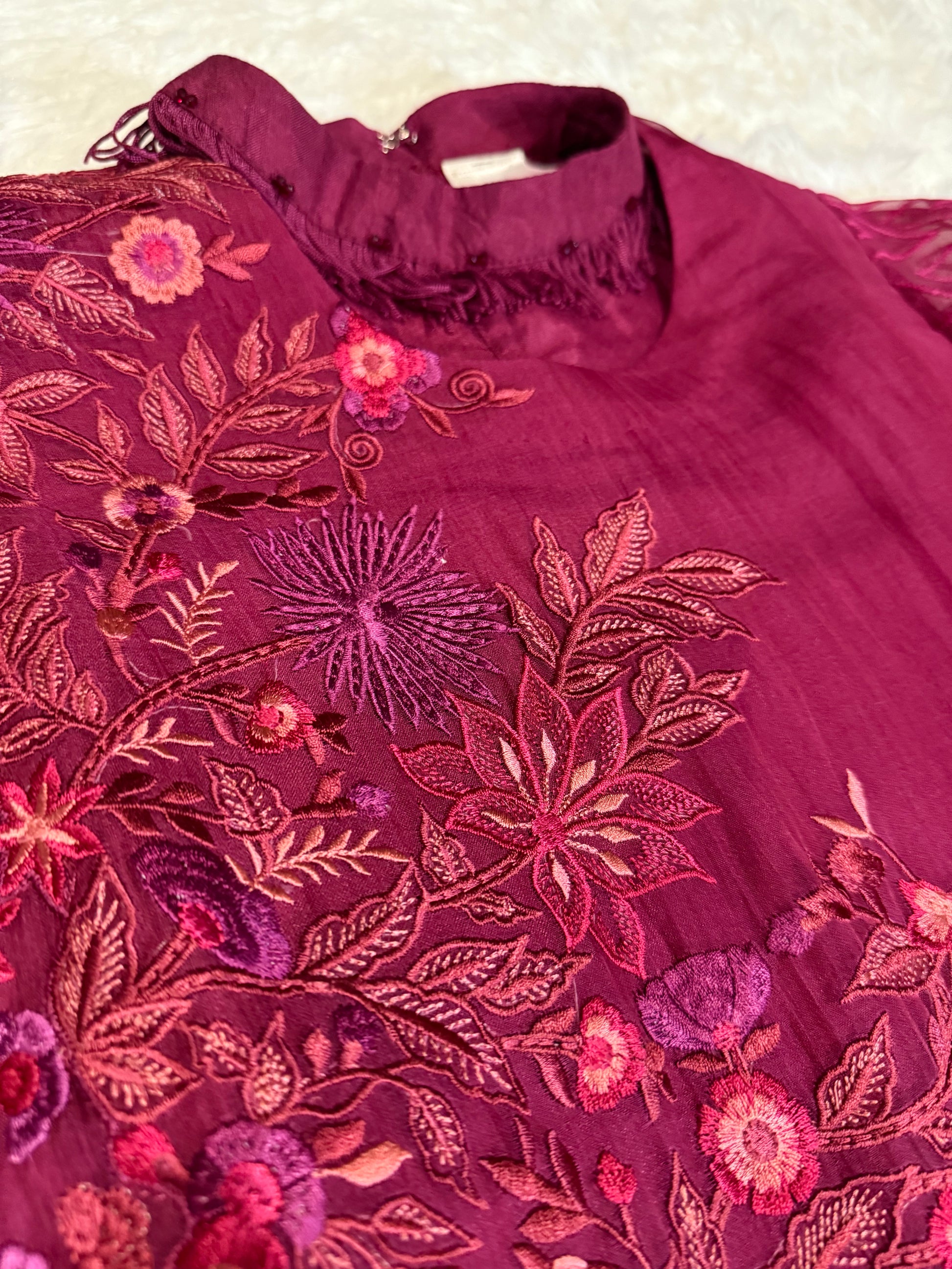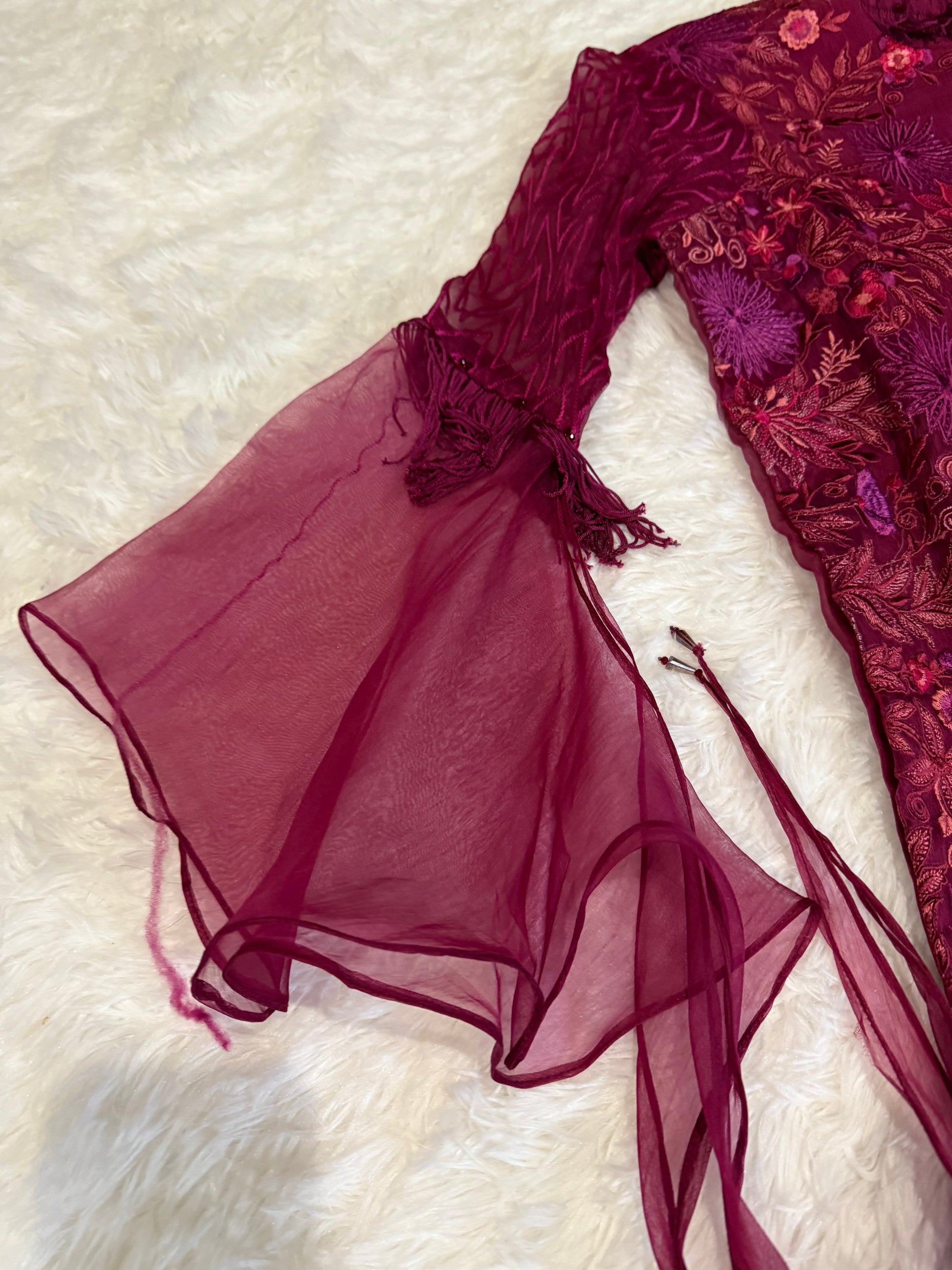 Jeem Deep Fuchsia/Maroon Organza Kameez with One Drop Corner.
