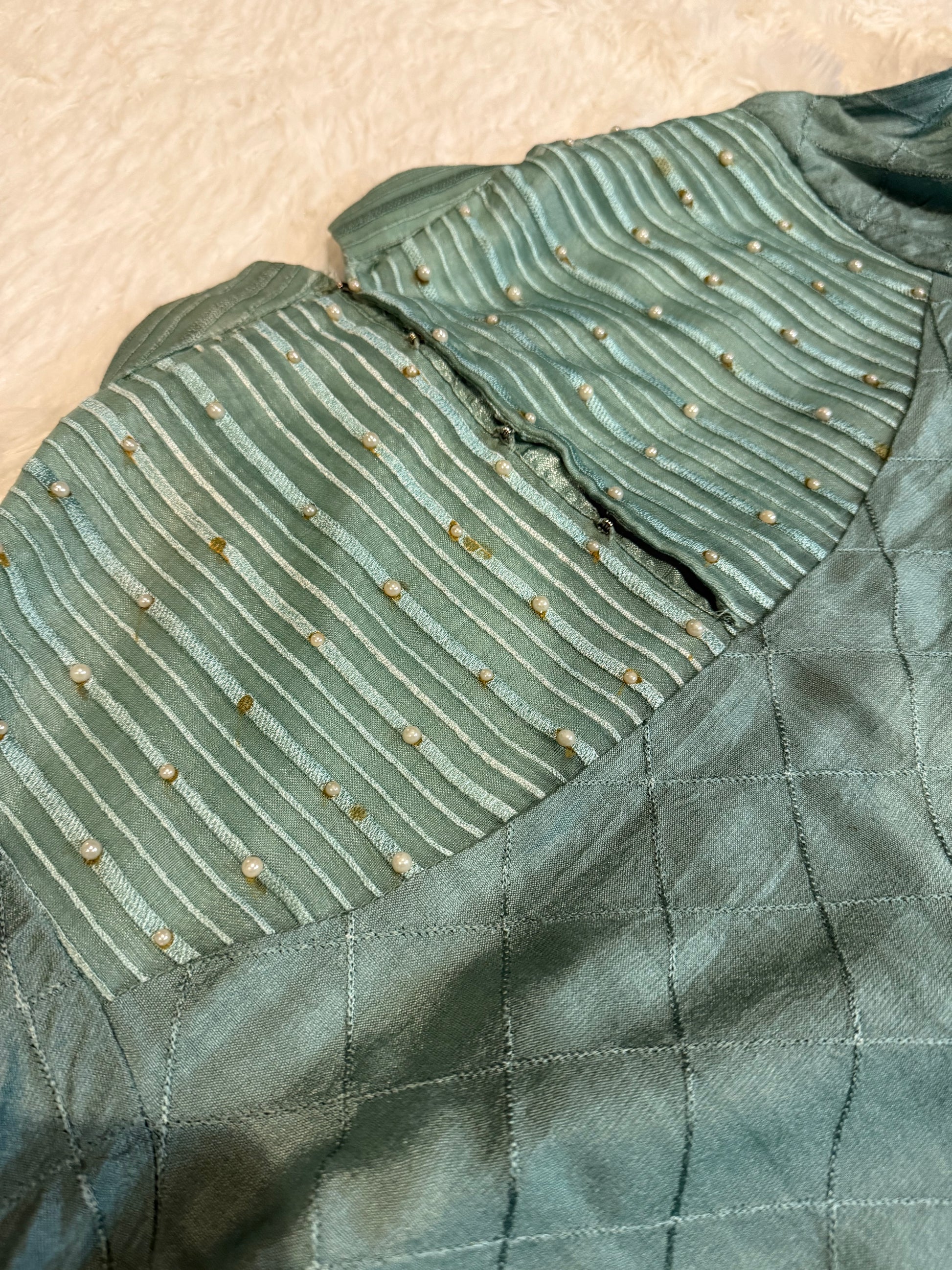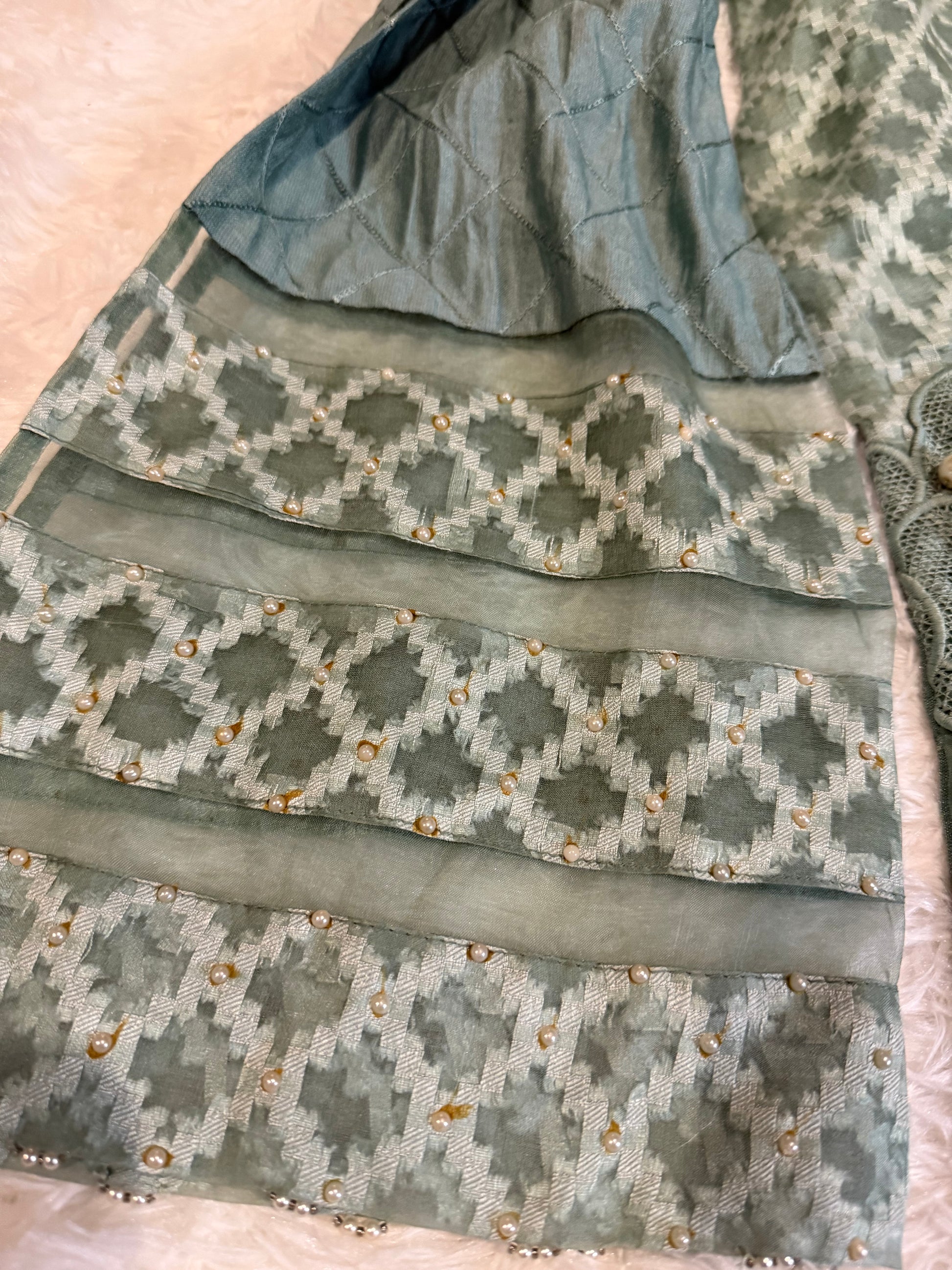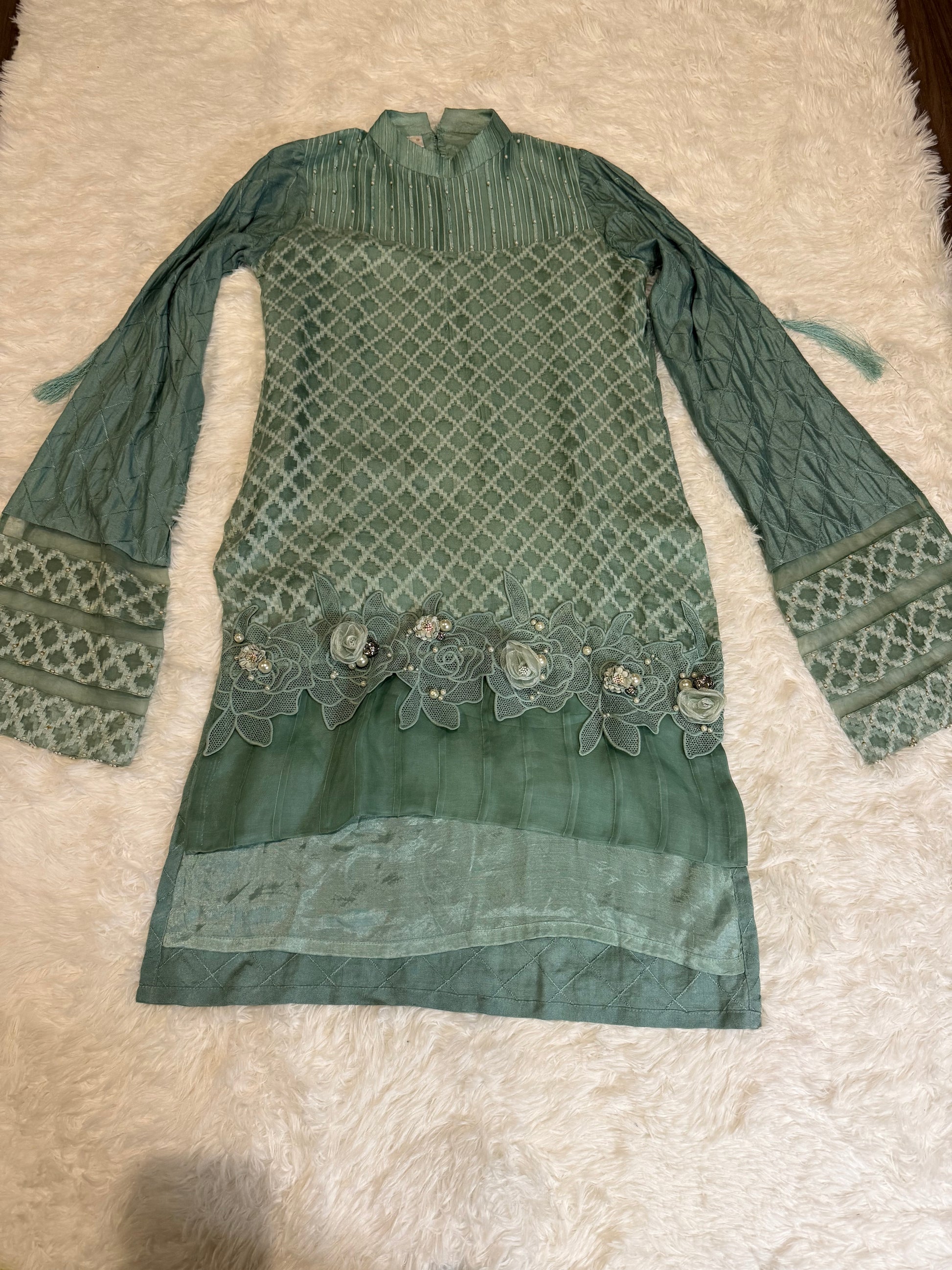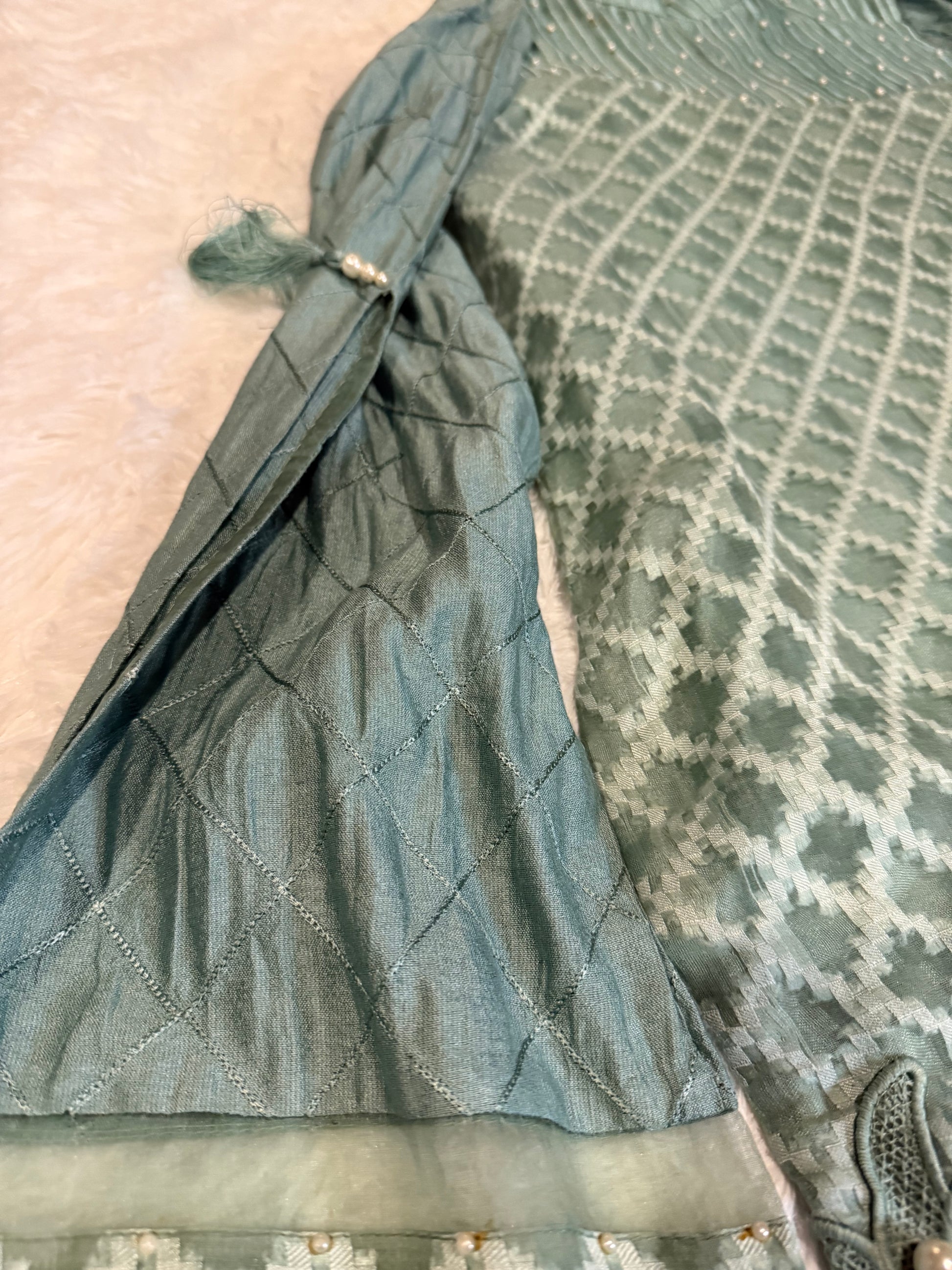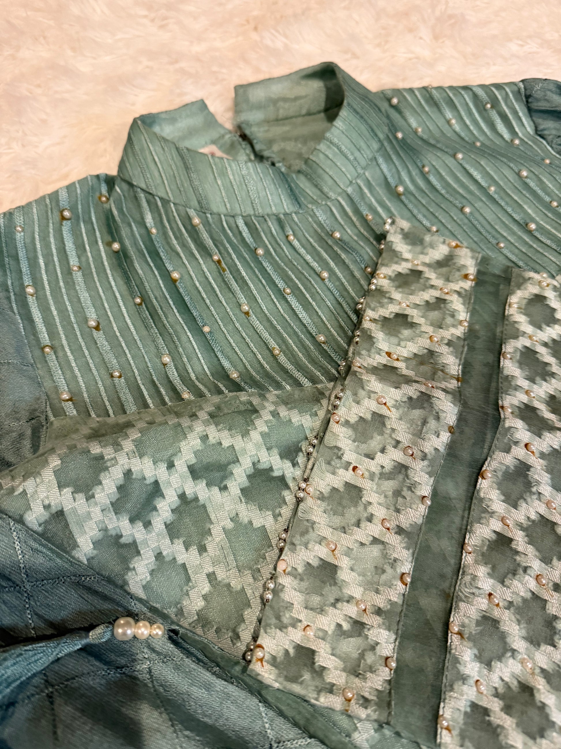 Jeem Dark Sea Green Heavily Embroidered Kameez made of Organza with Lining. Beautiful shirt with stylish long sleeves with a cut at 12 inches that convert into a bell sleeve. There is some slight wear on the back where the closures are but is still in great condition overall.