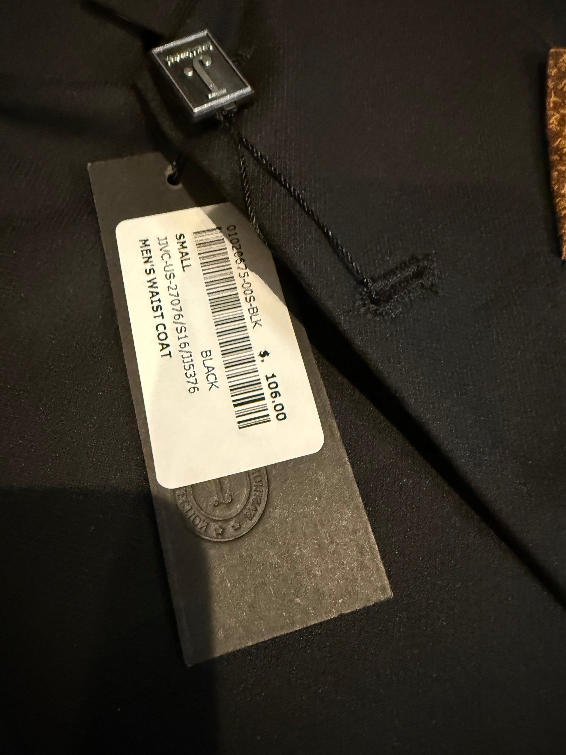 Beautiful Black Waistcoat with black buttons with Purple & Gold pocket square. Comes in original packaging, Retails for $106 + tax.