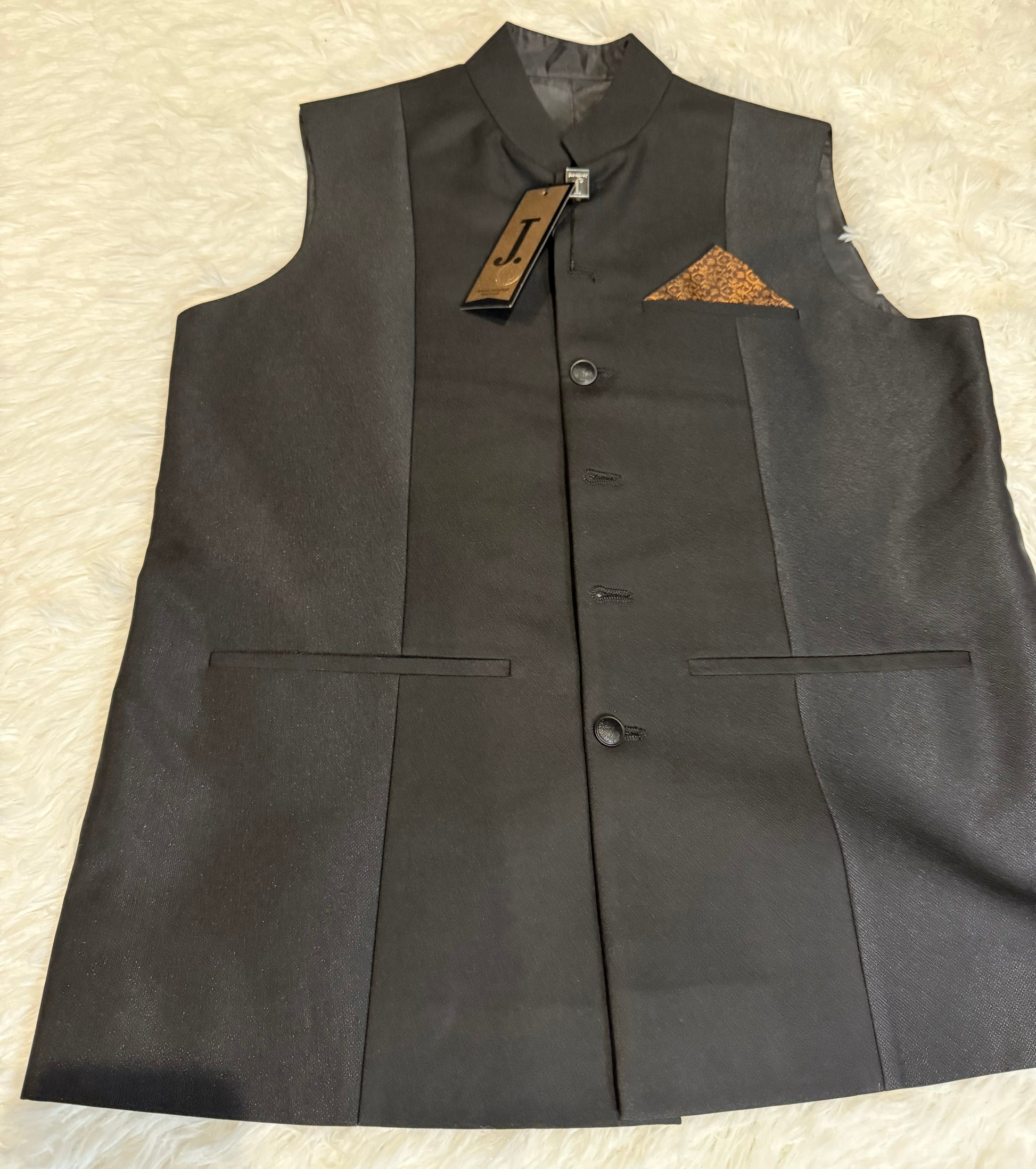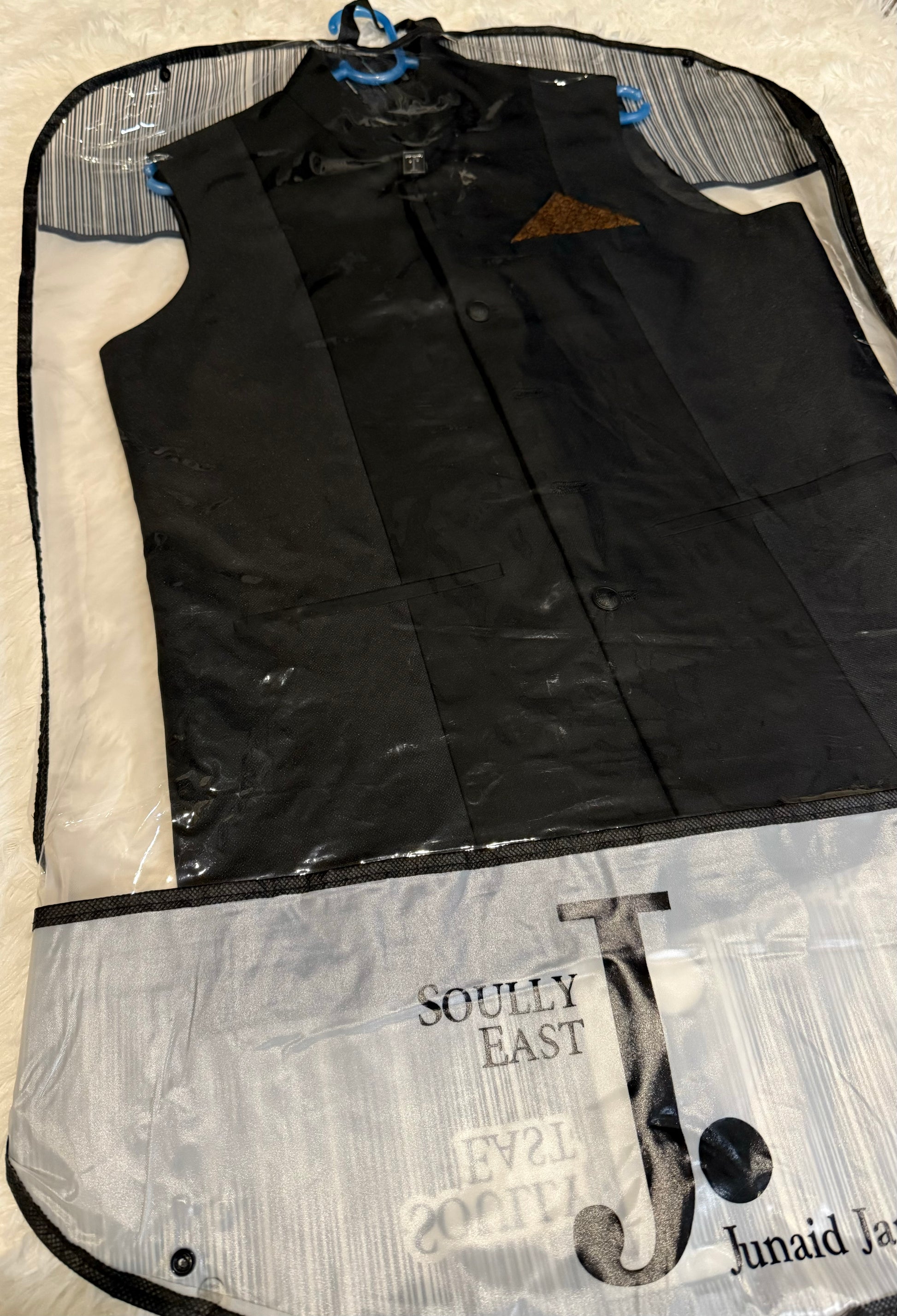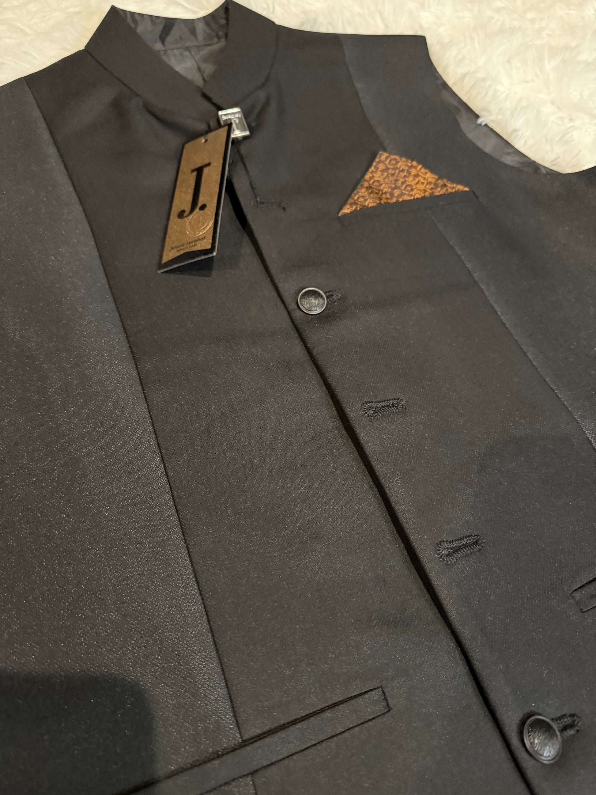 .Junaid Jamshed Black Waistcoat with Purple & Gold Pocket Square