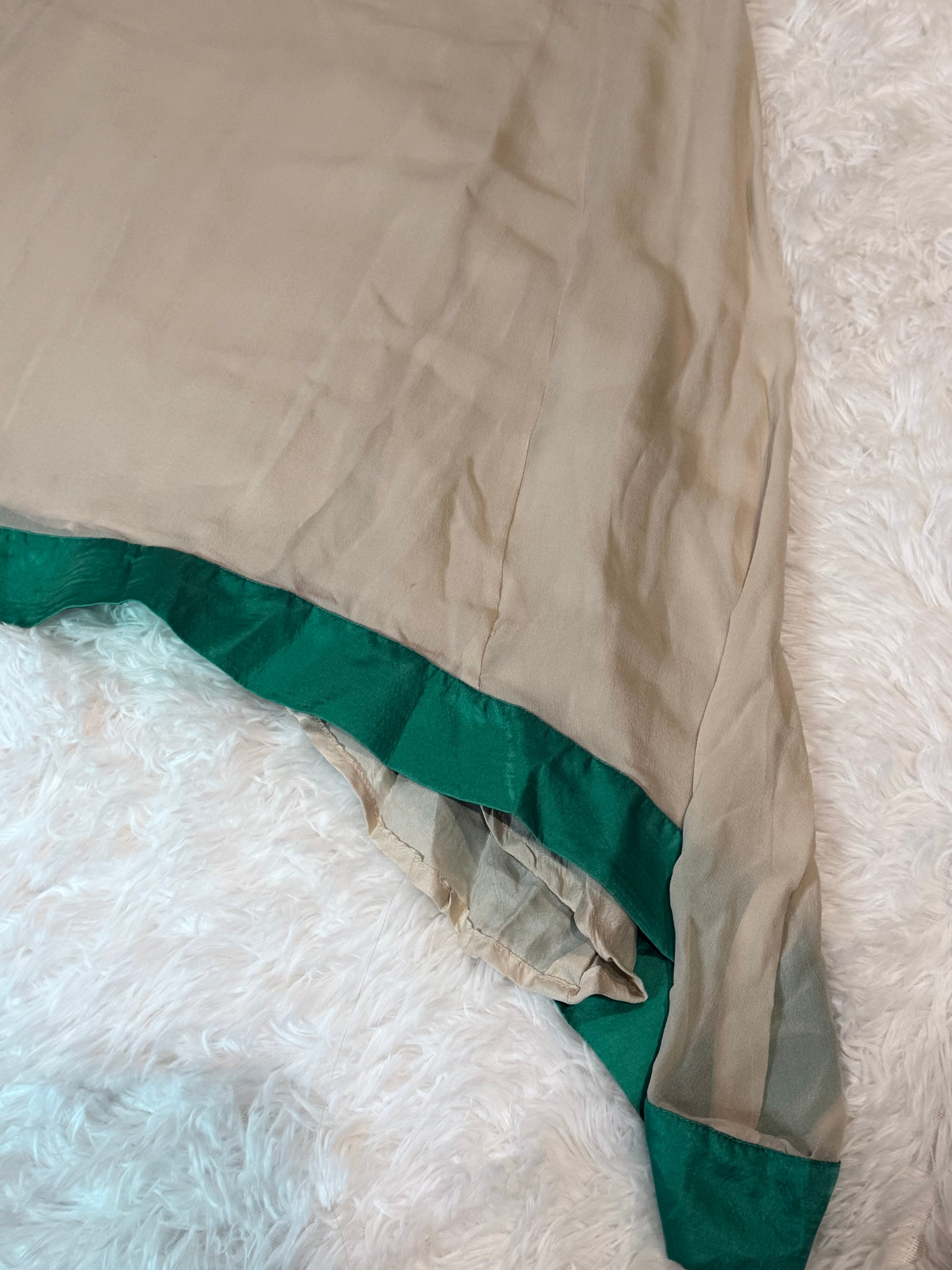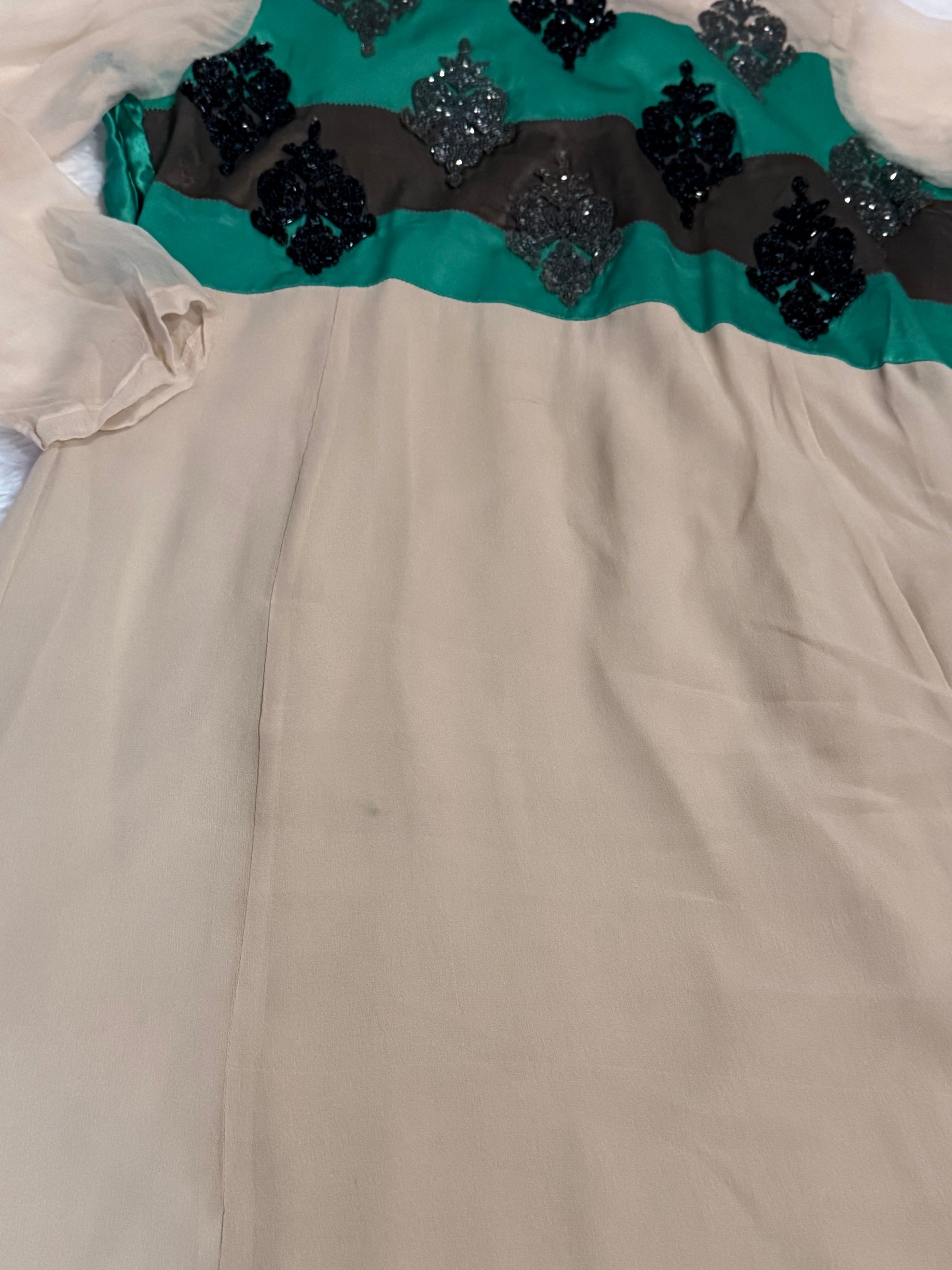 This is a beautiful and stylish long shirt with drop sides. Material is Chiffon/Poly blend, fully lined with sleeves. Sleeves are not lined. Comes with silk pants. This outfit can be dressed up for a formal event. Tag on shirt says size is small but the chest size was altered by adding material to make it a M/L fit.