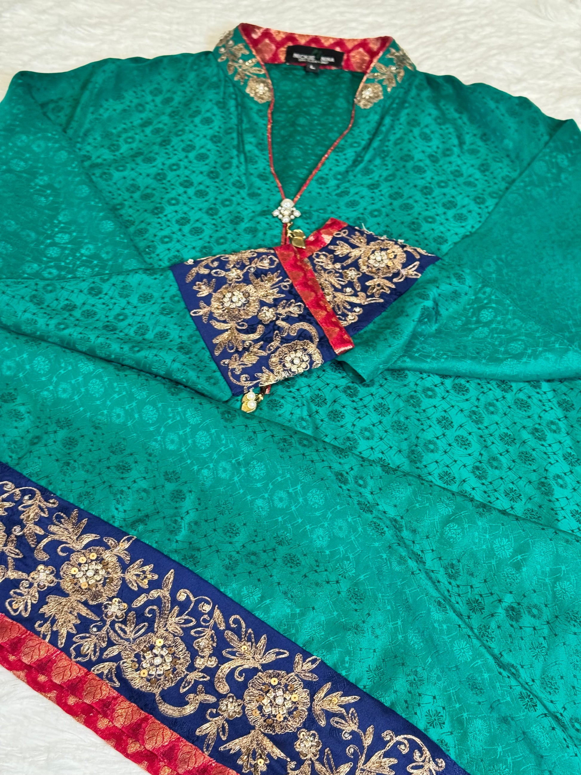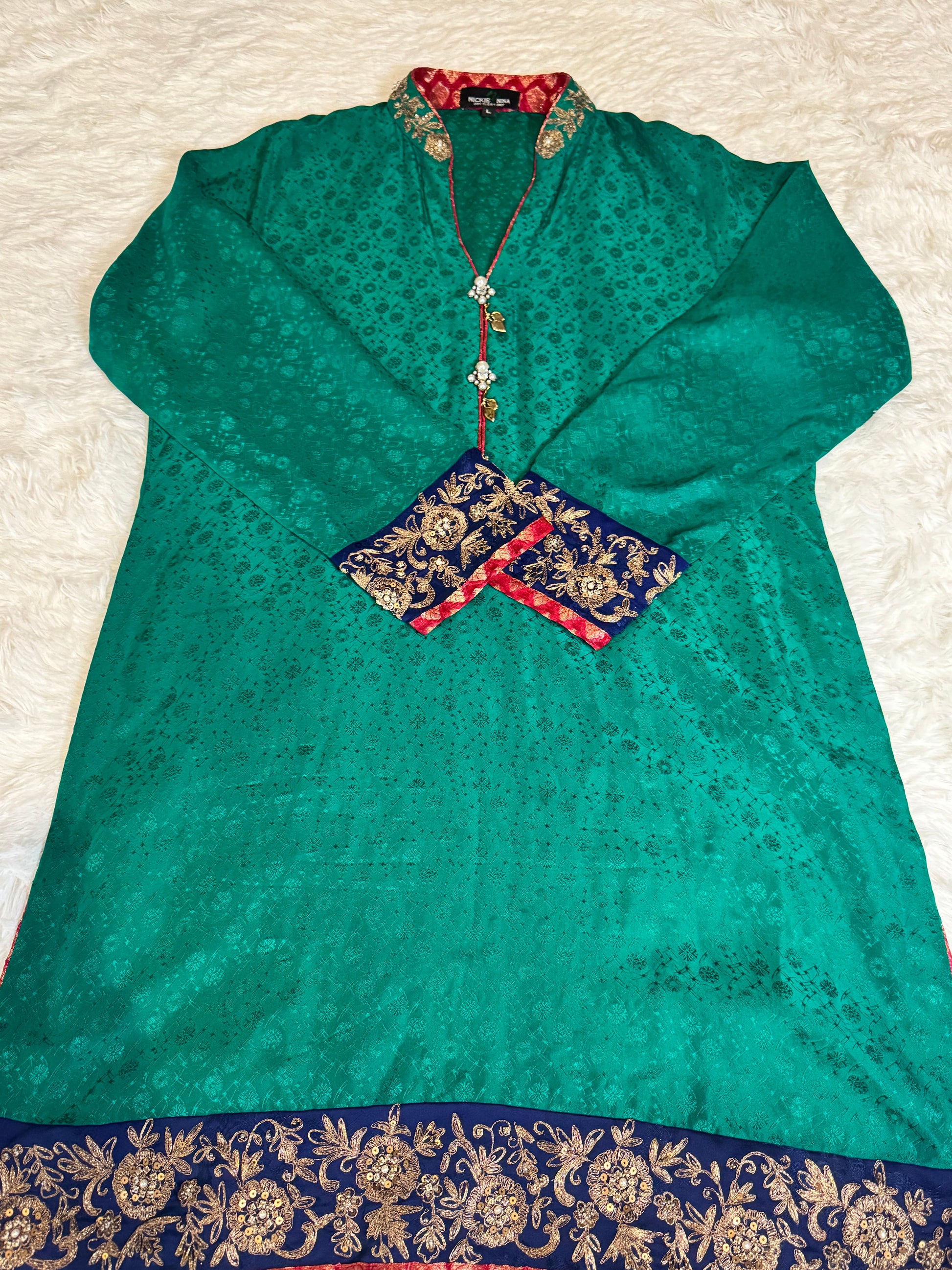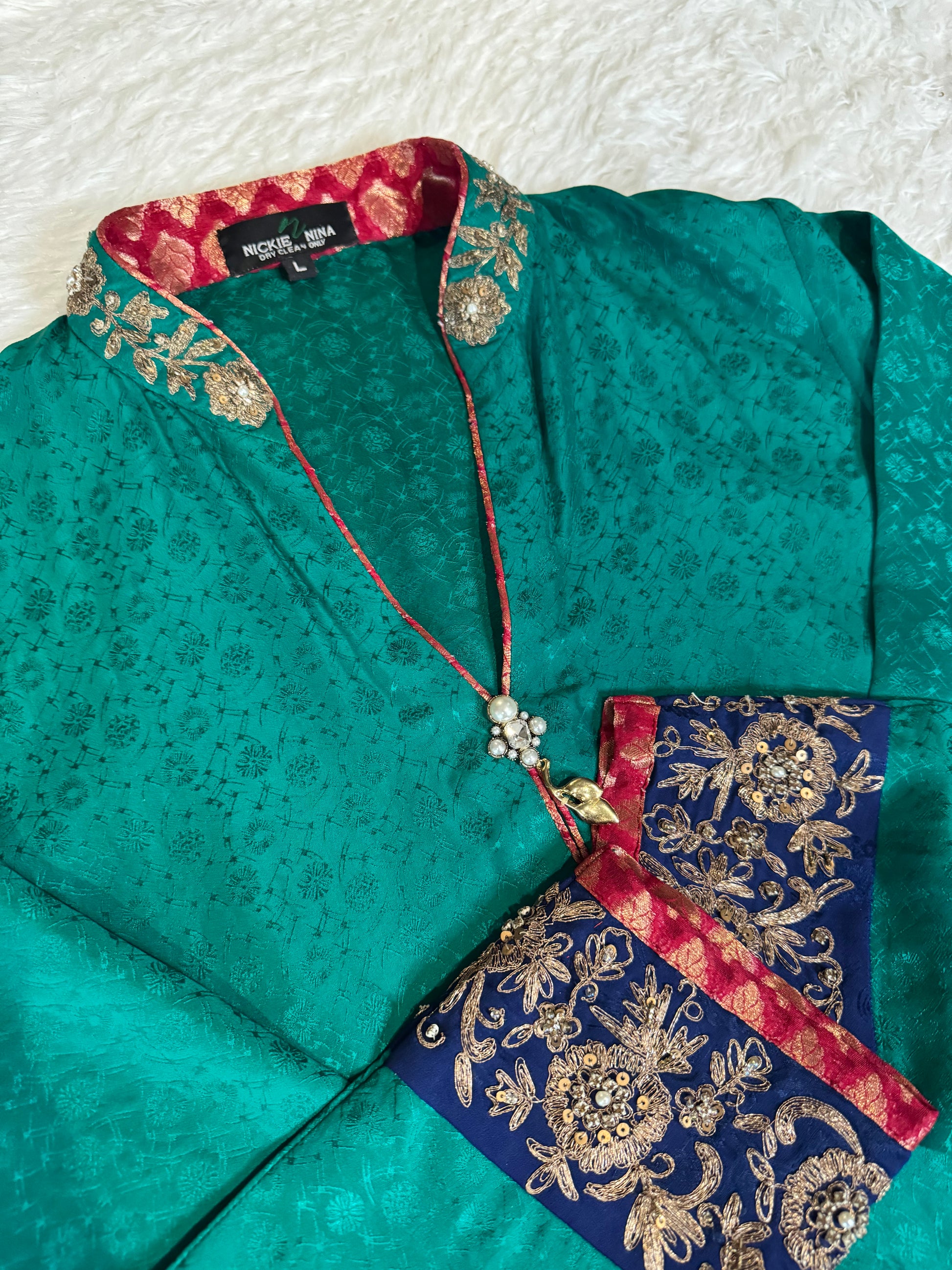 Nickie Nina Green Silk Kameez/Kurta style with embroidery - shirt only, can be paired with golden bottoms for the perfect wedding/party look!