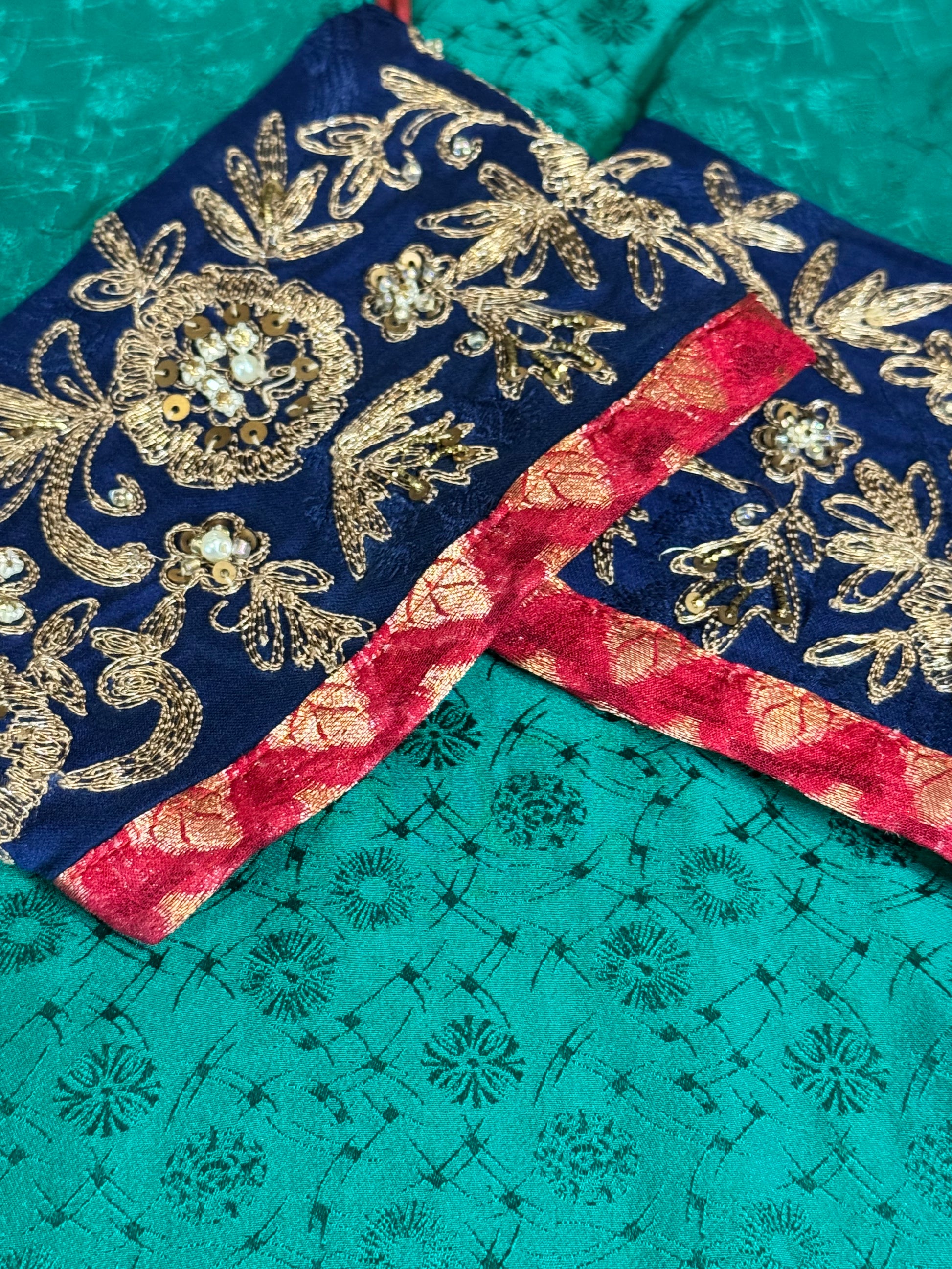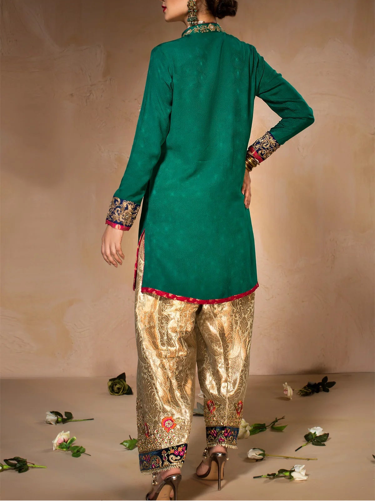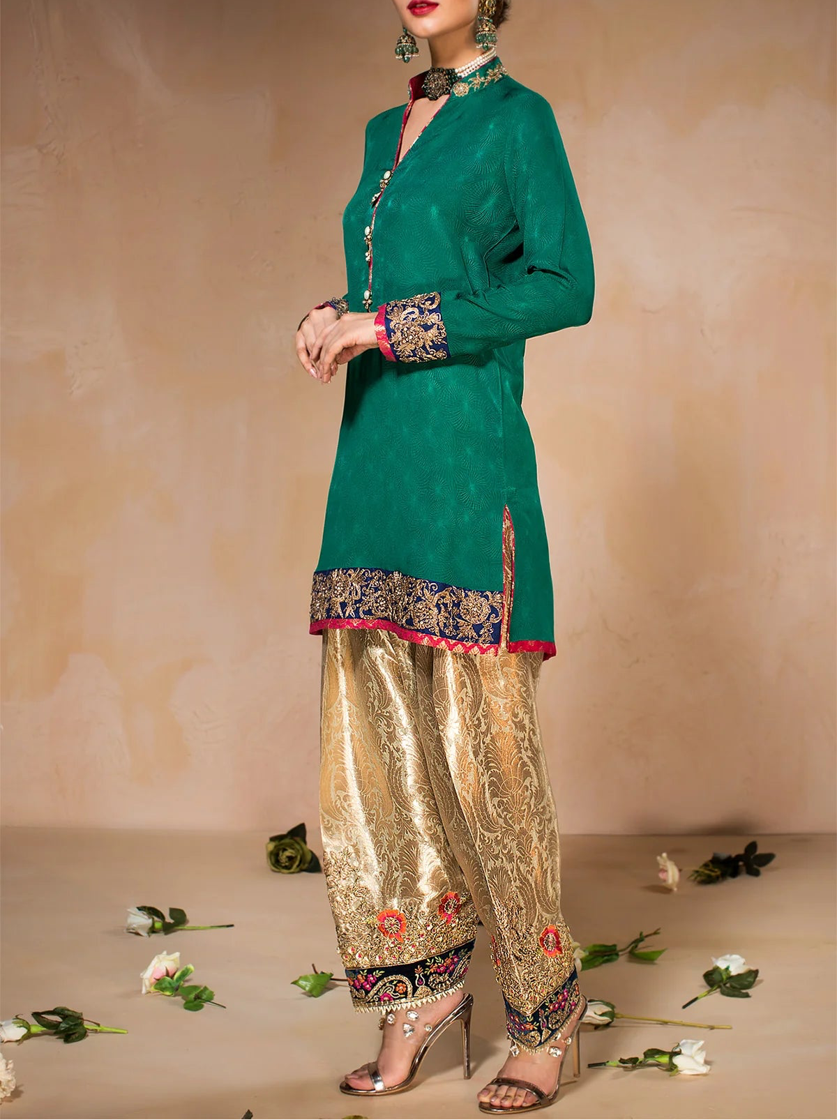 Nickie Nina Green Silk Kameez/Kurta style with embroidery - shirt only, can be paired with golden bottoms for the perfect wedding/party look!