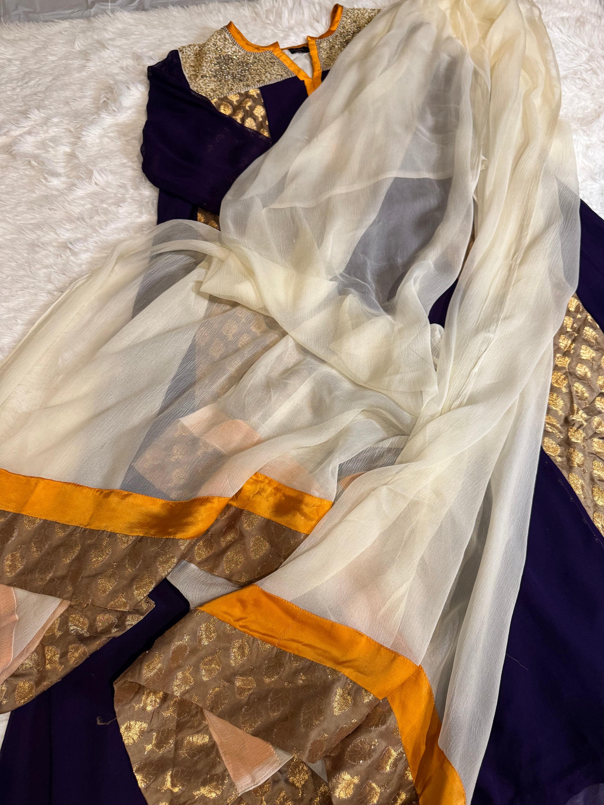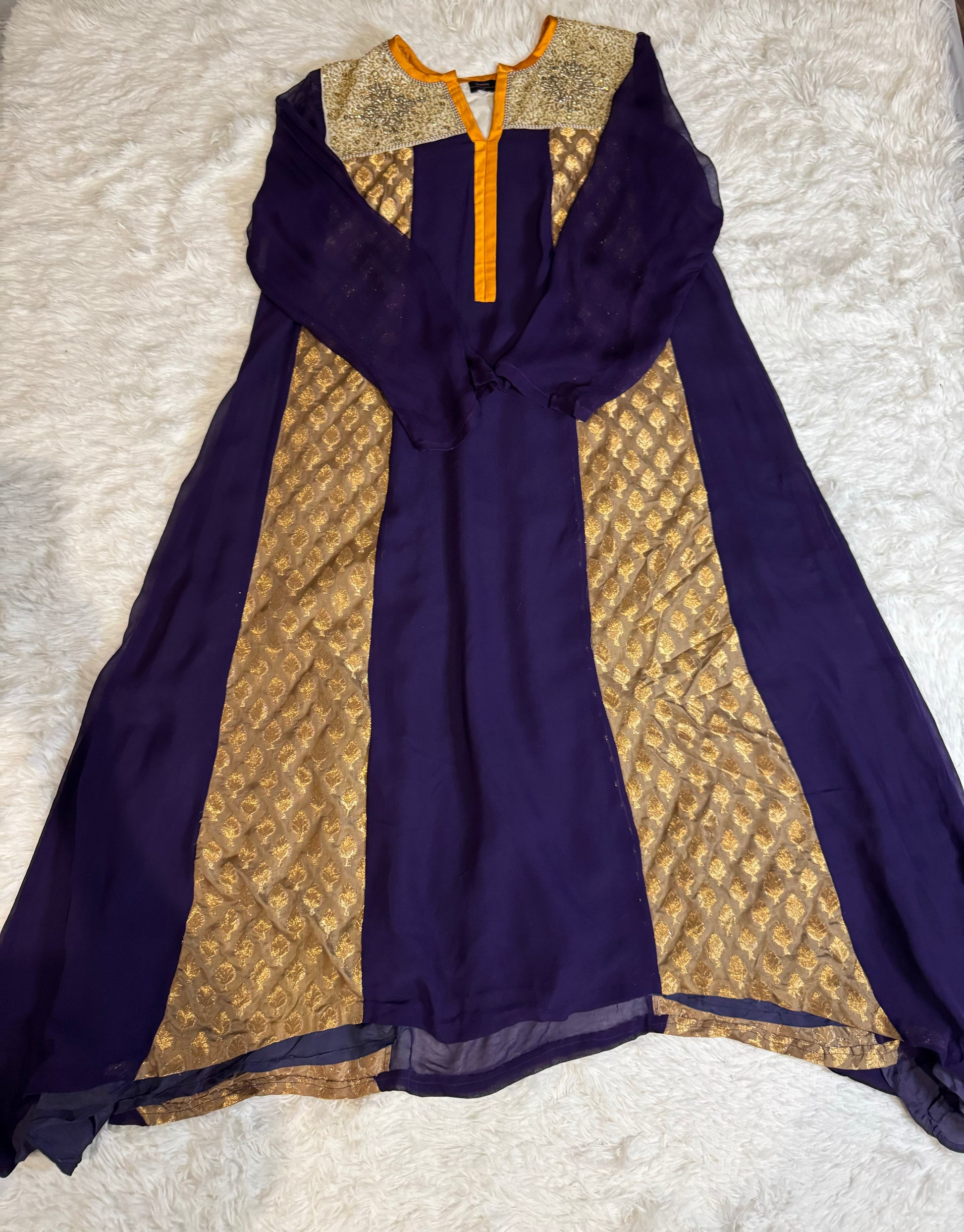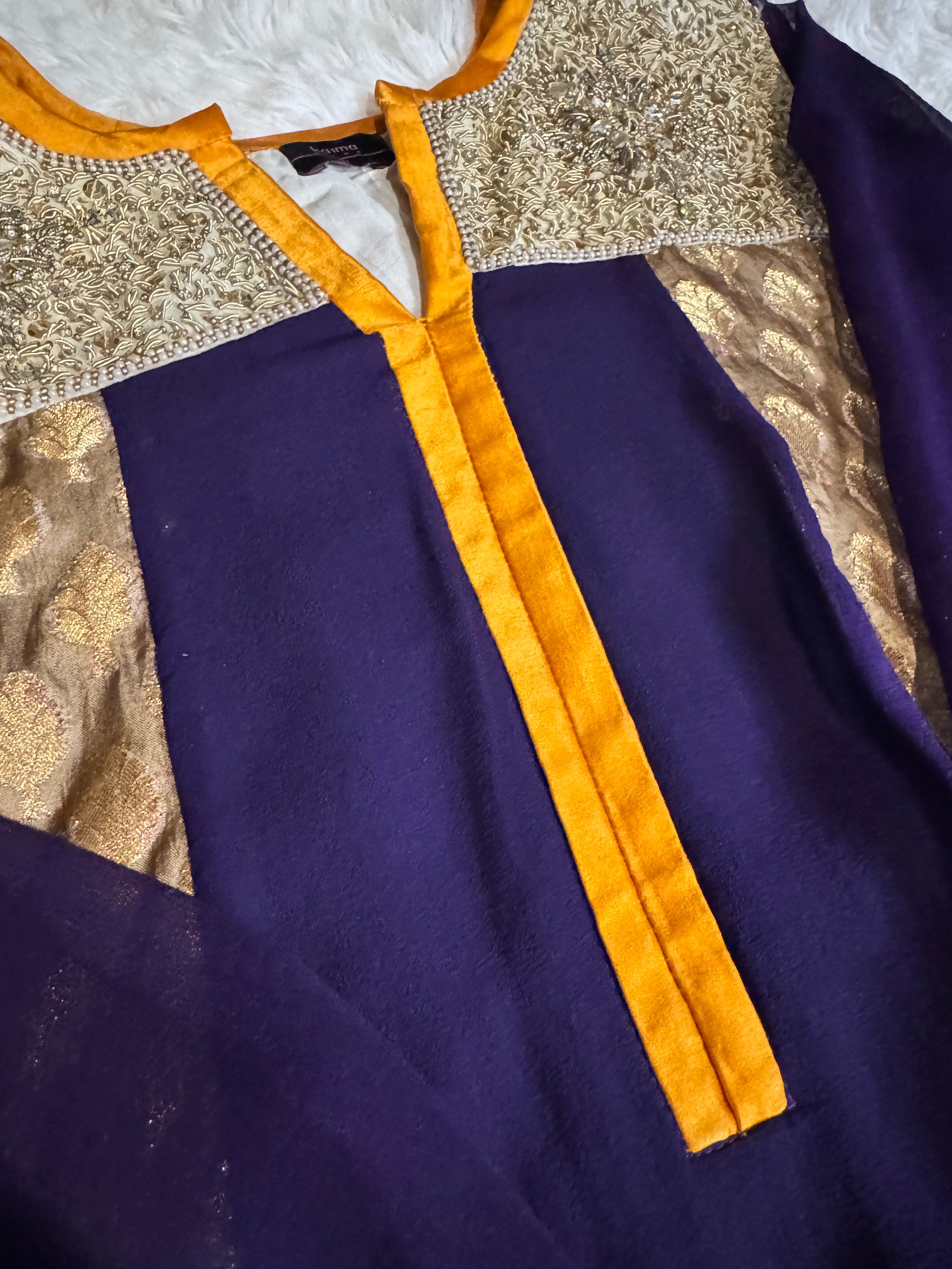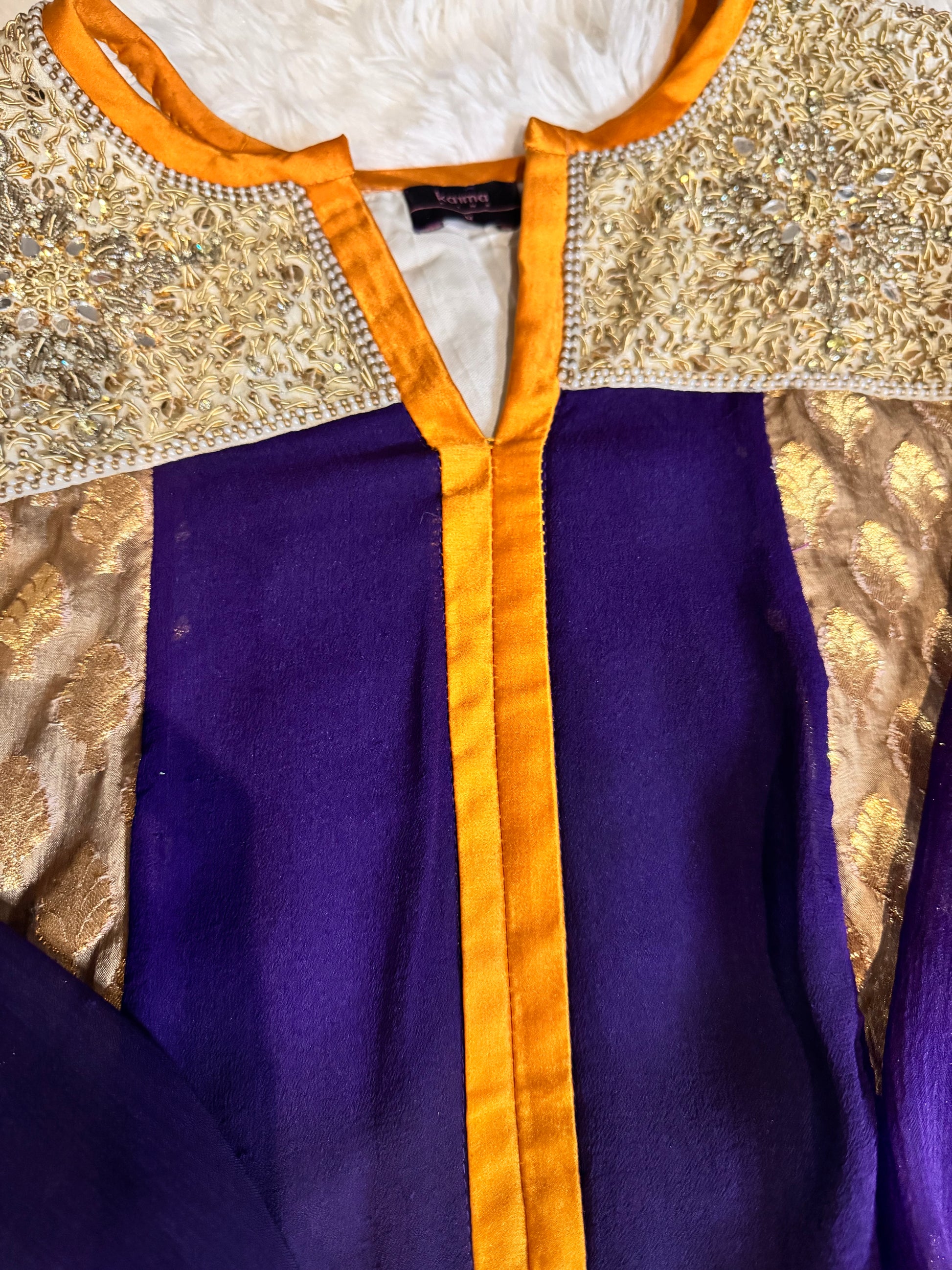 Purple Chiffon and Jamawar Drop Corner Kameez with Dupatta. Outfit has beautiful embroidery with sequin and bead work on the front and back of neckline - shirt only, can be paired with golden bottoms for the perfect wedding/party look!