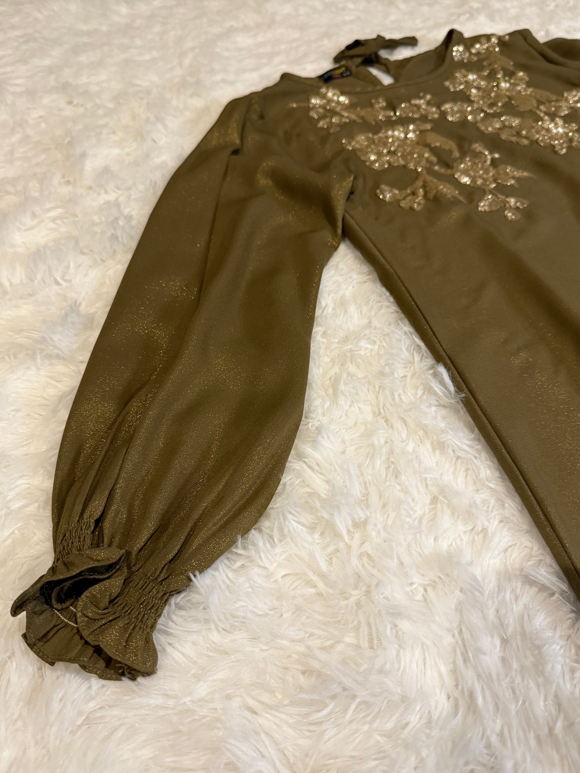 Bronze metallic color with Gold and white accents, sleeve has elastic cuff and back neck tie style