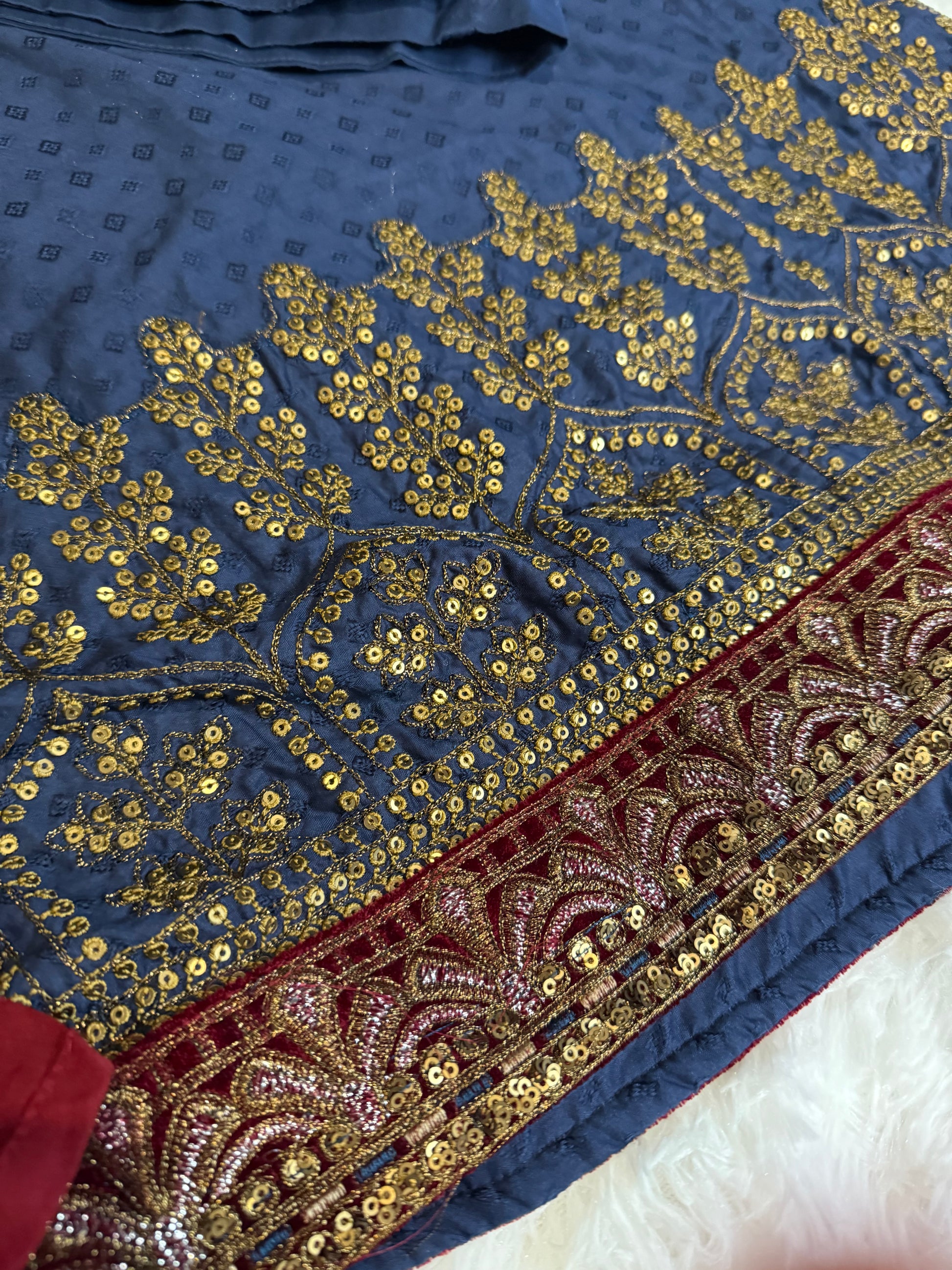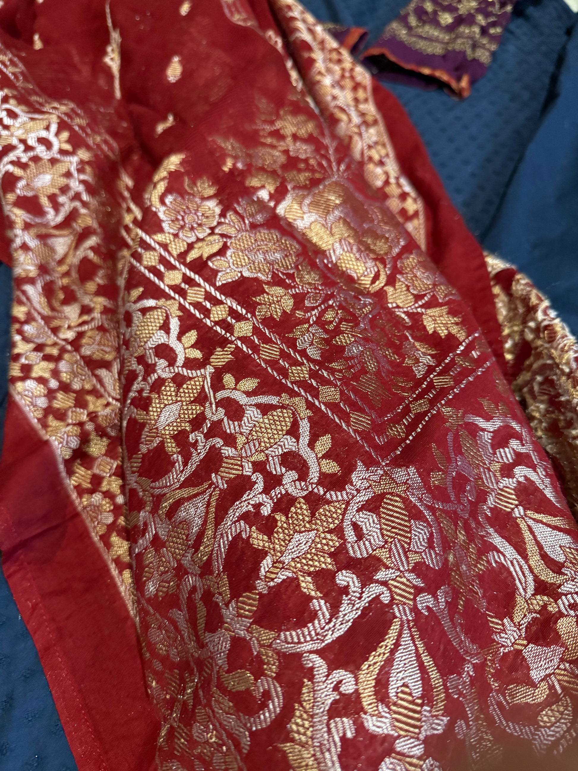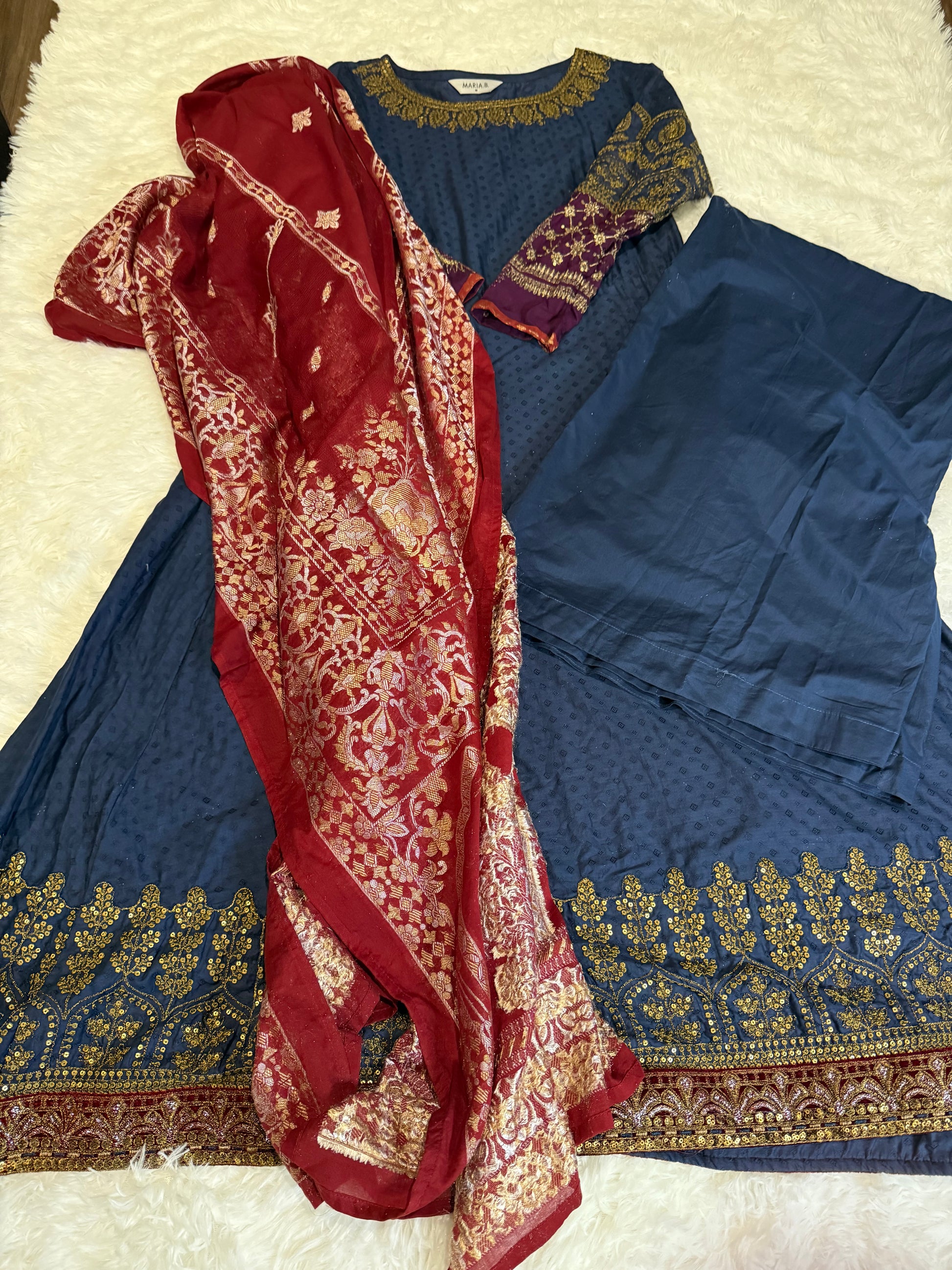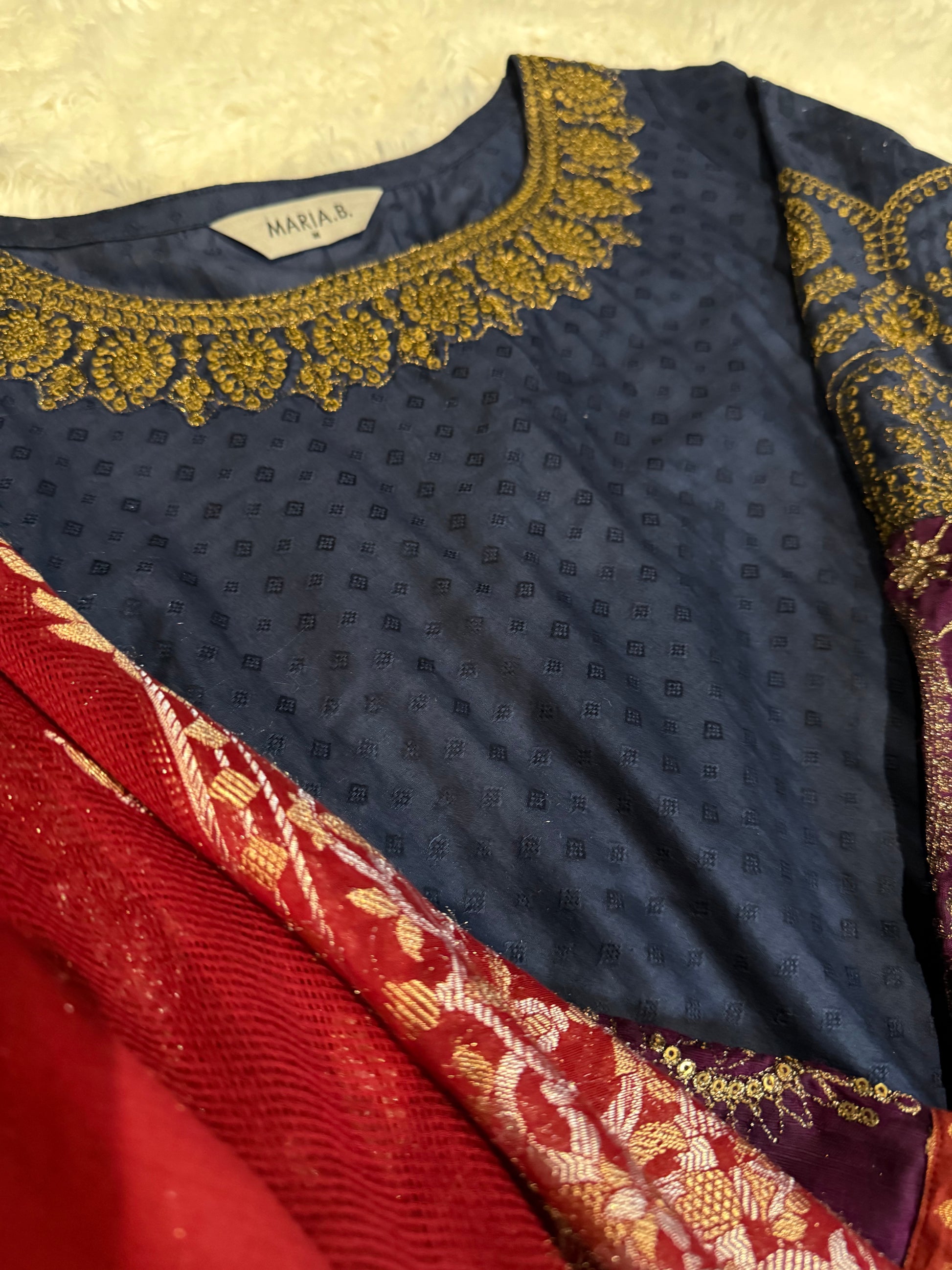 Beautiful Maria B 3 Piece Blue with Full Size Red Chaddar & Pants. Shirt has sequin work and golden embroidery throughout.