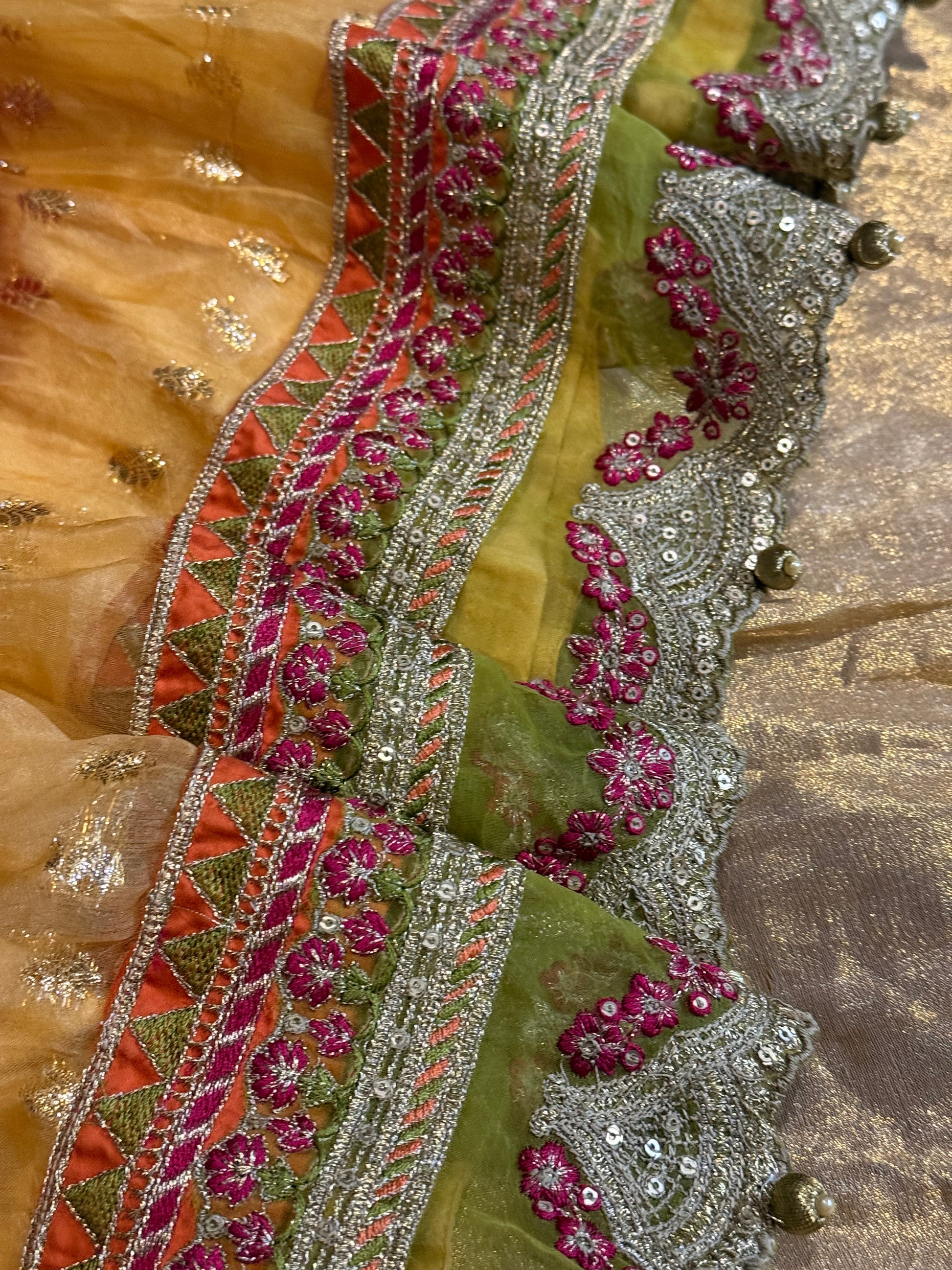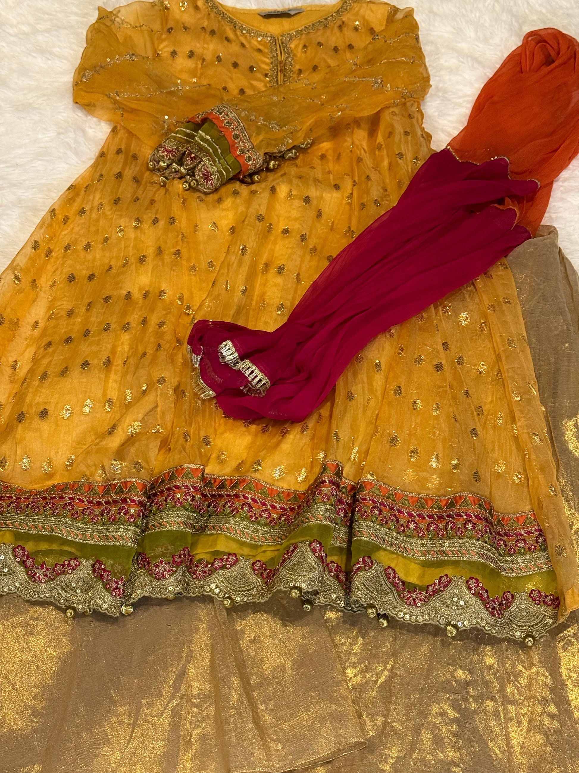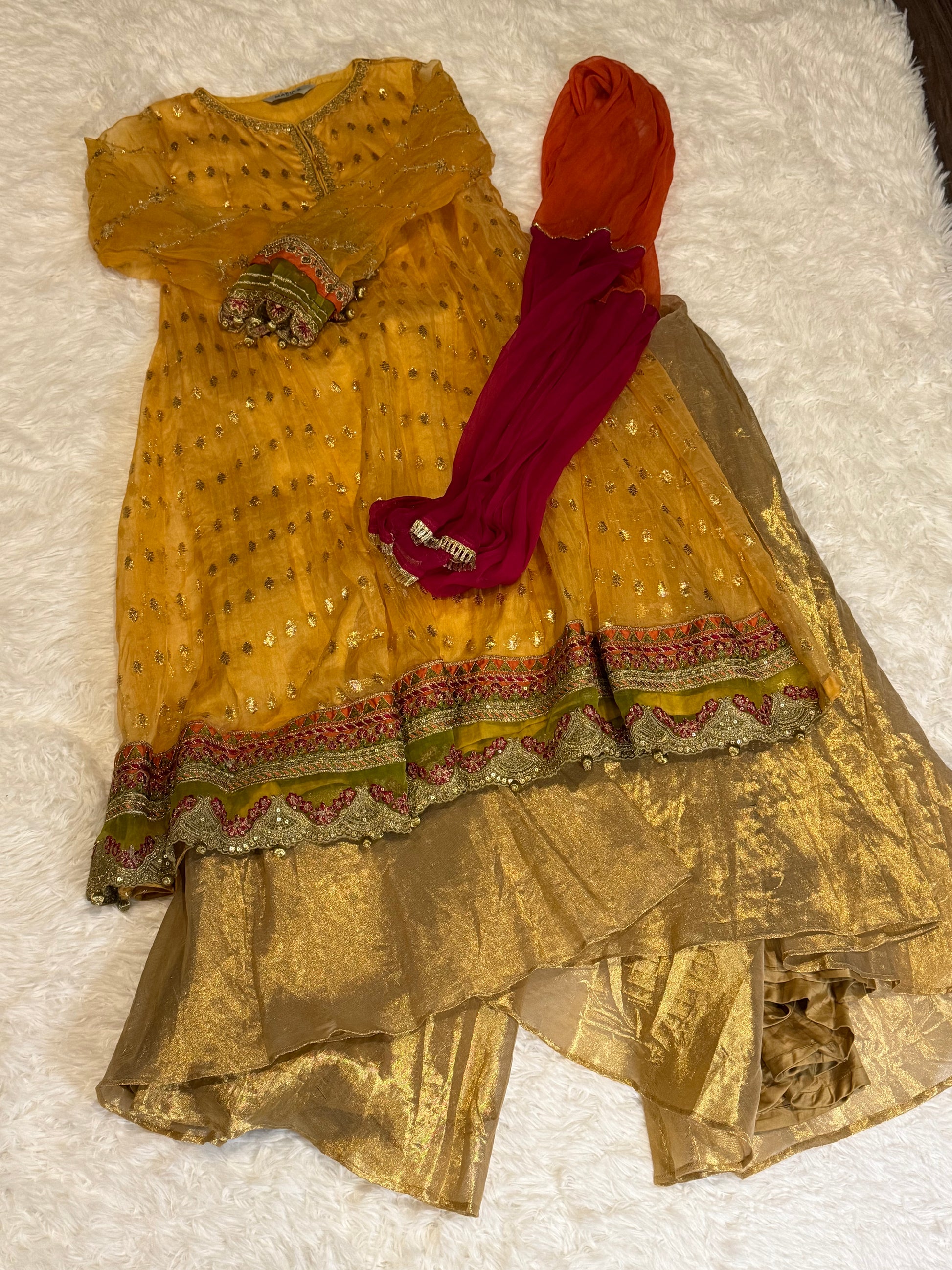 Beautiful Sharara set with Chiffon Dupatta. Perfect for Mehendi or other Festive Occasion. Shimmery stiff organza with lining and Chiffon Dupatta with metallic edging.