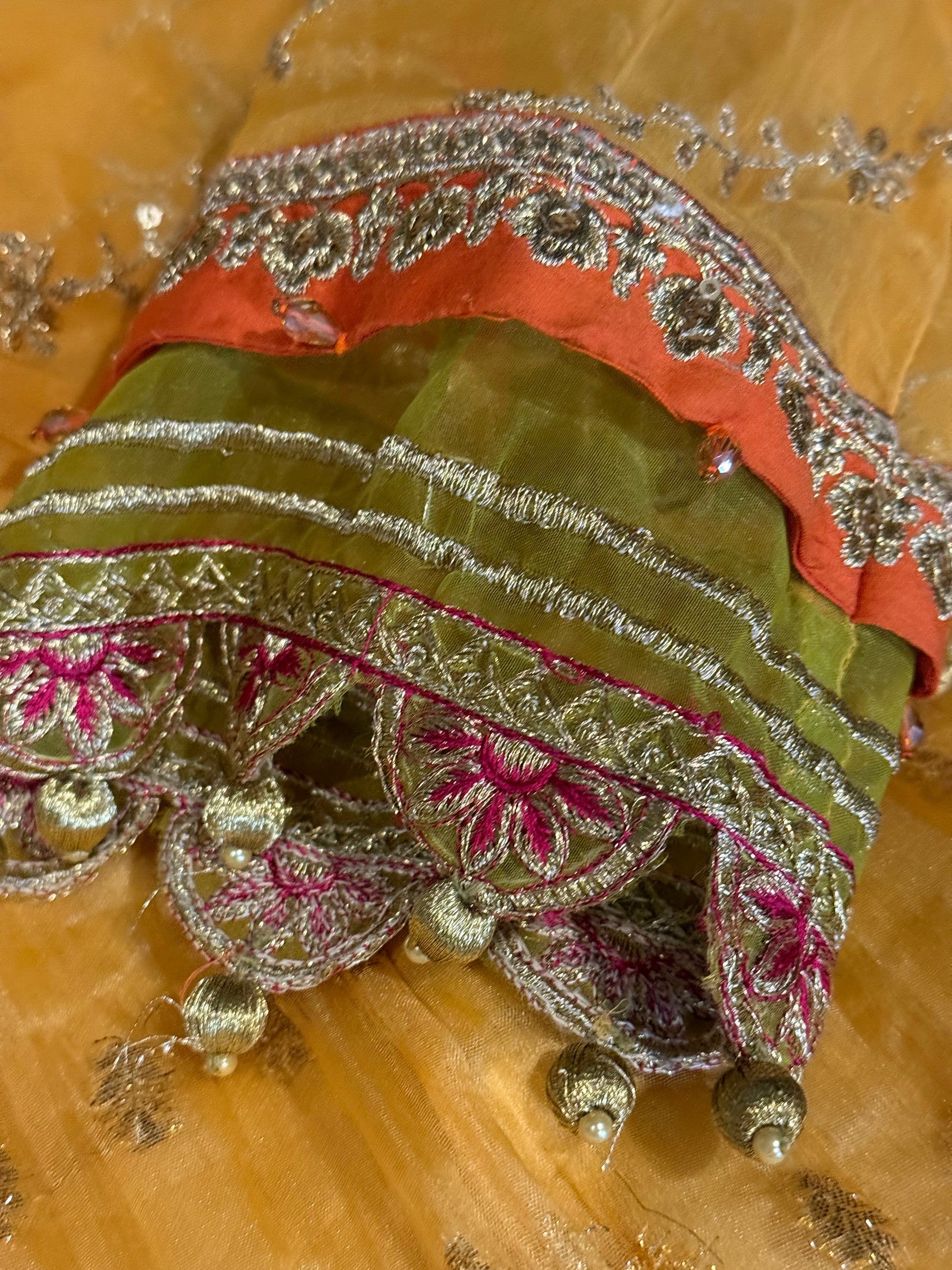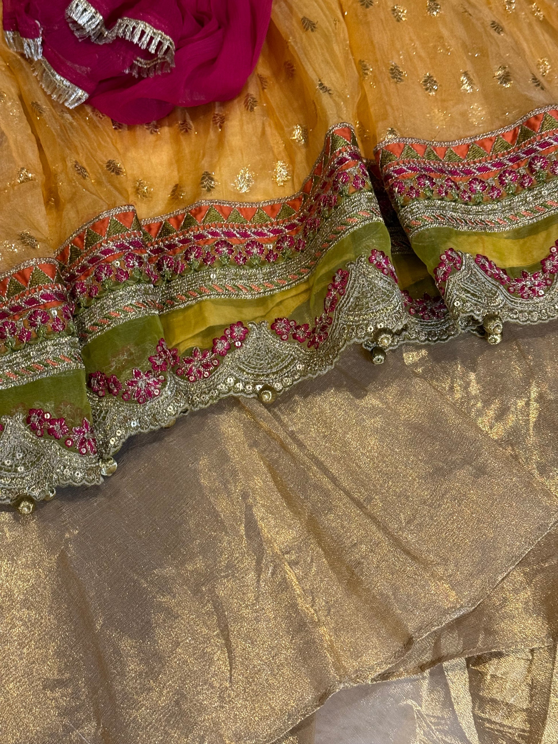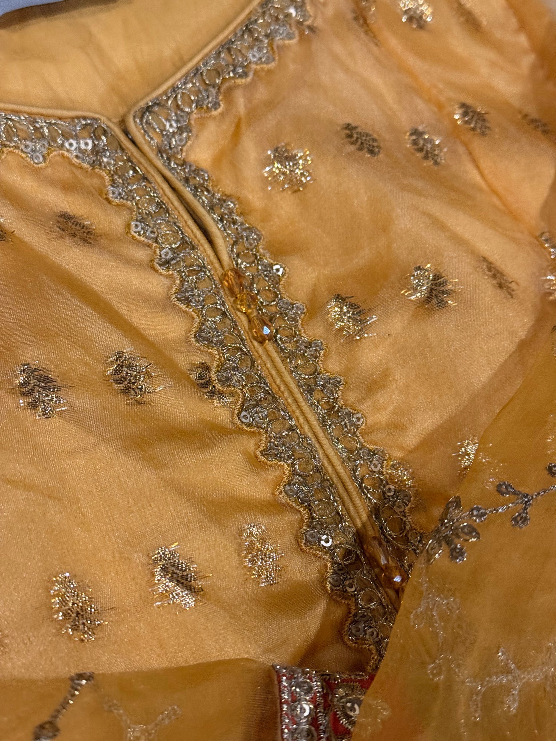 Beautiful Sharara set with Chiffon Dupatta. Perfect for Mehendi or other Festive Occasion. Shimmery stiff organza with lining and Chiffon Dupatta with metallic edging.