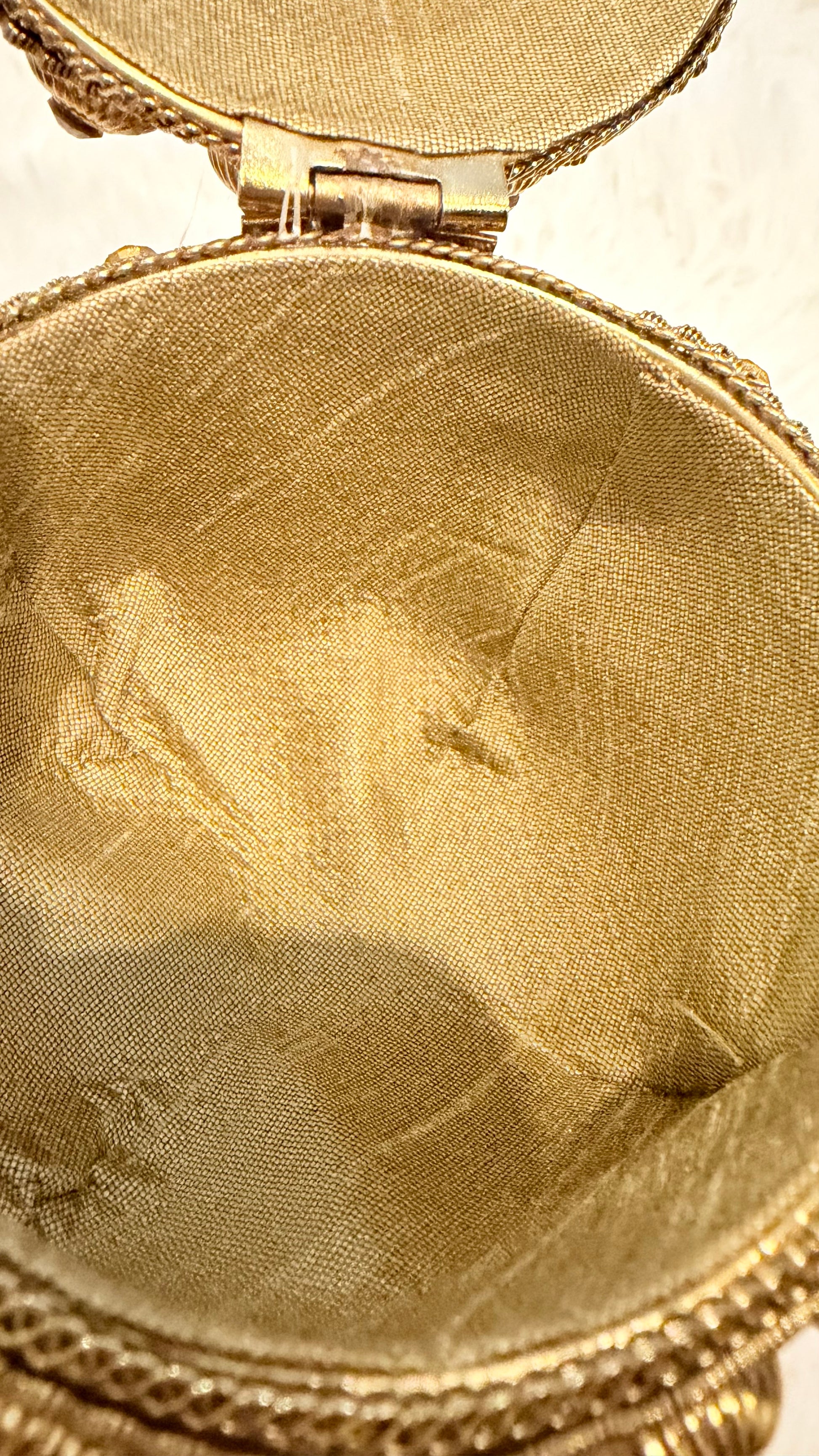 Antique/Dull Golden color bag with fabric interior and intricate design on bag.
