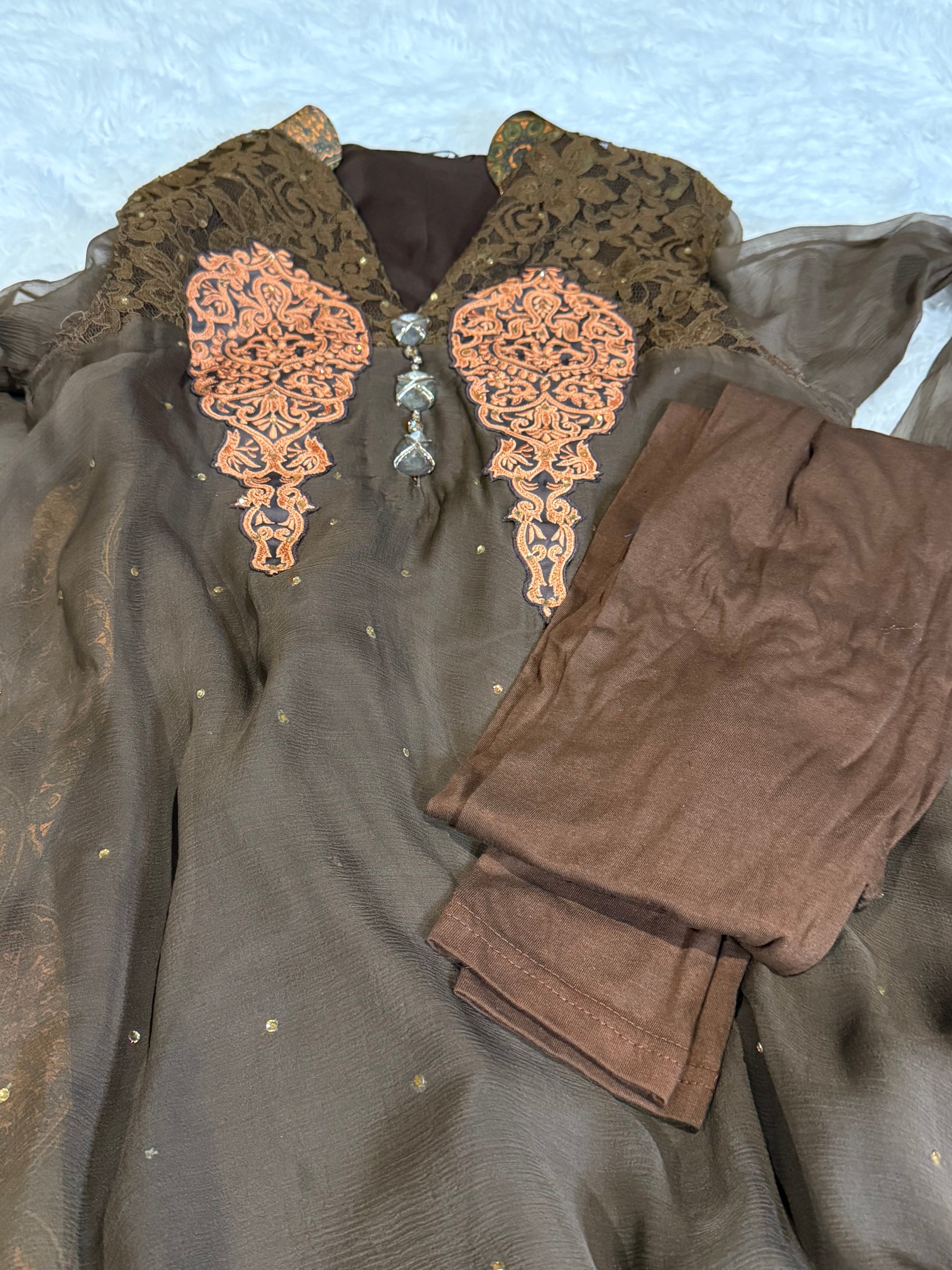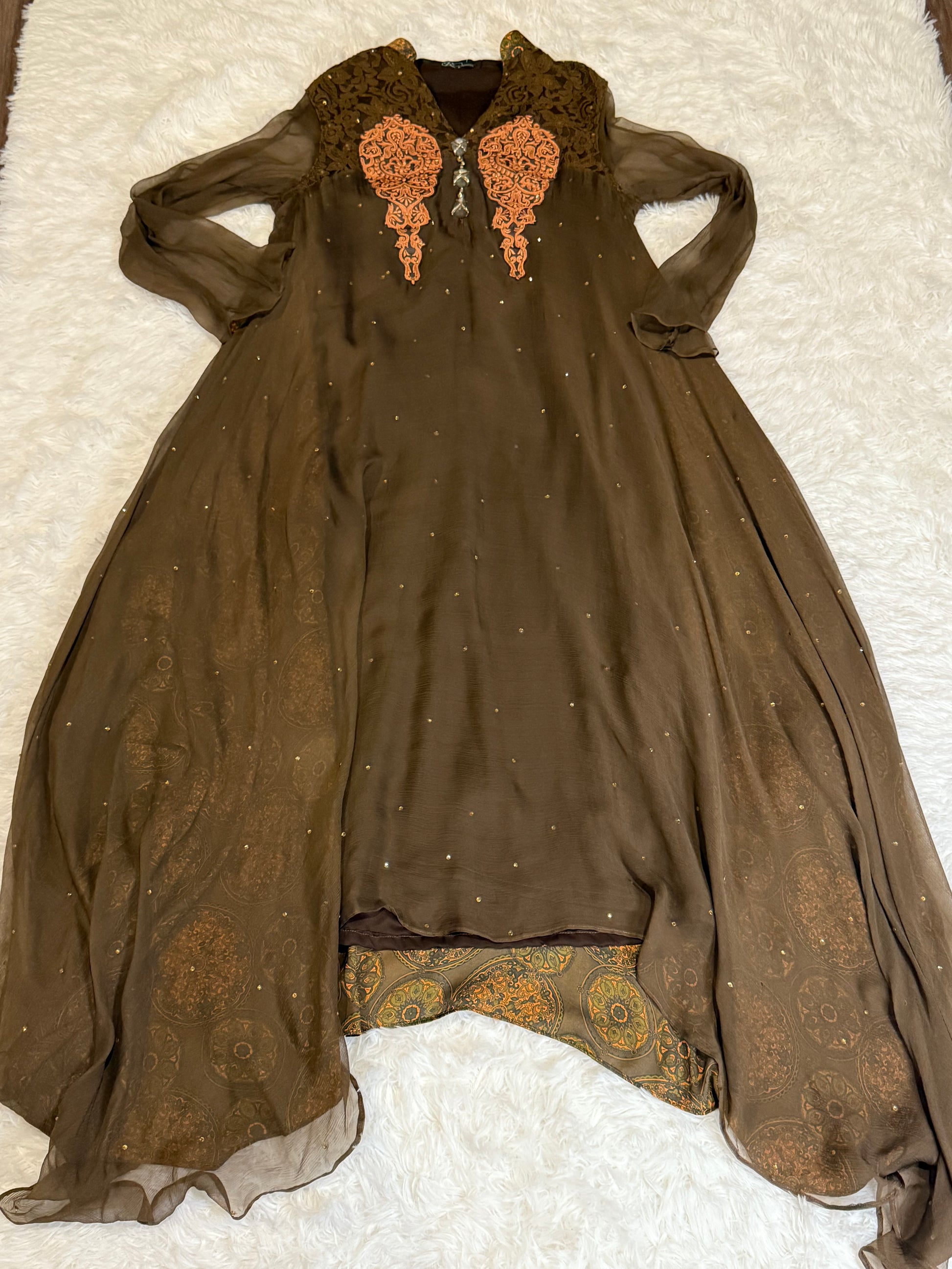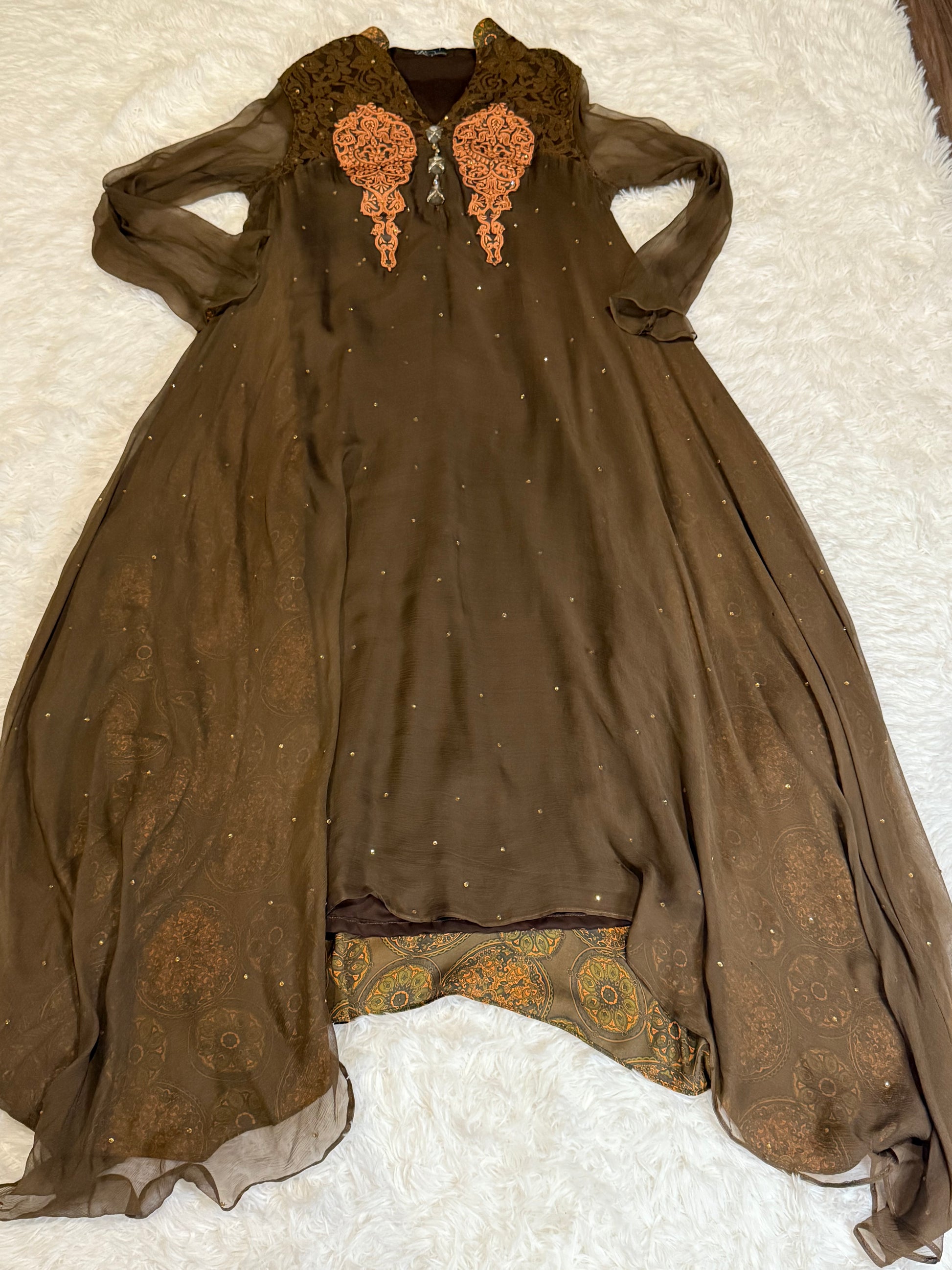Beautiful Gown with Stones on Chiffon Front, has Silk Back with Contrast in Orange. Stones on Neckline with Orange Embroidery. Comes with Brown Tights.