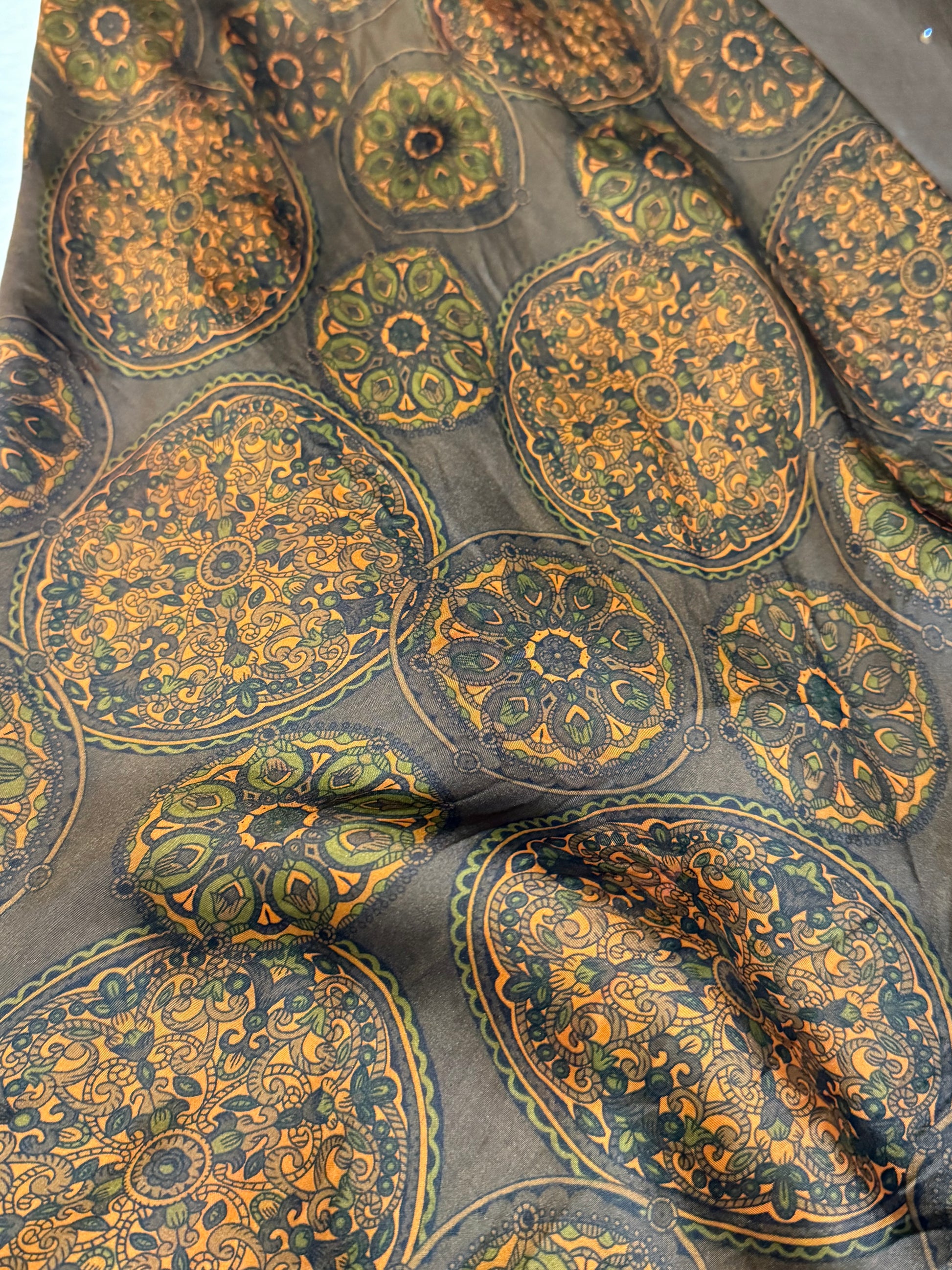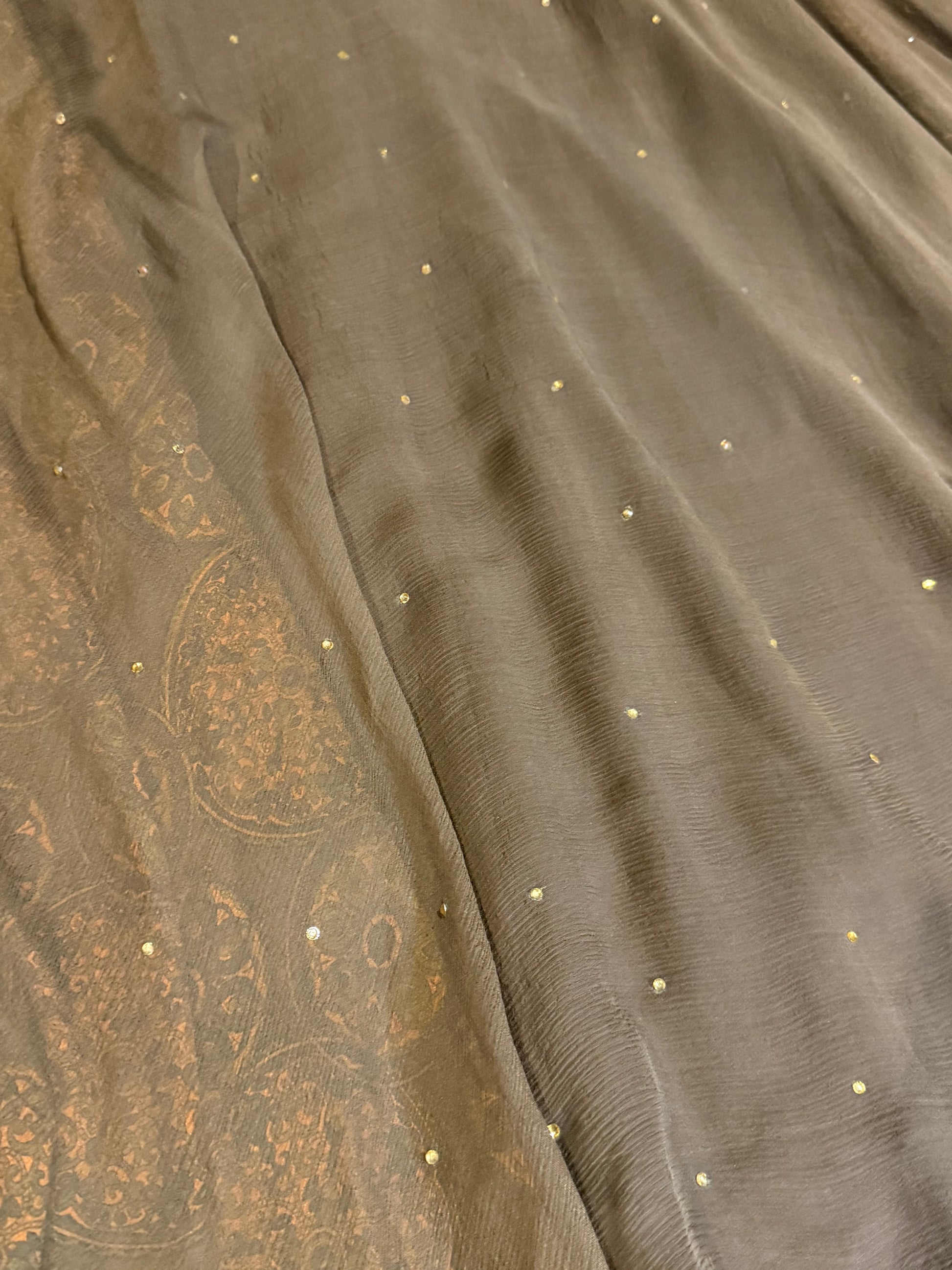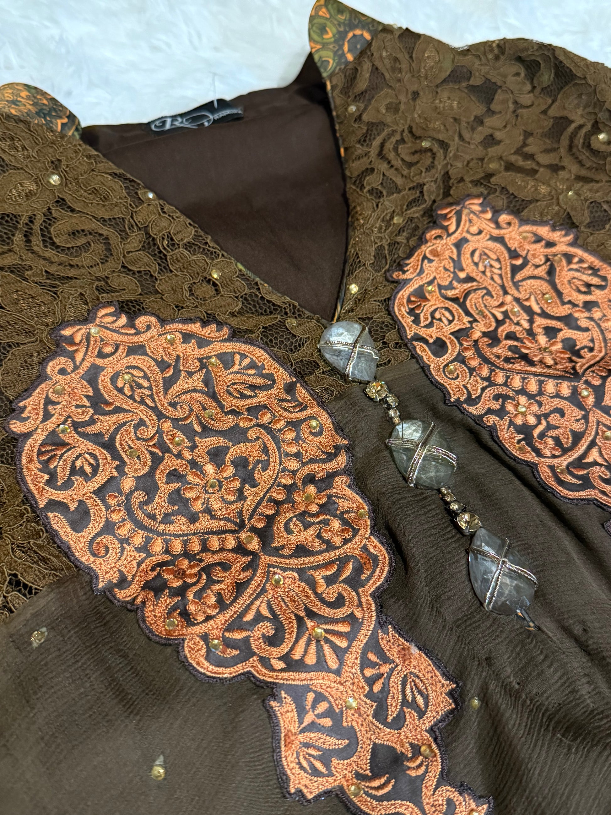 Beautiful Gown with Stones on Chiffon Front, has Silk Back with Contrast in Orange. Stones on Neckline with Orange Embroidery. Comes with Brown Tights.