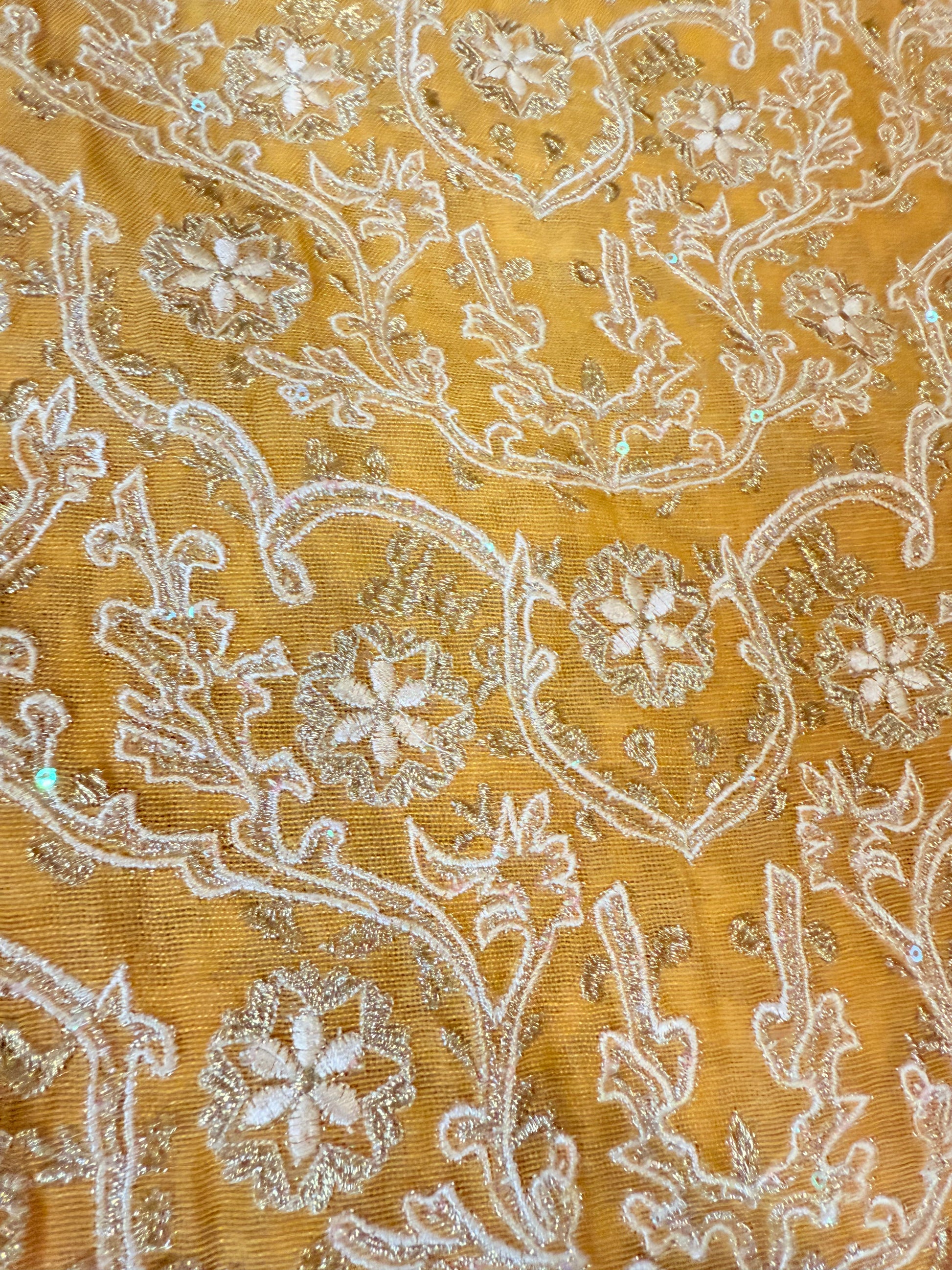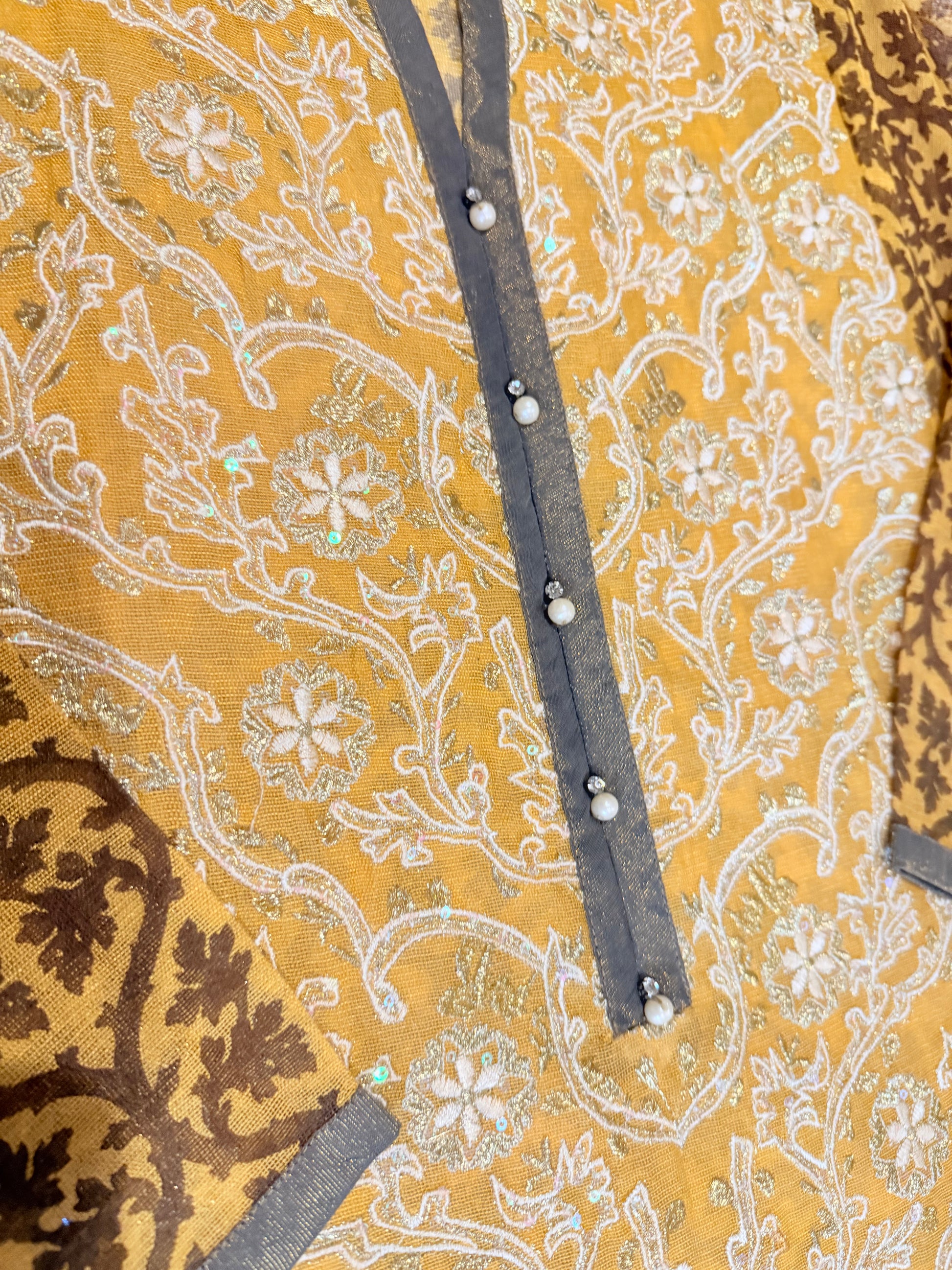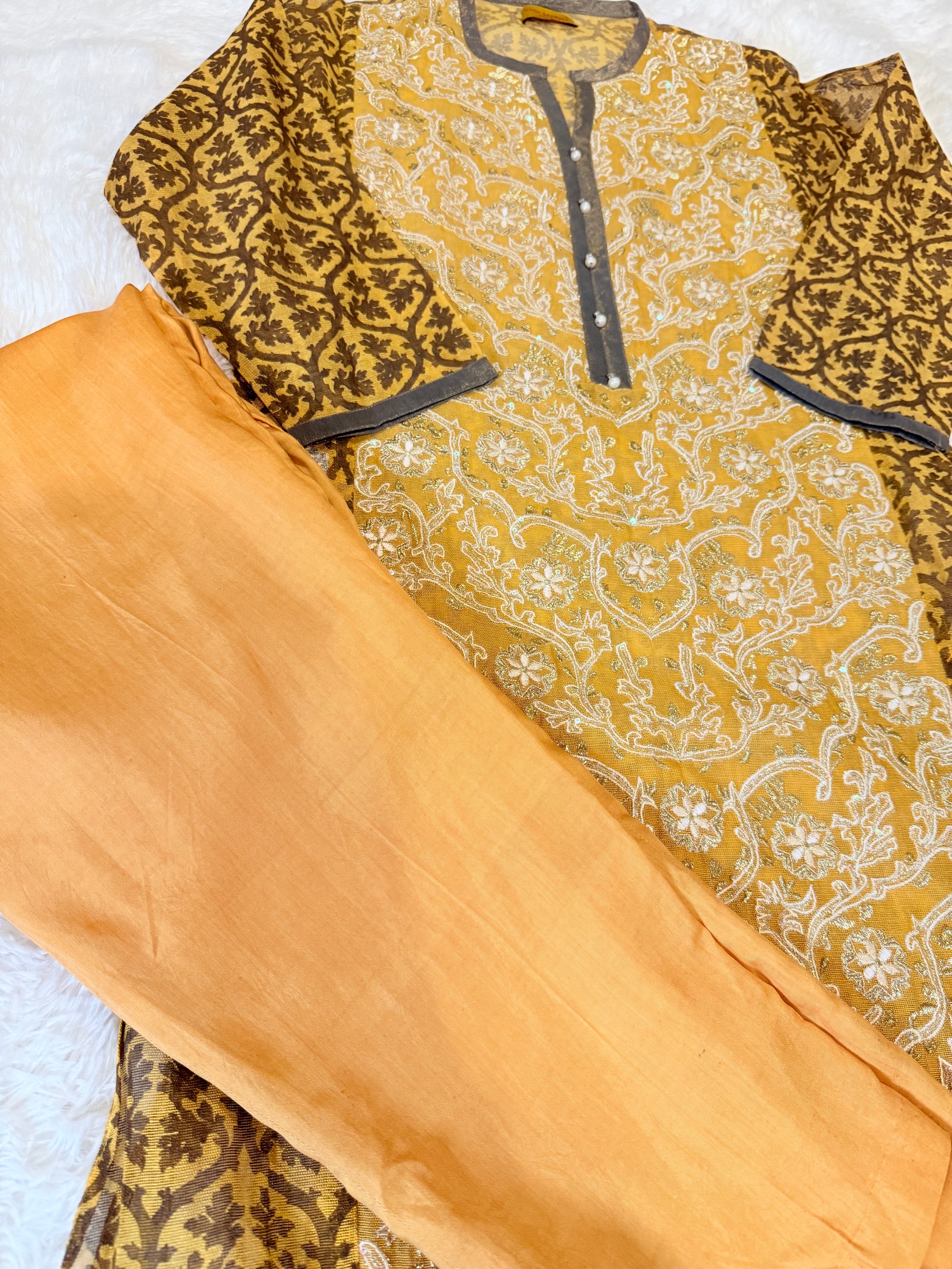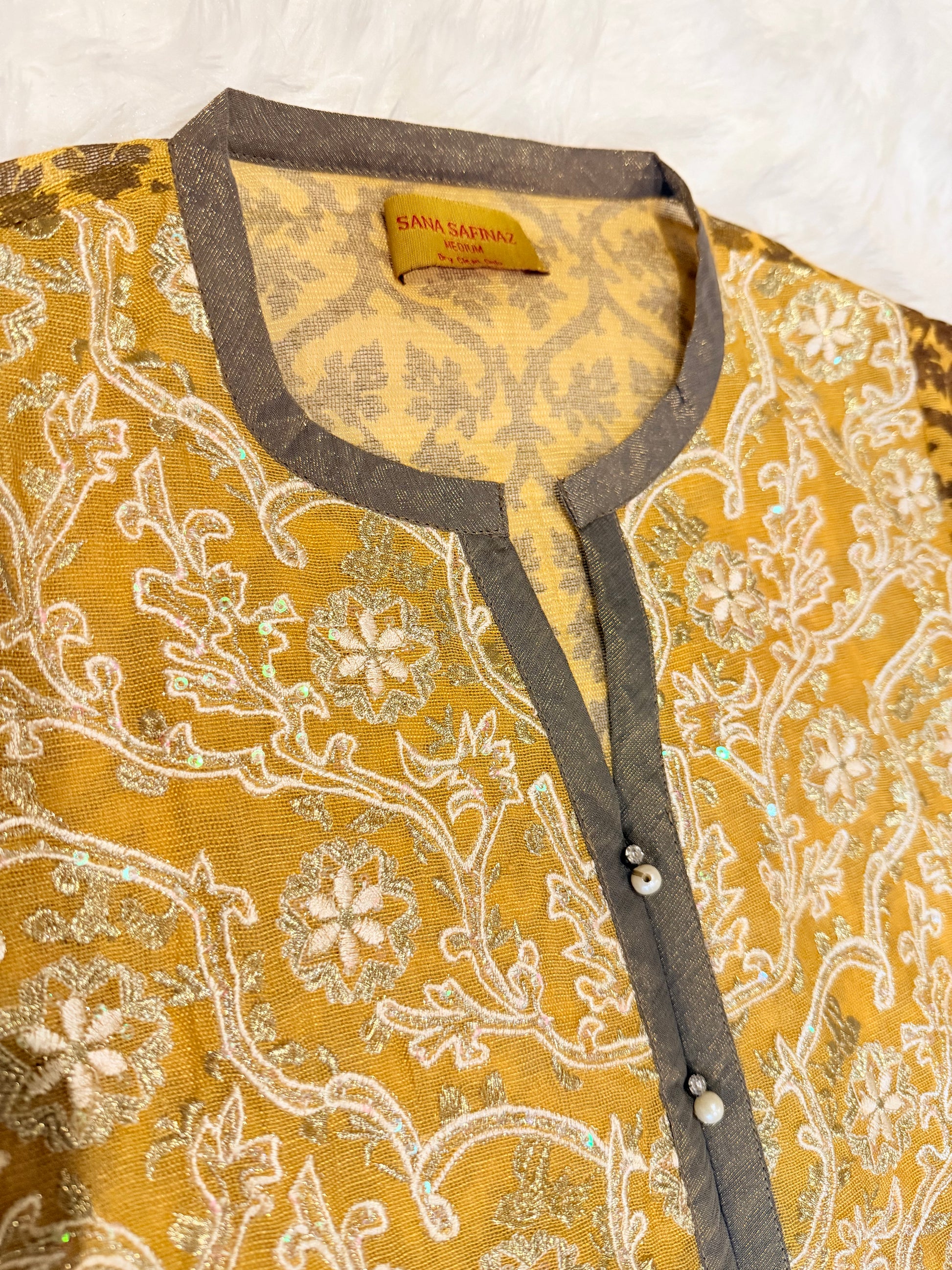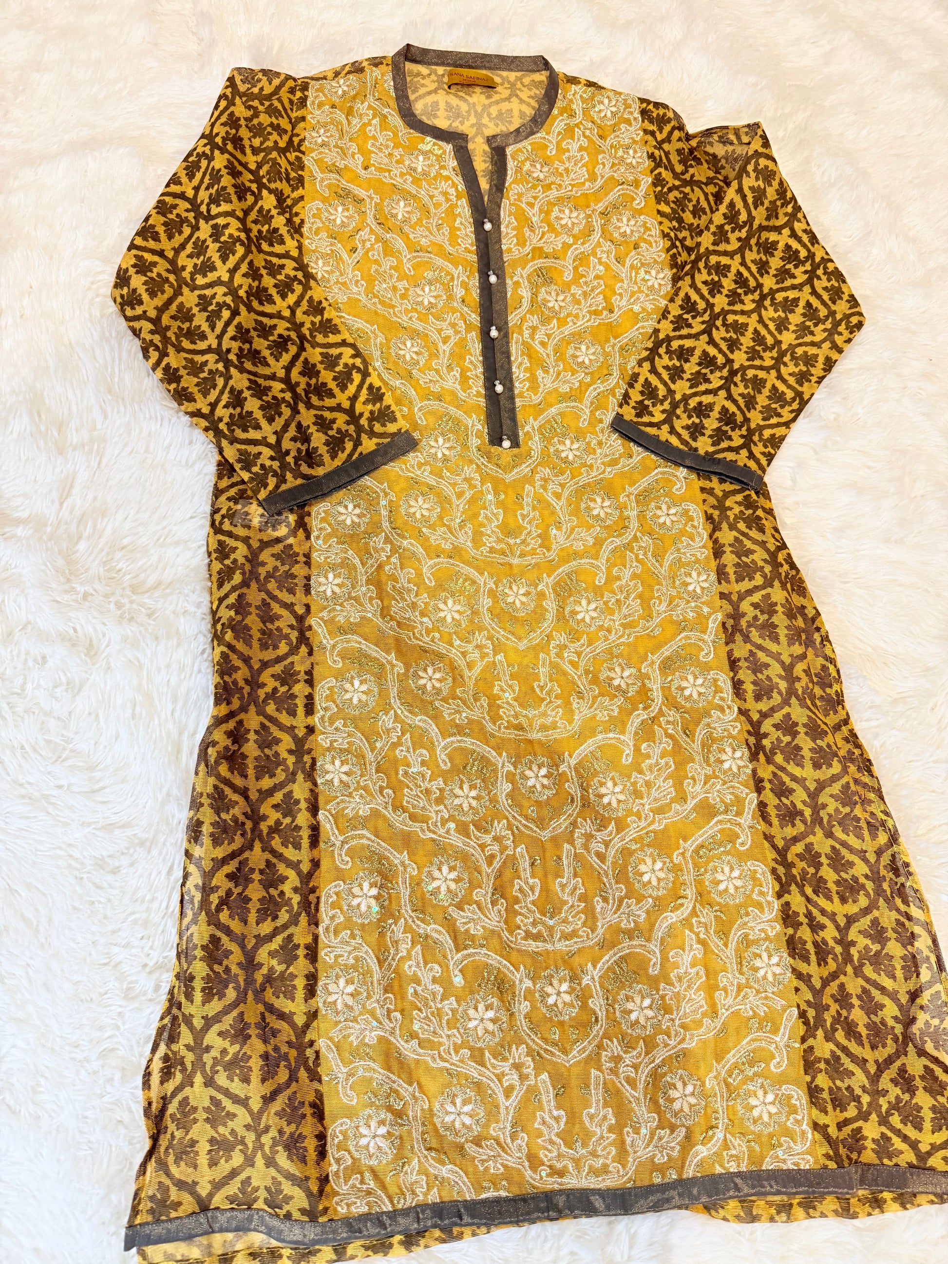 Sana Safinaz 2 Piece Mustard/Brown Cotton Silk Shirt with Metallic threads, sequins and pearls on neckline