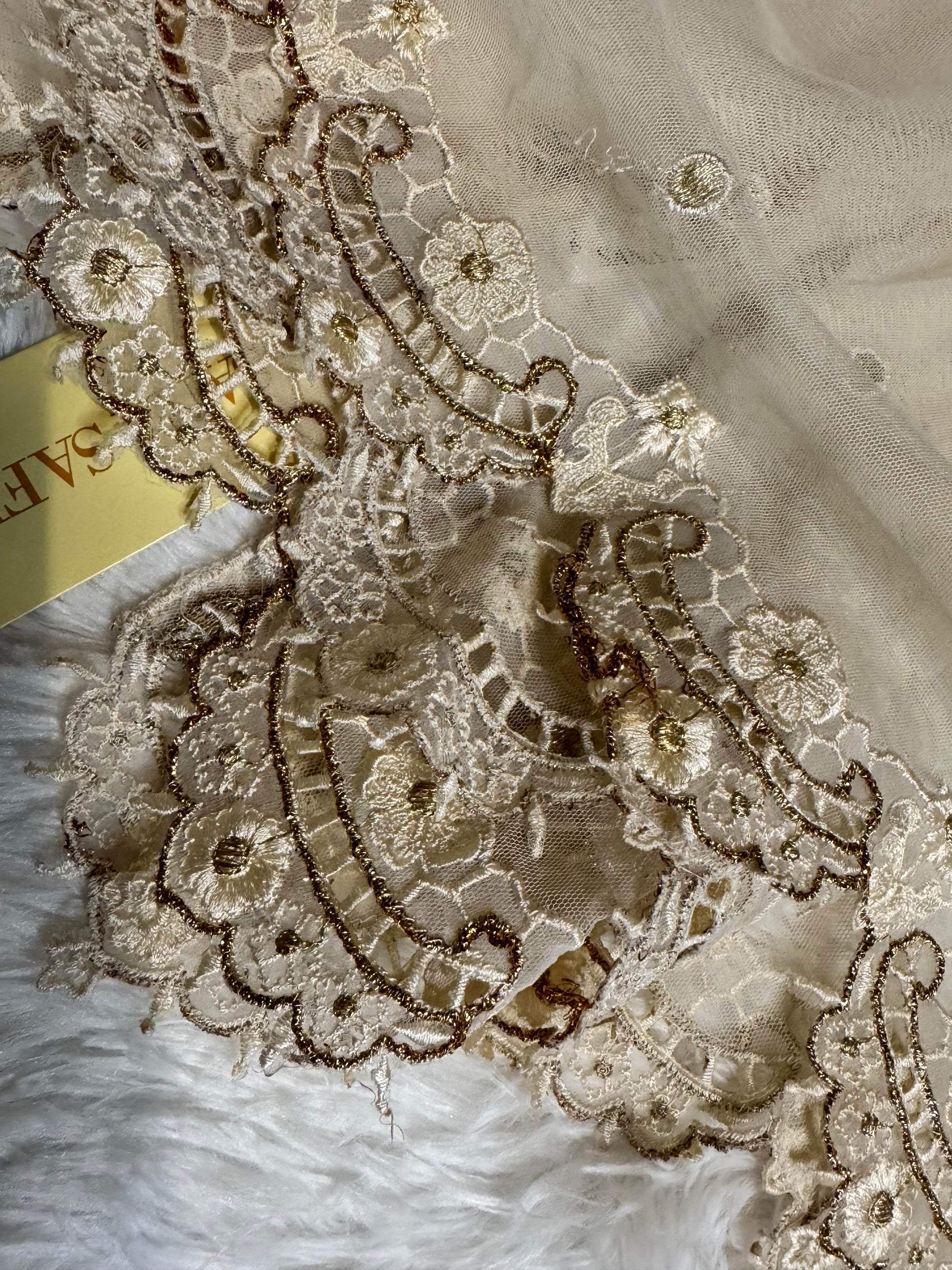 Off White Net Dupatta with Gotta Work and Trim. Has embroidered trim on edges.
