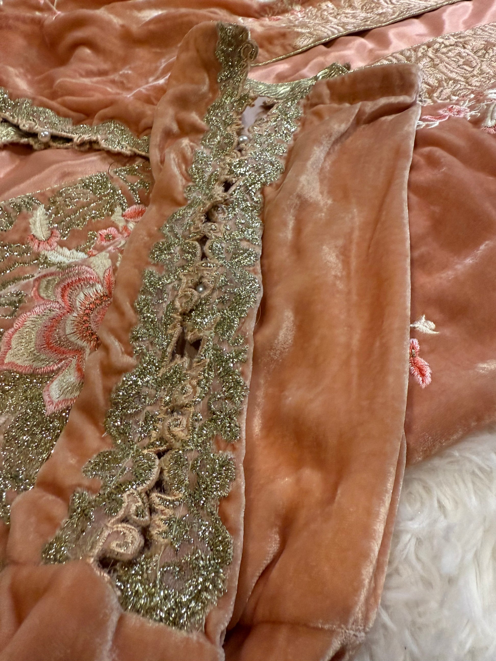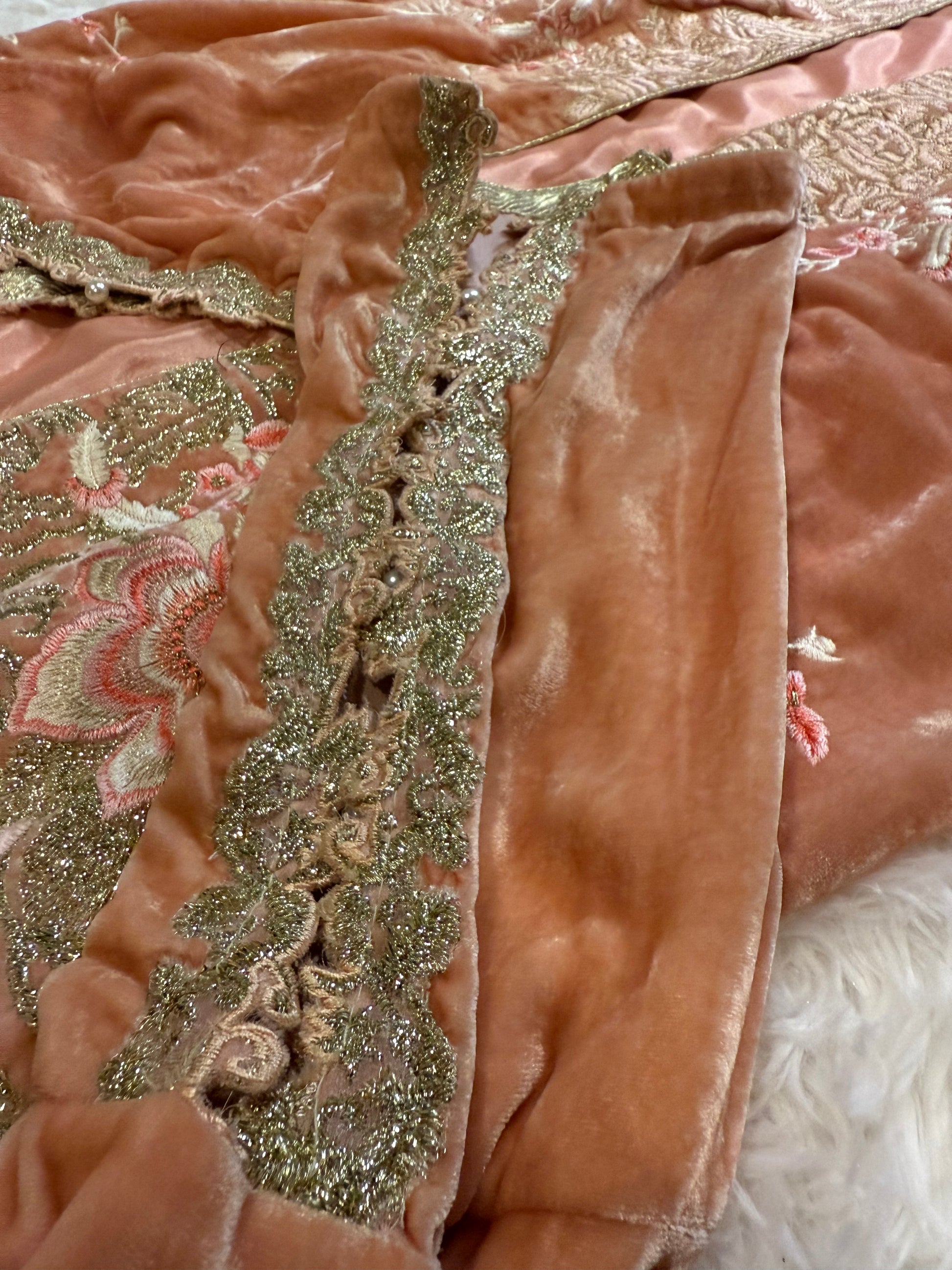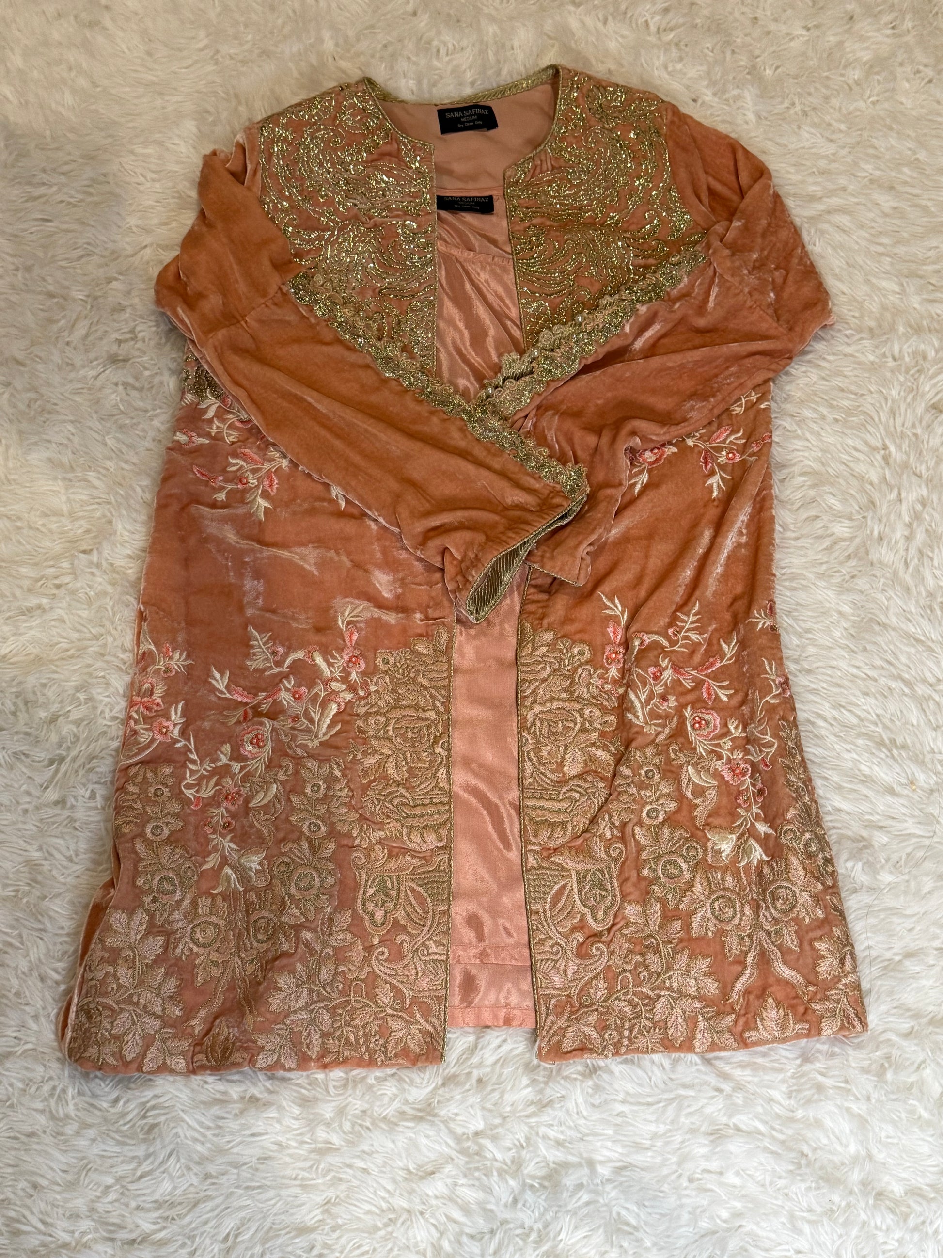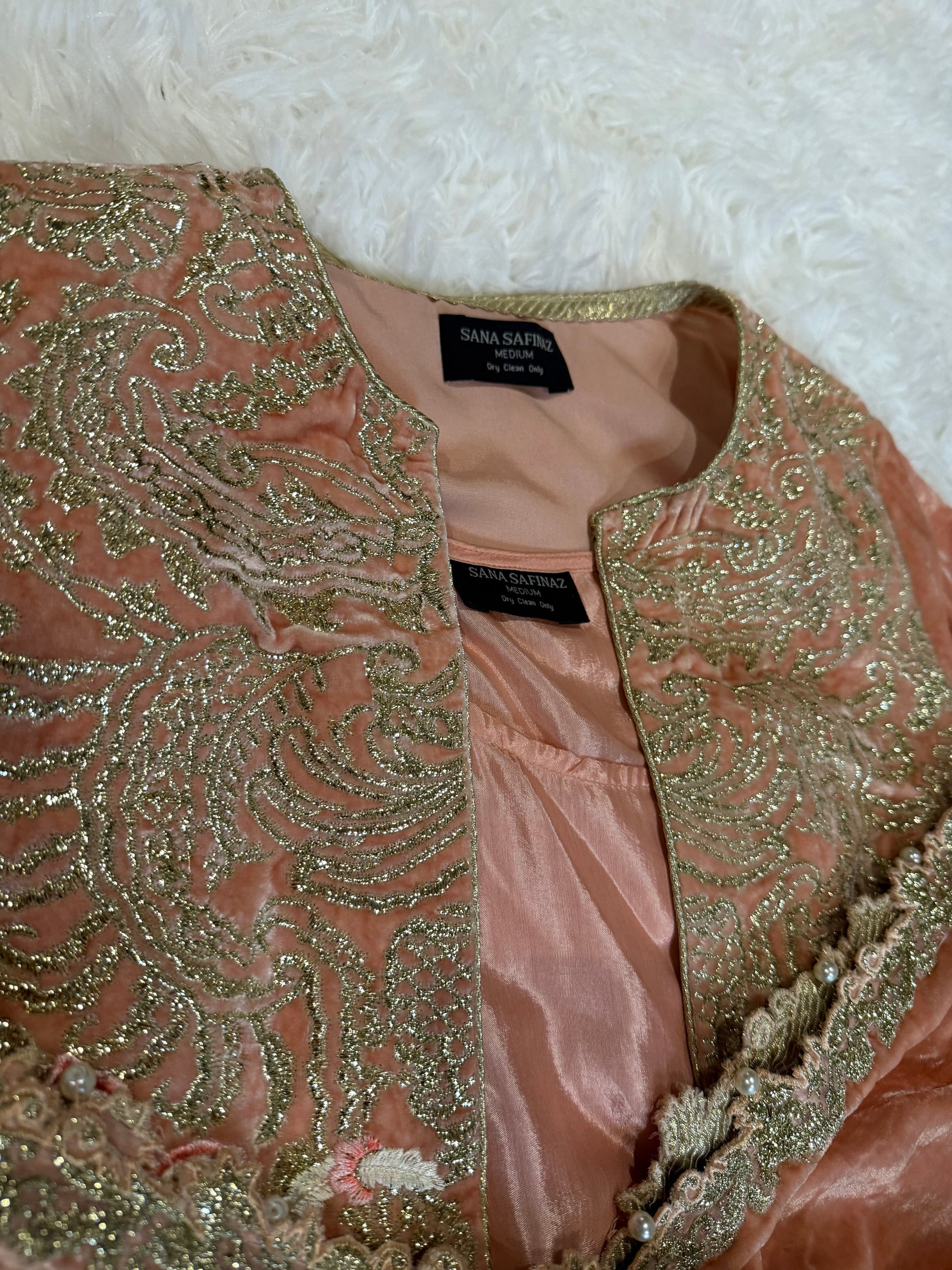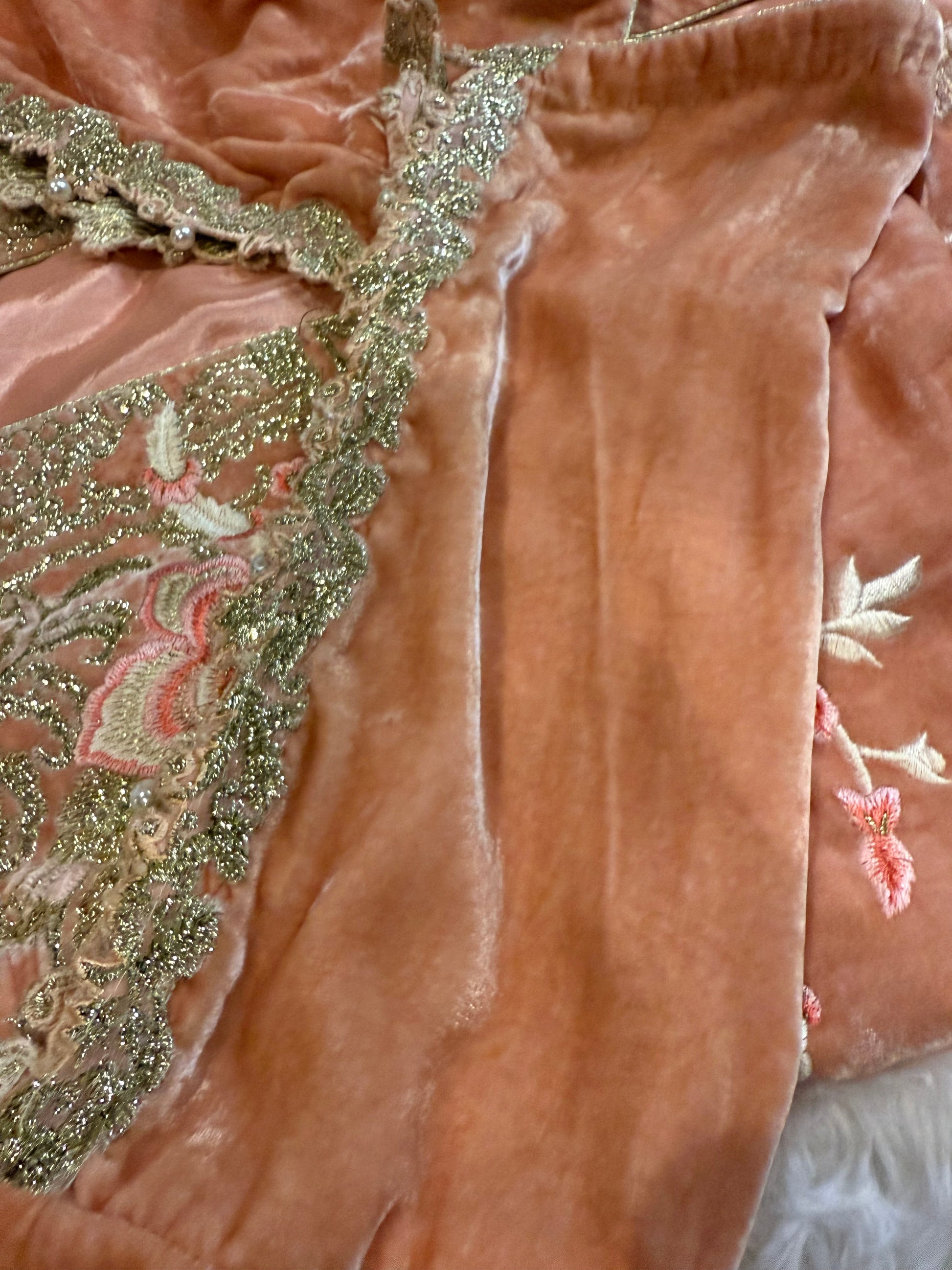 Sana Safinaz Peach Velvet Jacket with Silver, Pink, and White Floral Embroidery.
