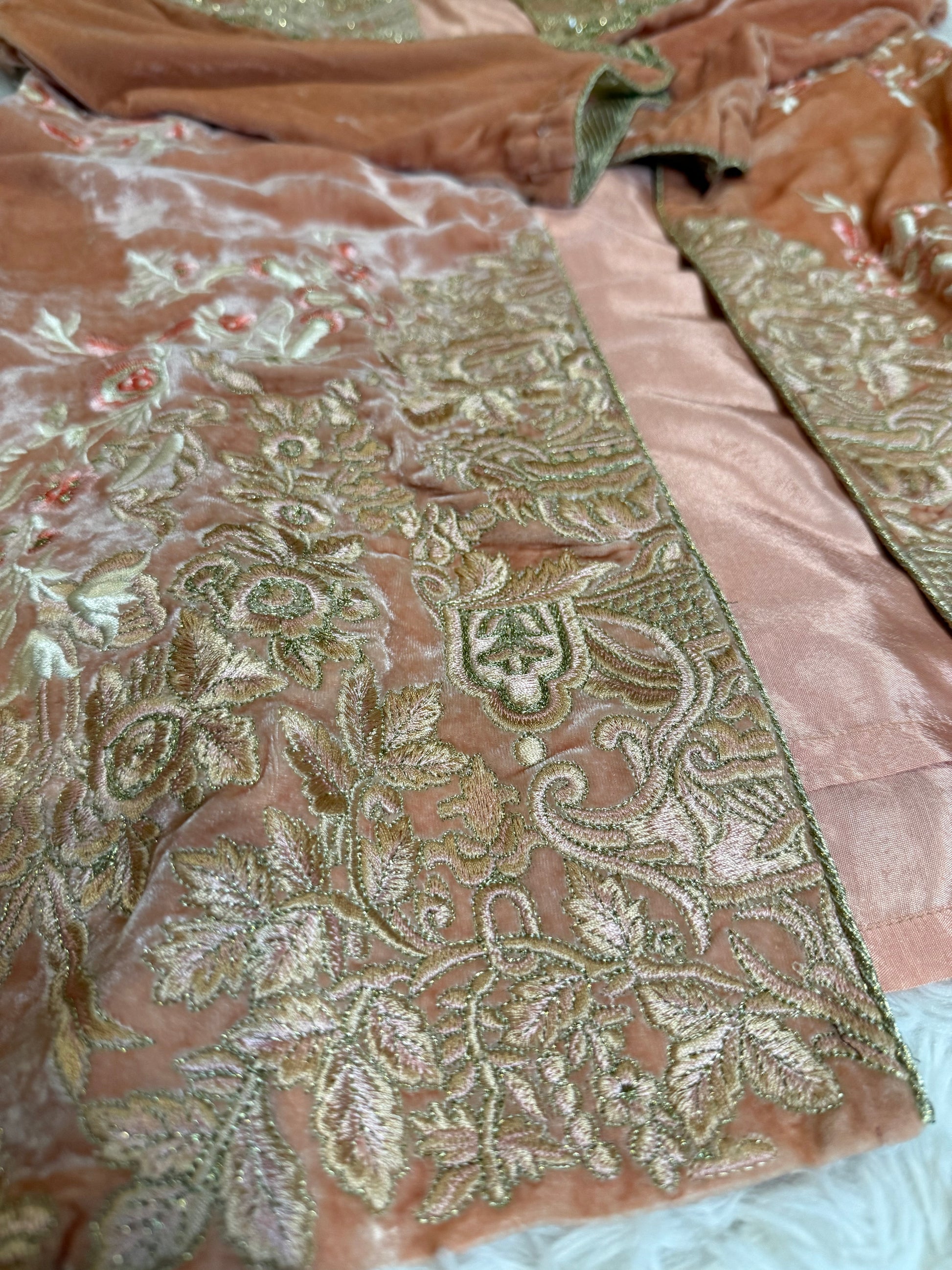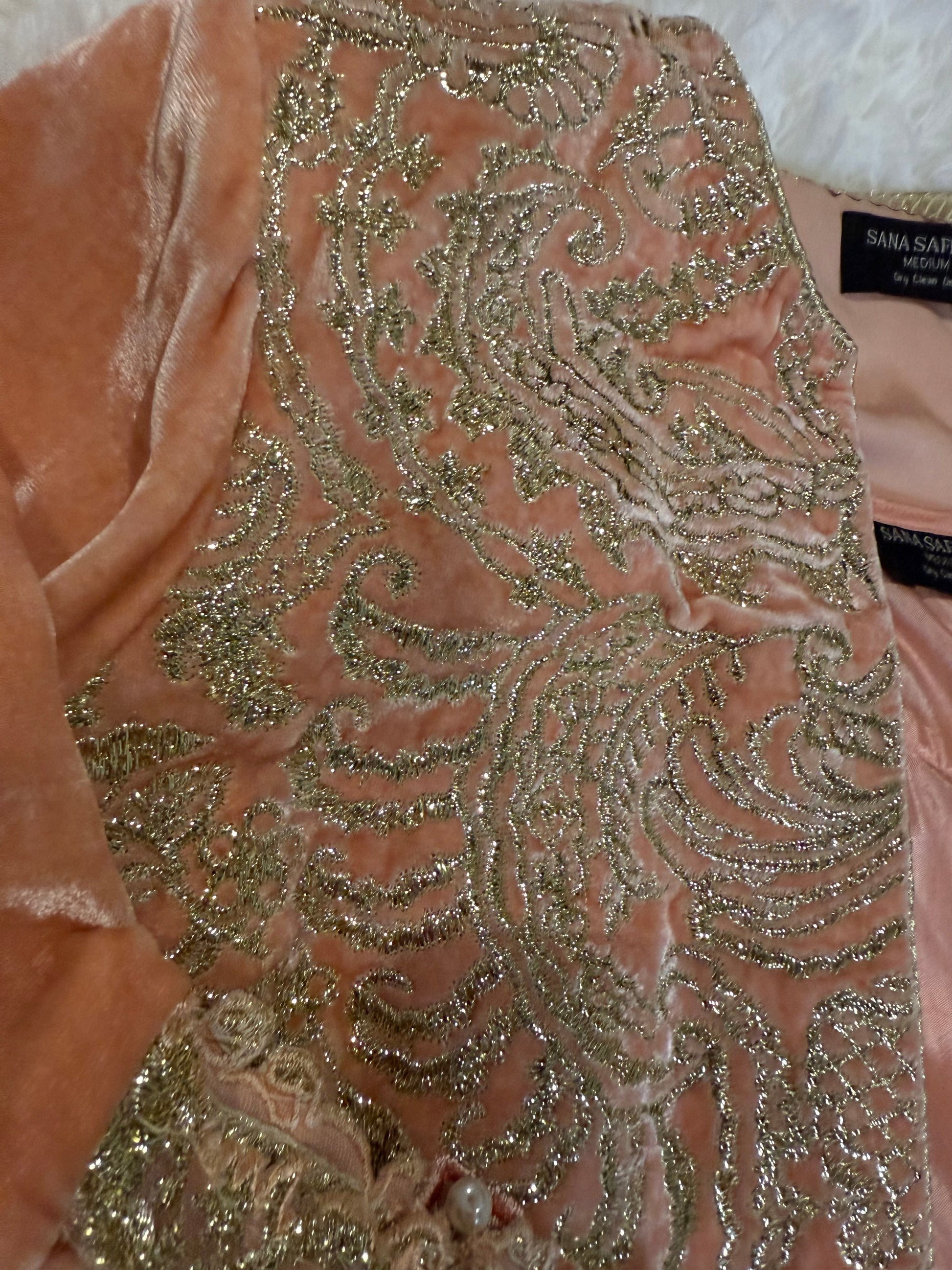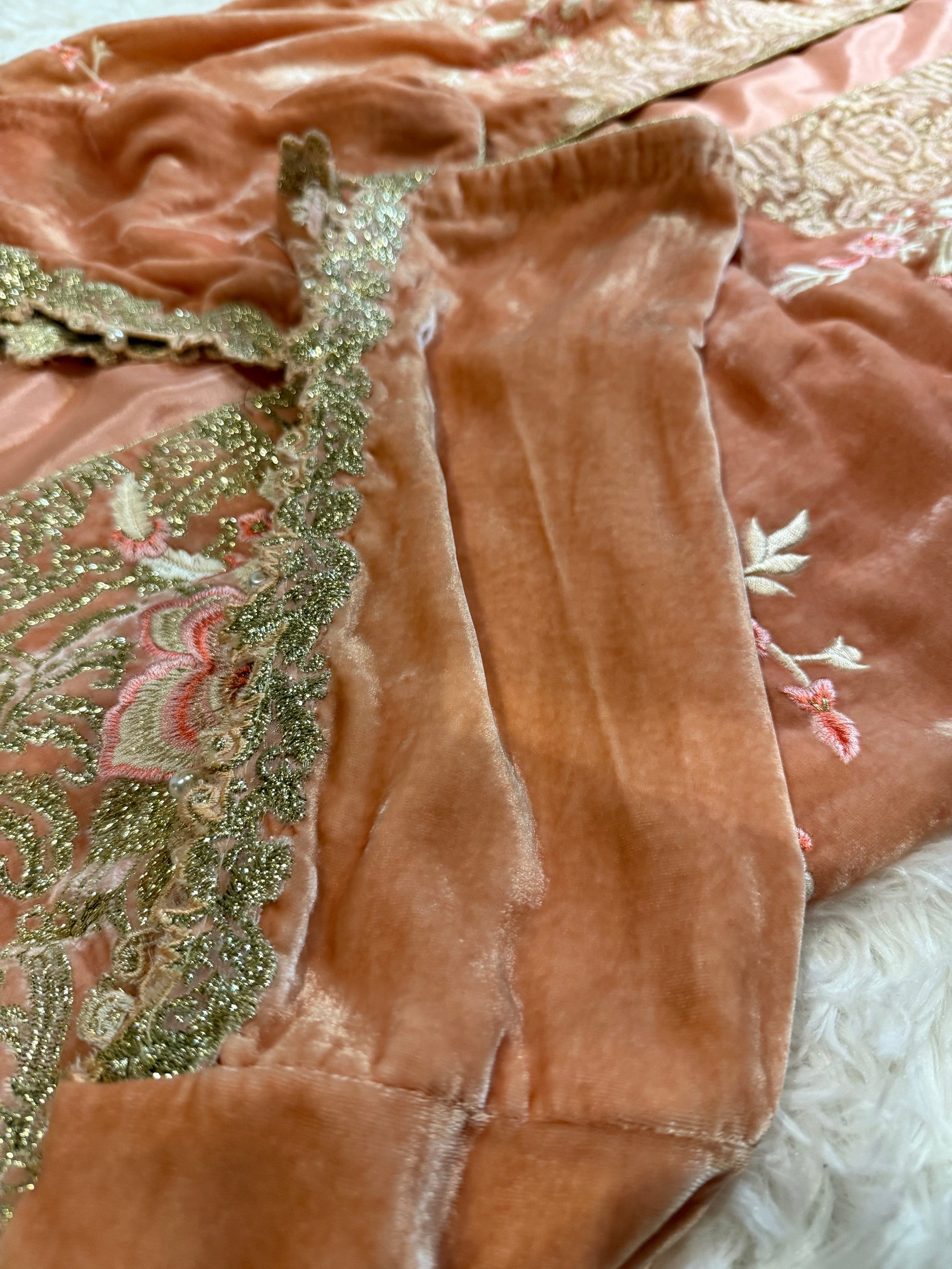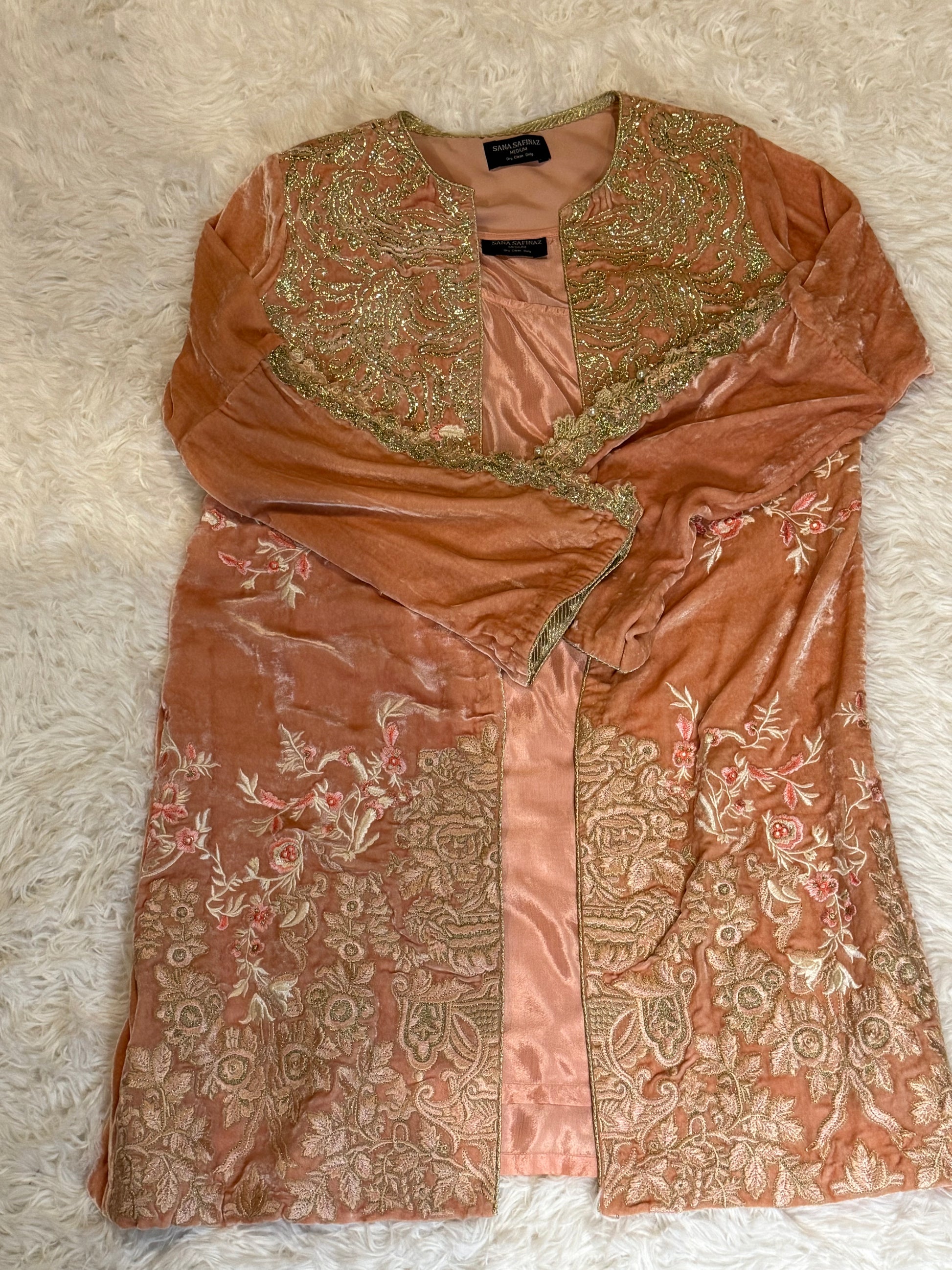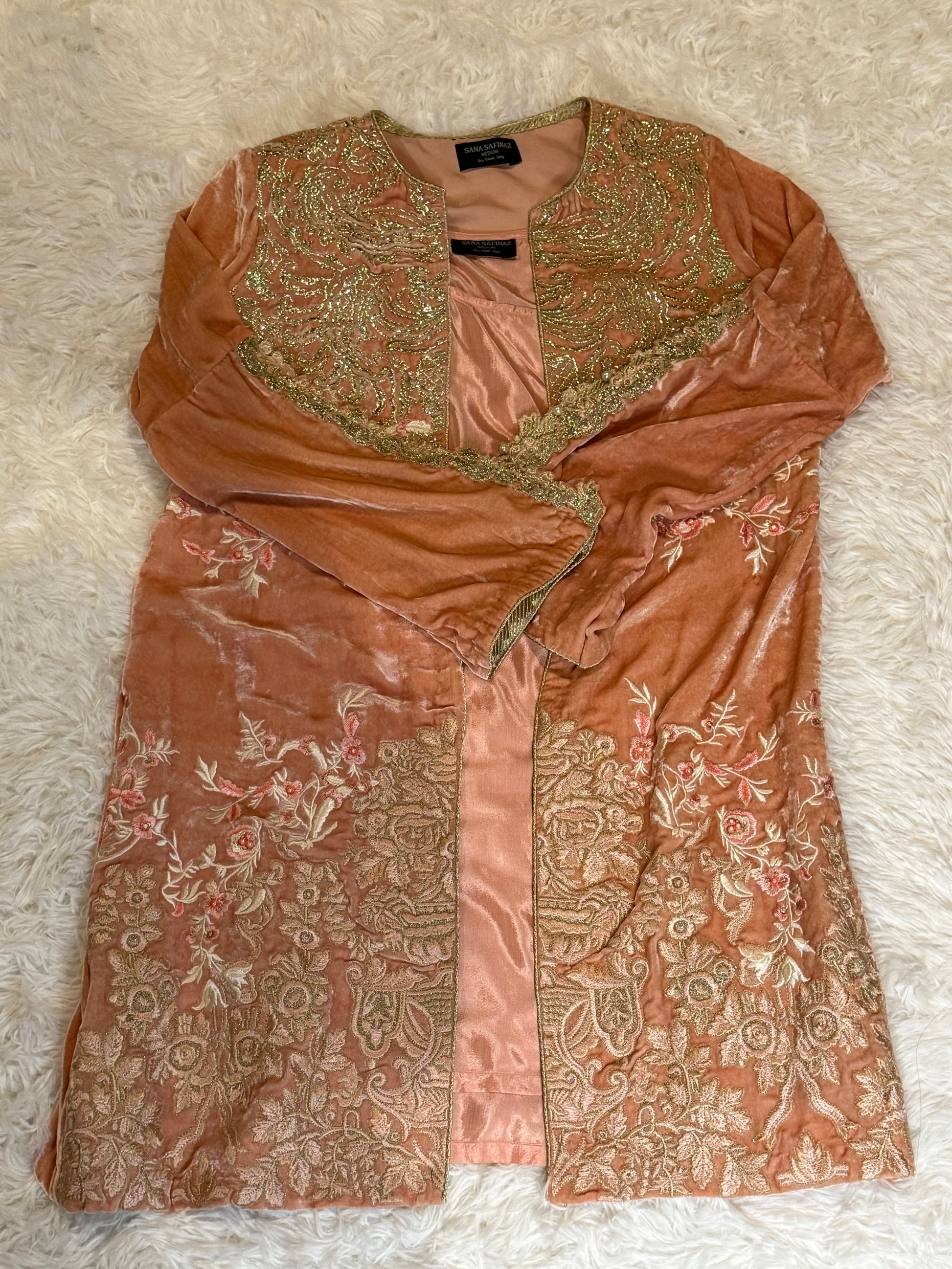 Sana Safinaz Peach Velvet Jacket with Silver, Pink, and White Floral Embroidery.