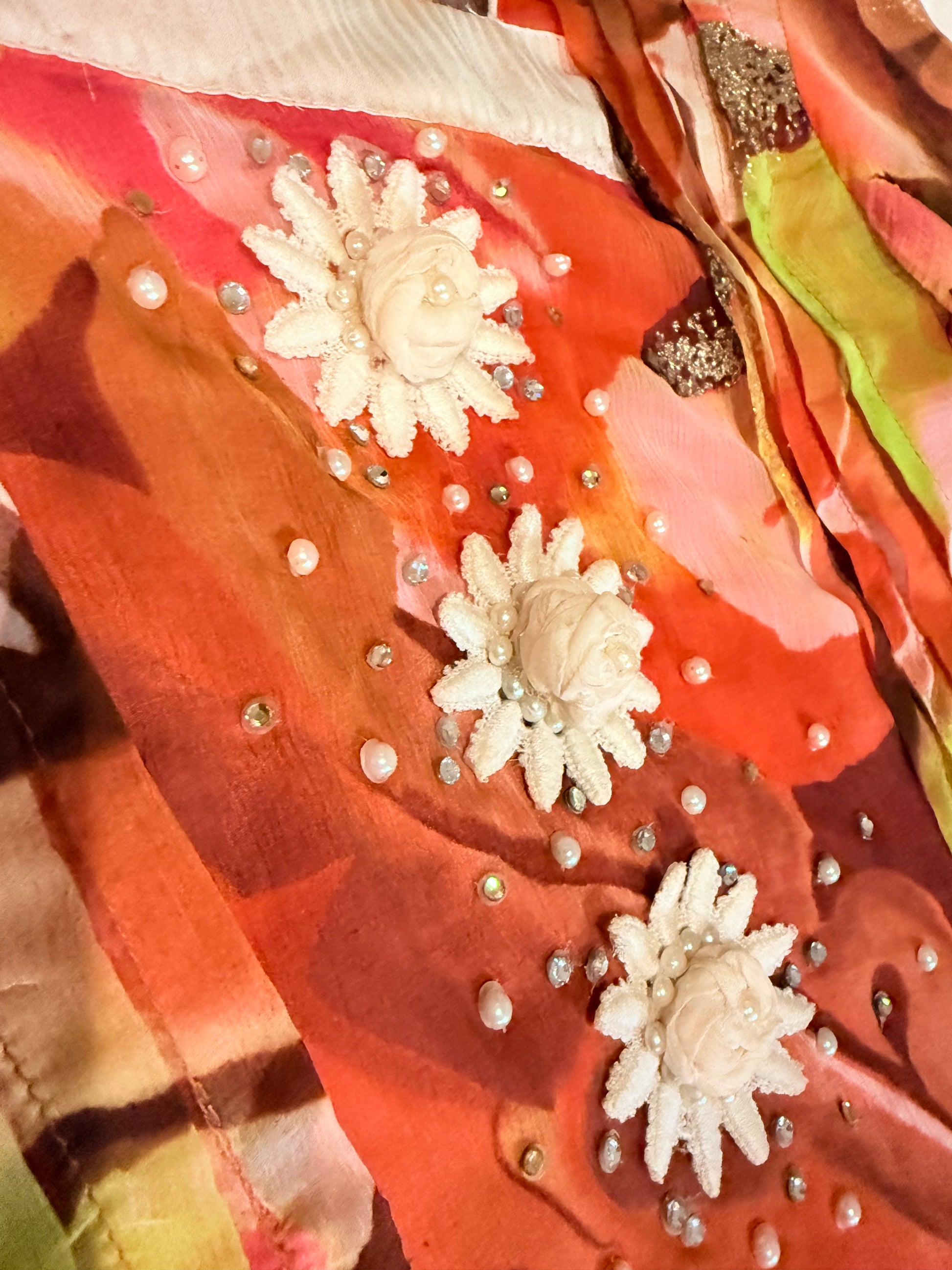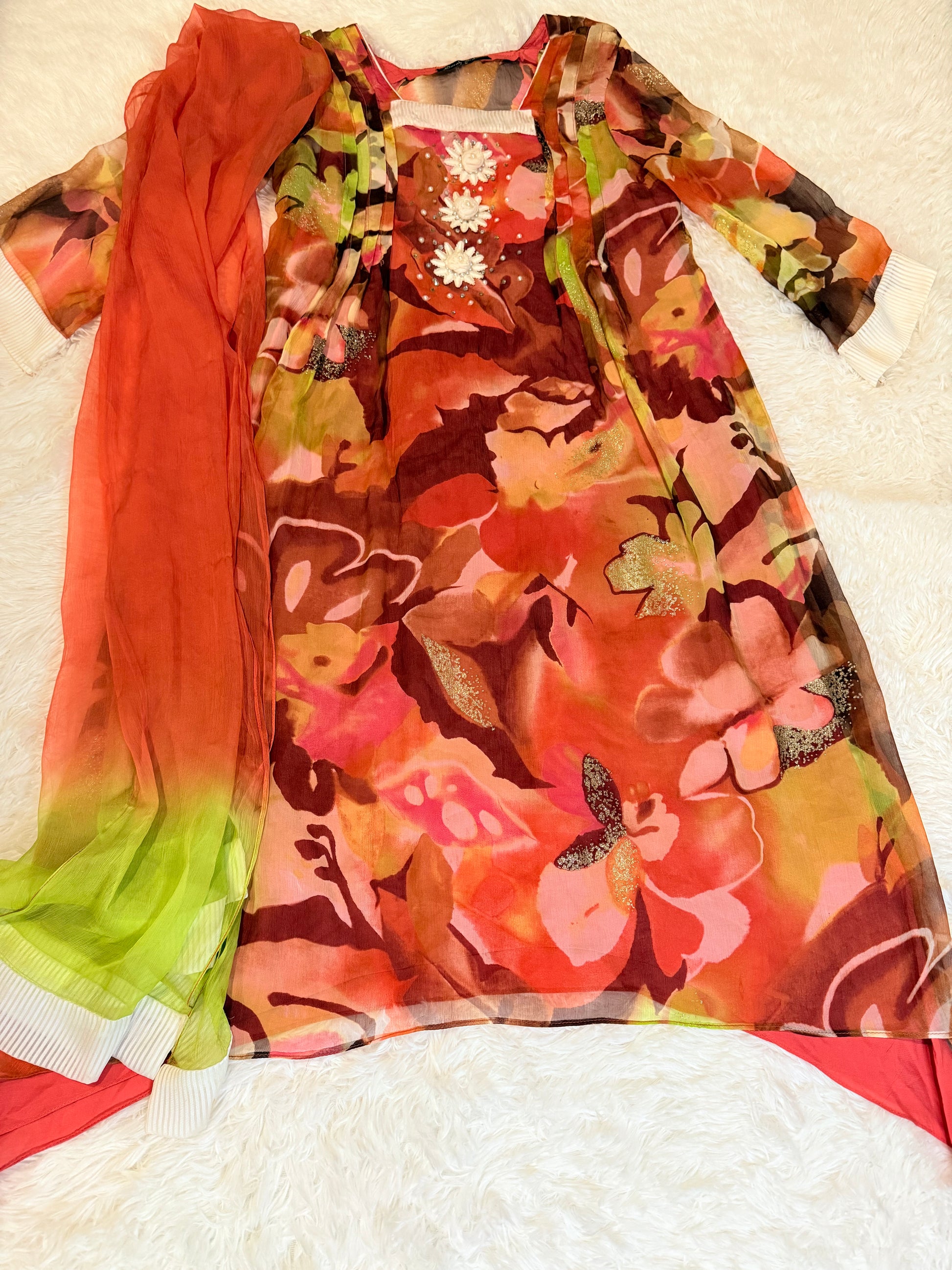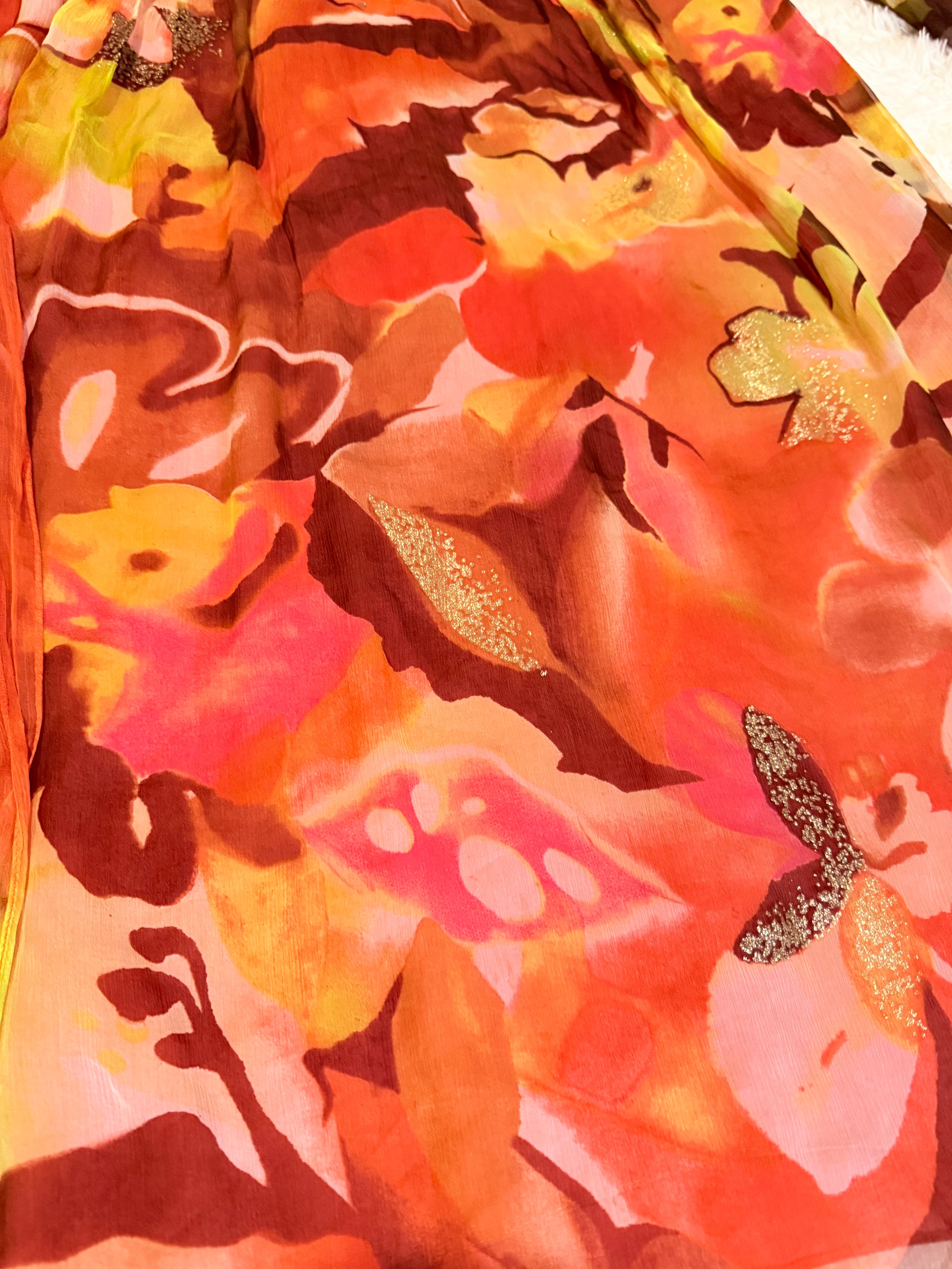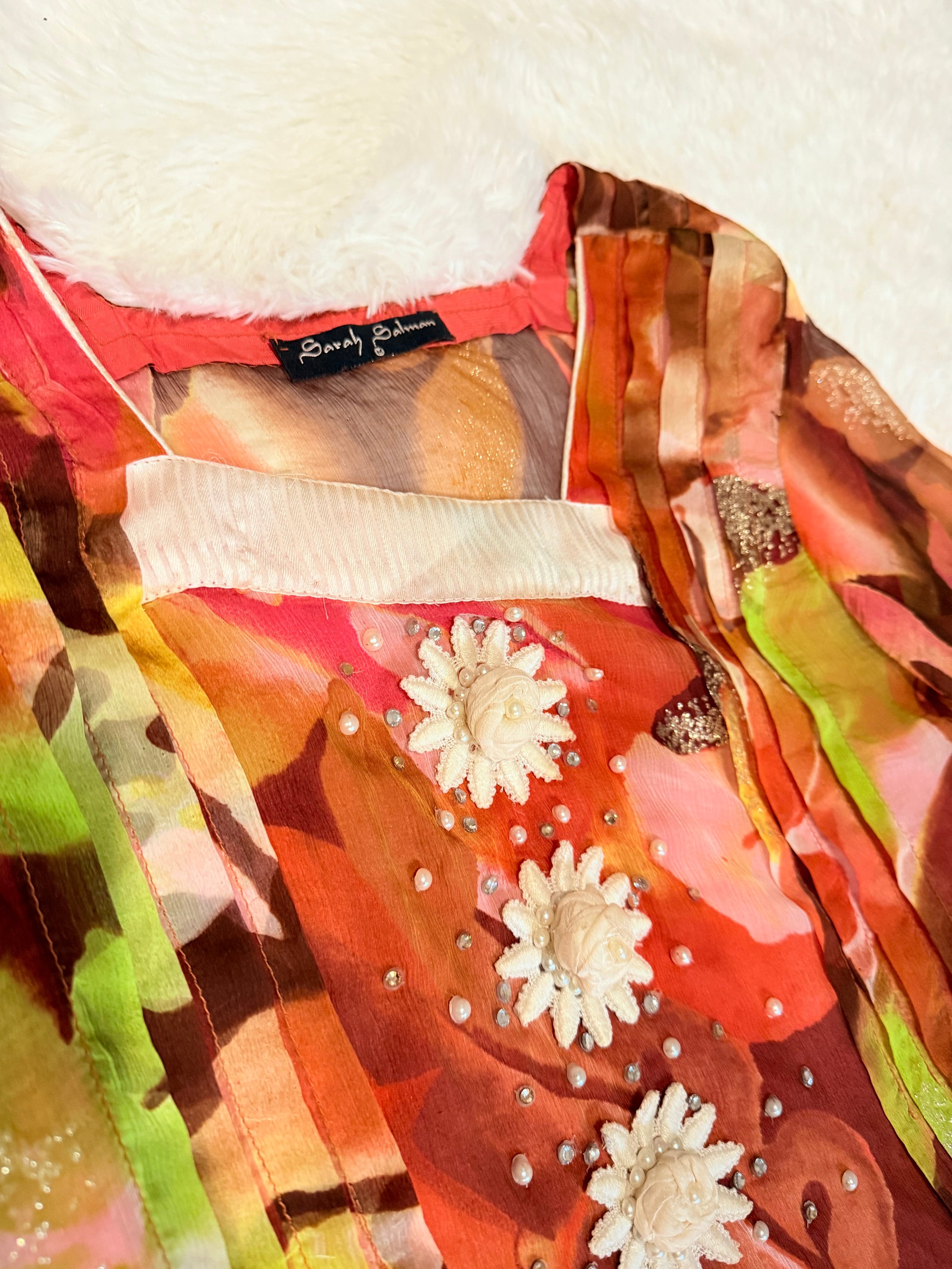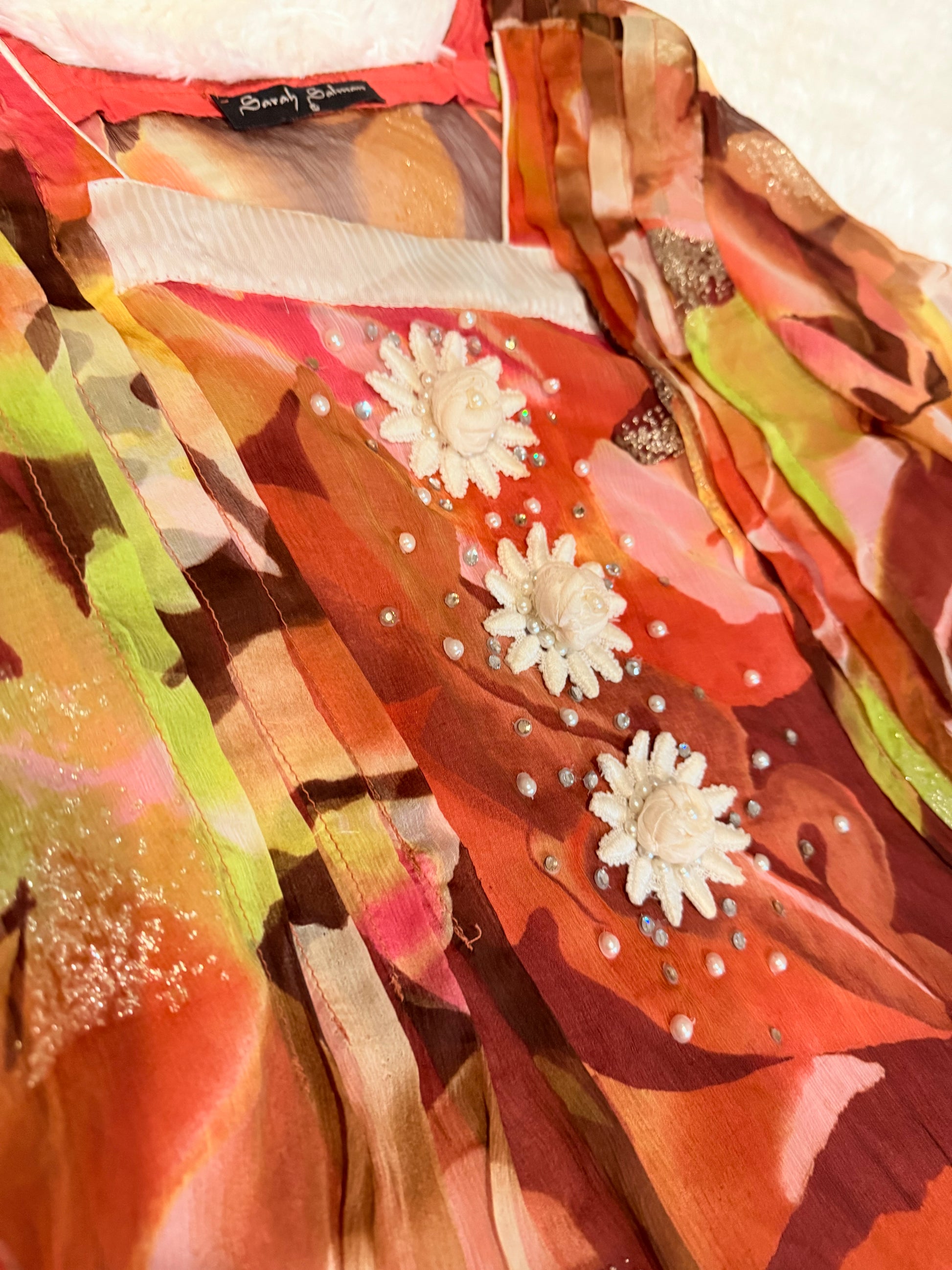 Sarah Salman Chiffon Orange & Brown Drop Corner Kameez with Chiffon Dupatta and Slip.
