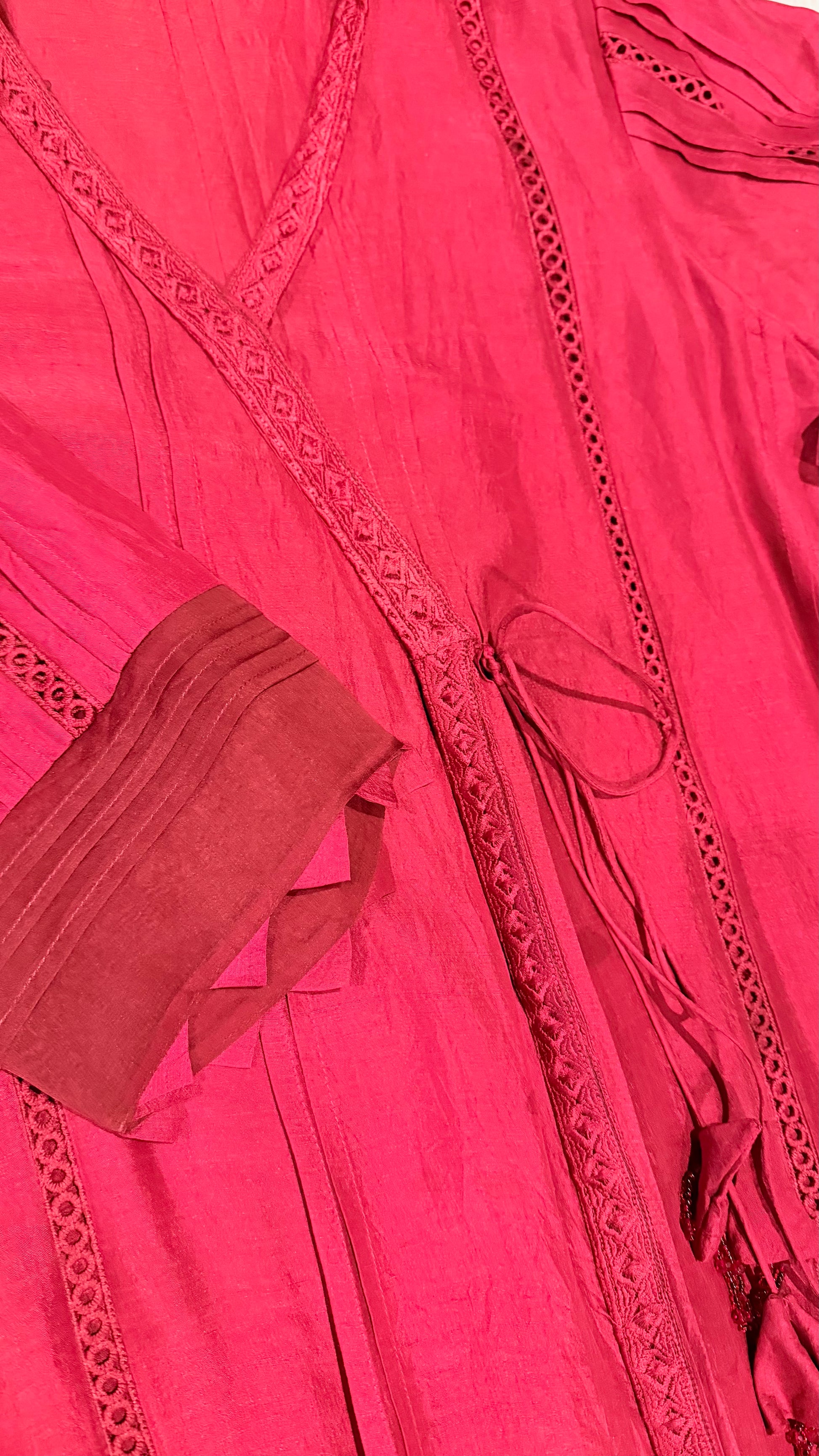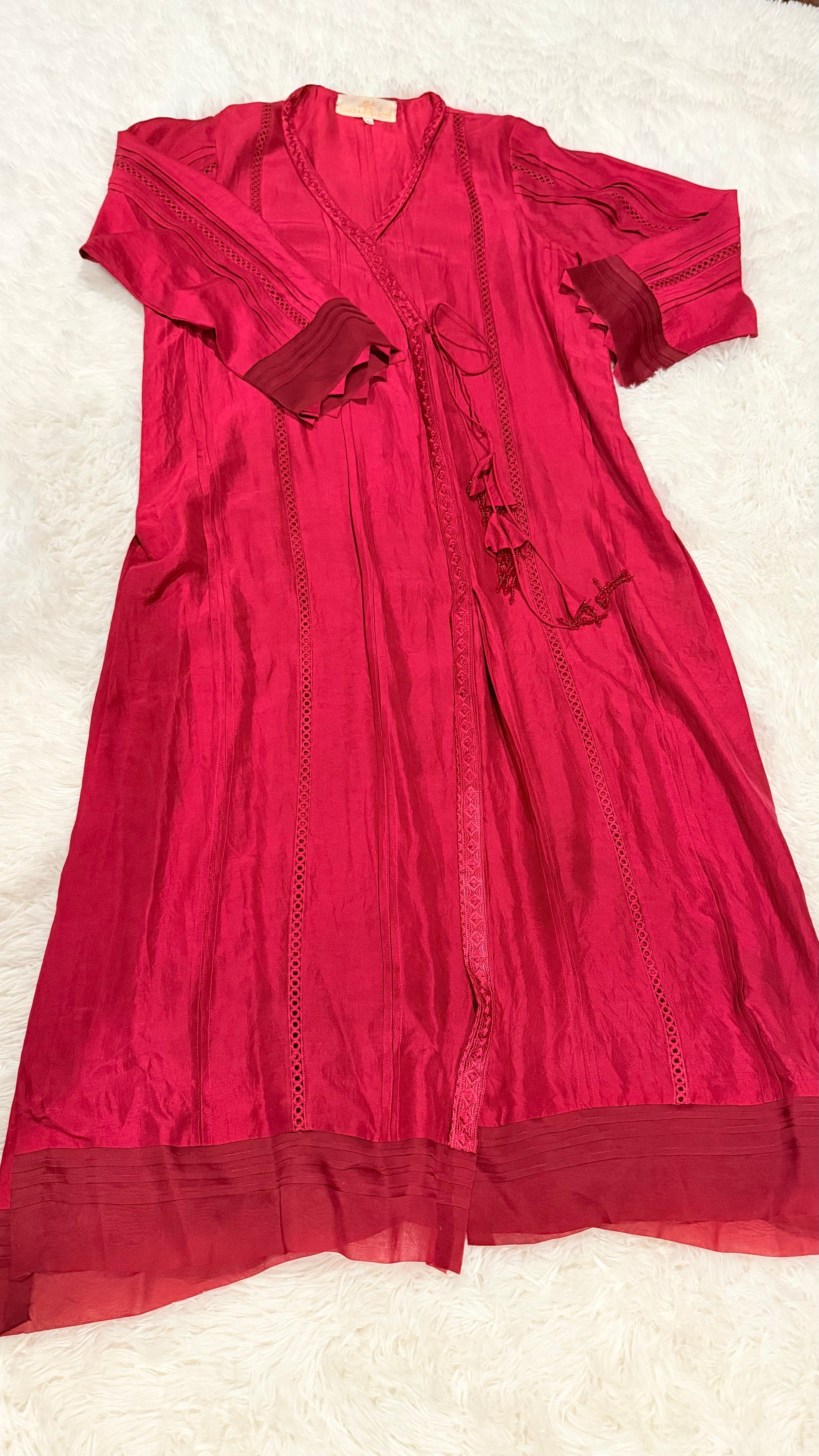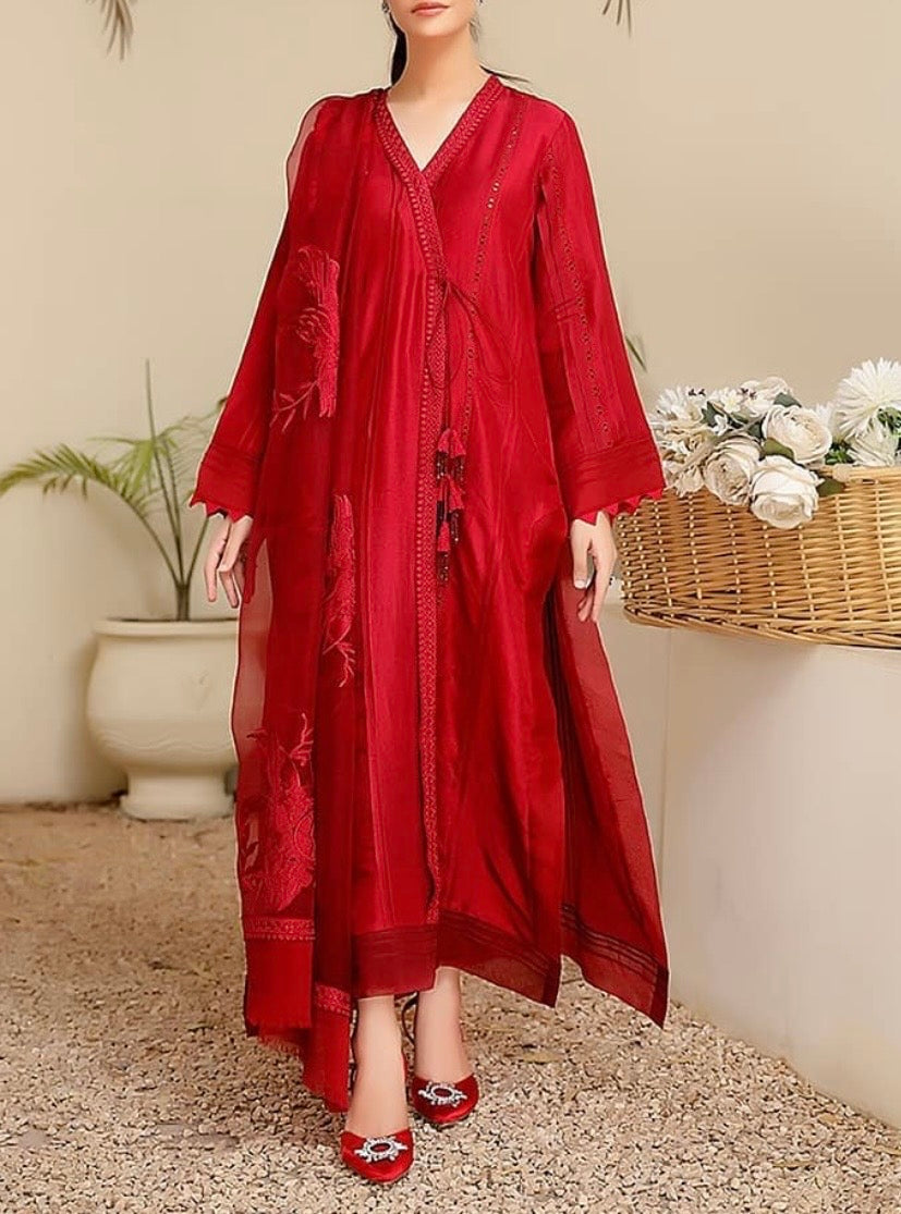 Sumaira Aurangzeb Red Pure Silk Angrakha Cut shirt with straight pants and beautifully embroidered dupatta.