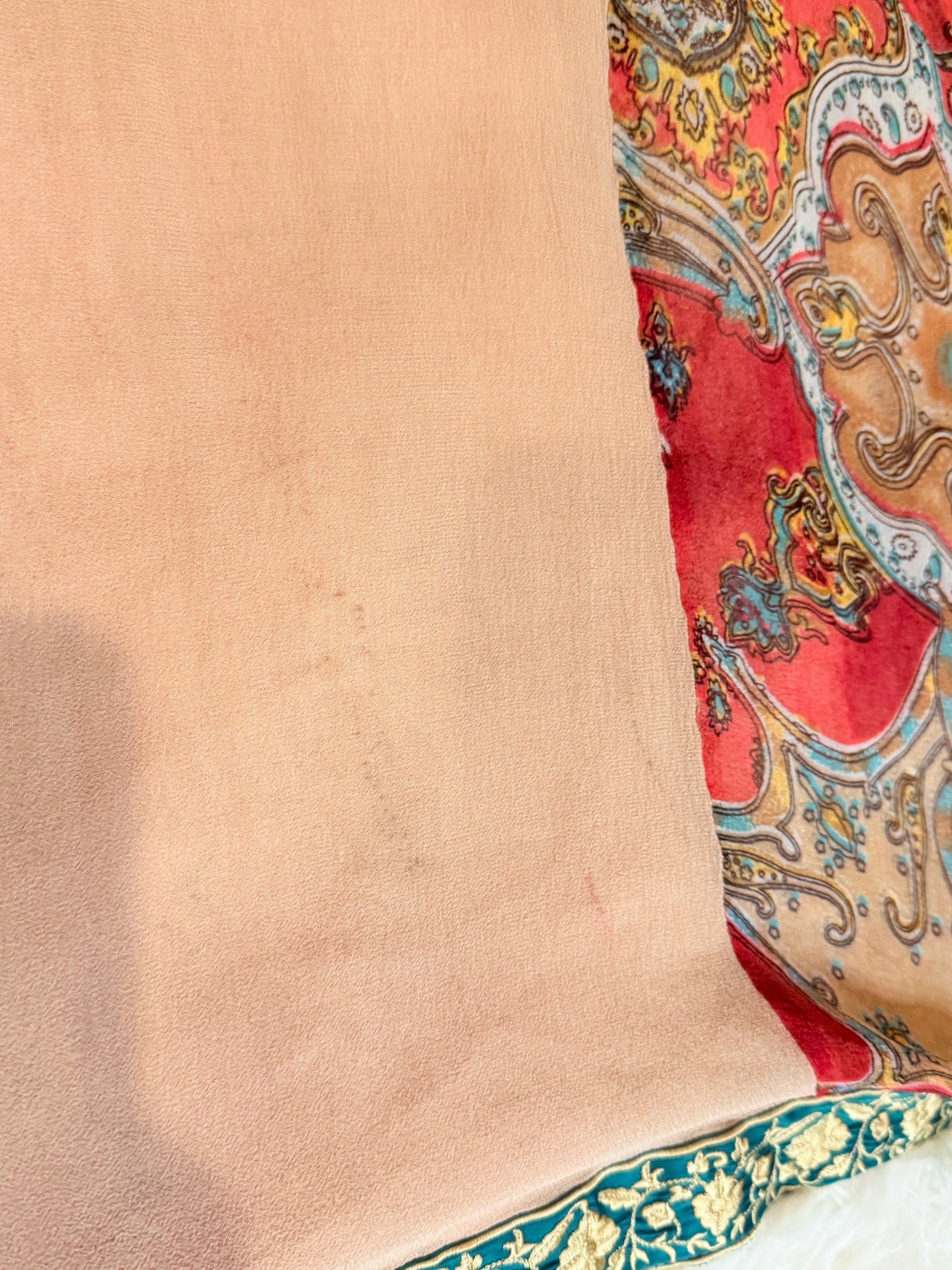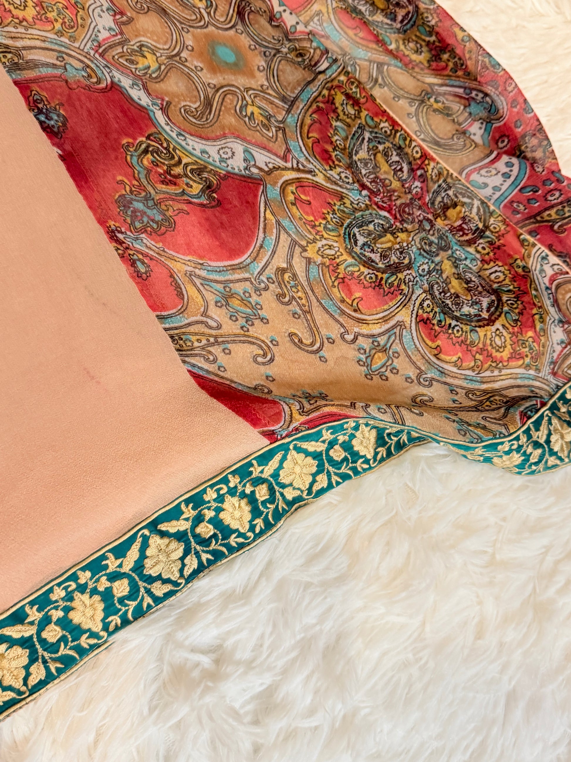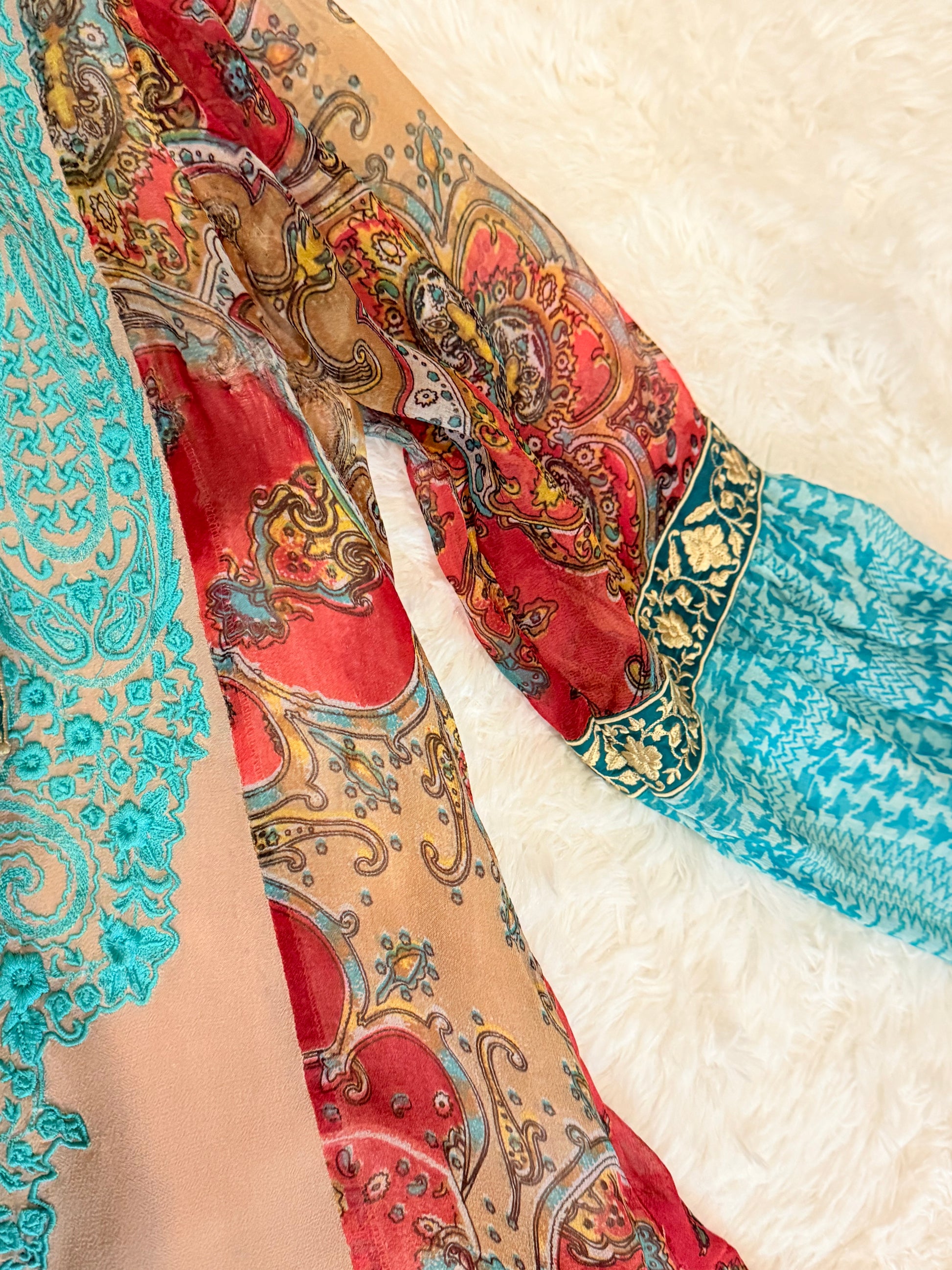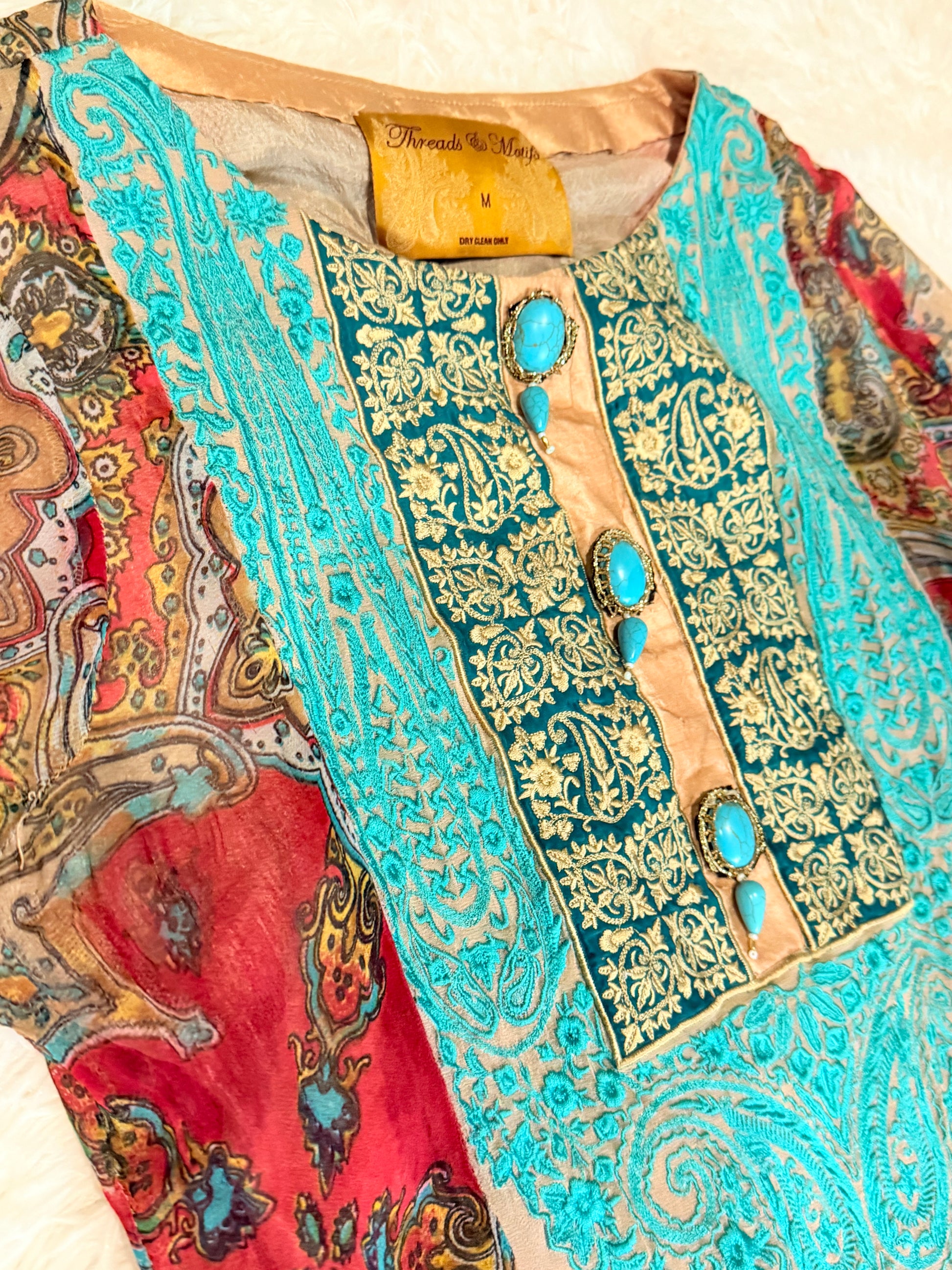 Threads and Motifs Embroidered Chiffon Shirt with Embellished Buttons and Silk pants