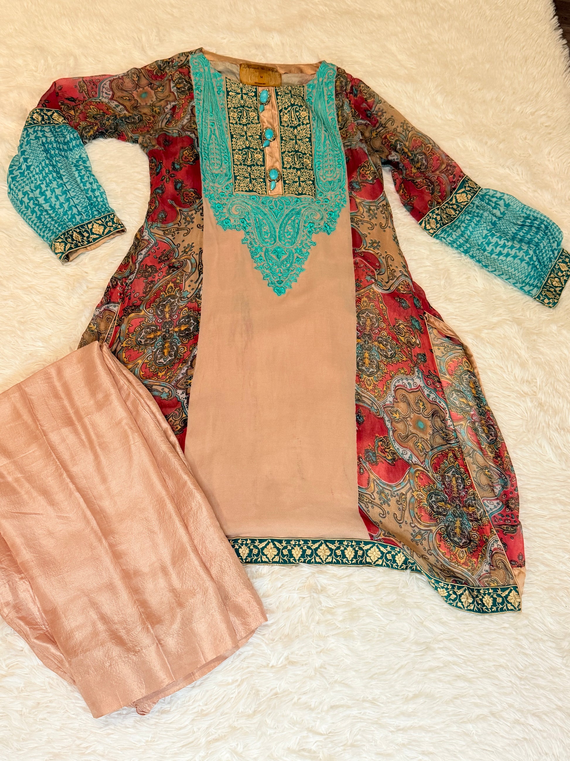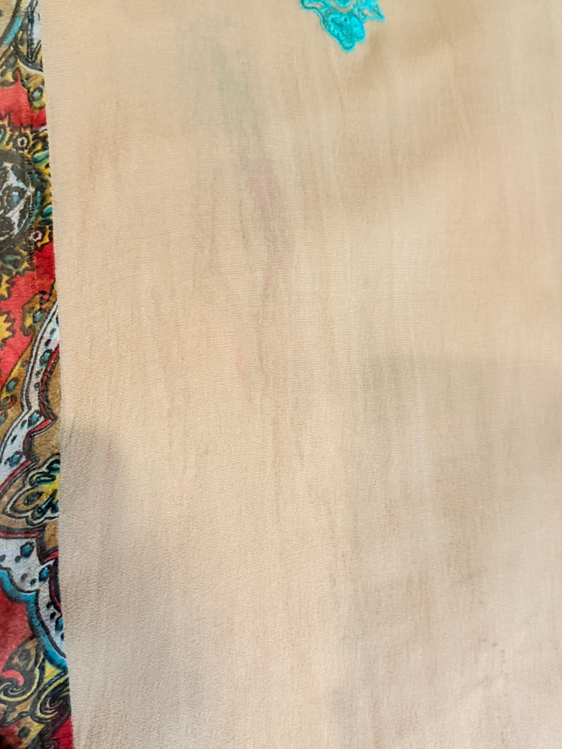 Embroidery on chest, sleeves and hemline. Buttons are very cute and add a stylish element to the outfit. Perfect formal outfit. Pants are plain silk. There are a few marks/stains on the front of the shirt which I have taken pictures of. Price has been adjusted accordingly.