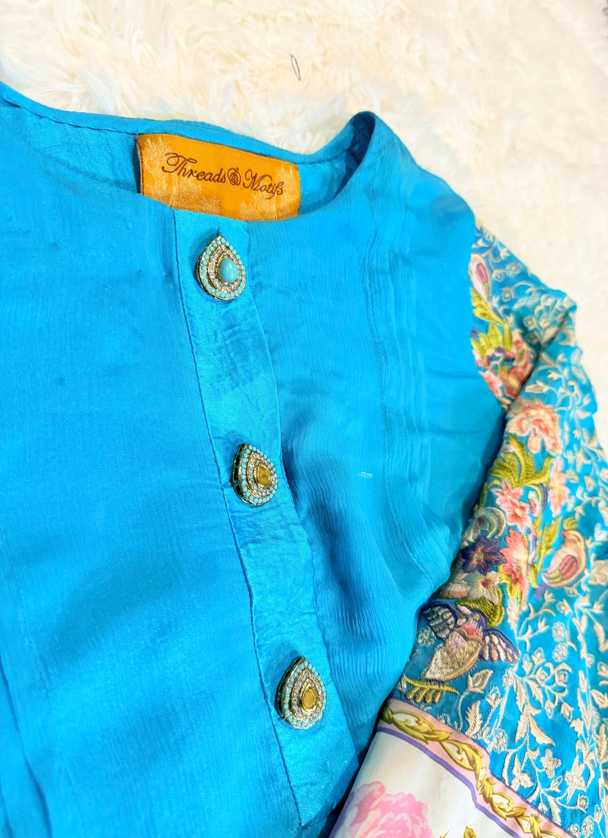 Threads & Motifs Teal Chiffon Shirt with Slip and Heavily Embroidered Bell Sleeves
