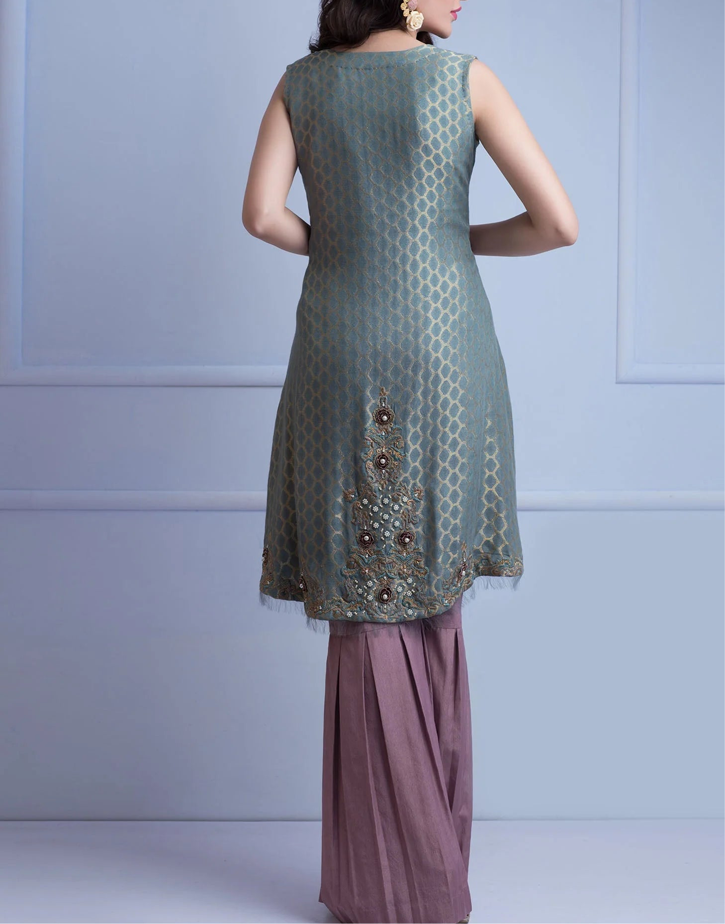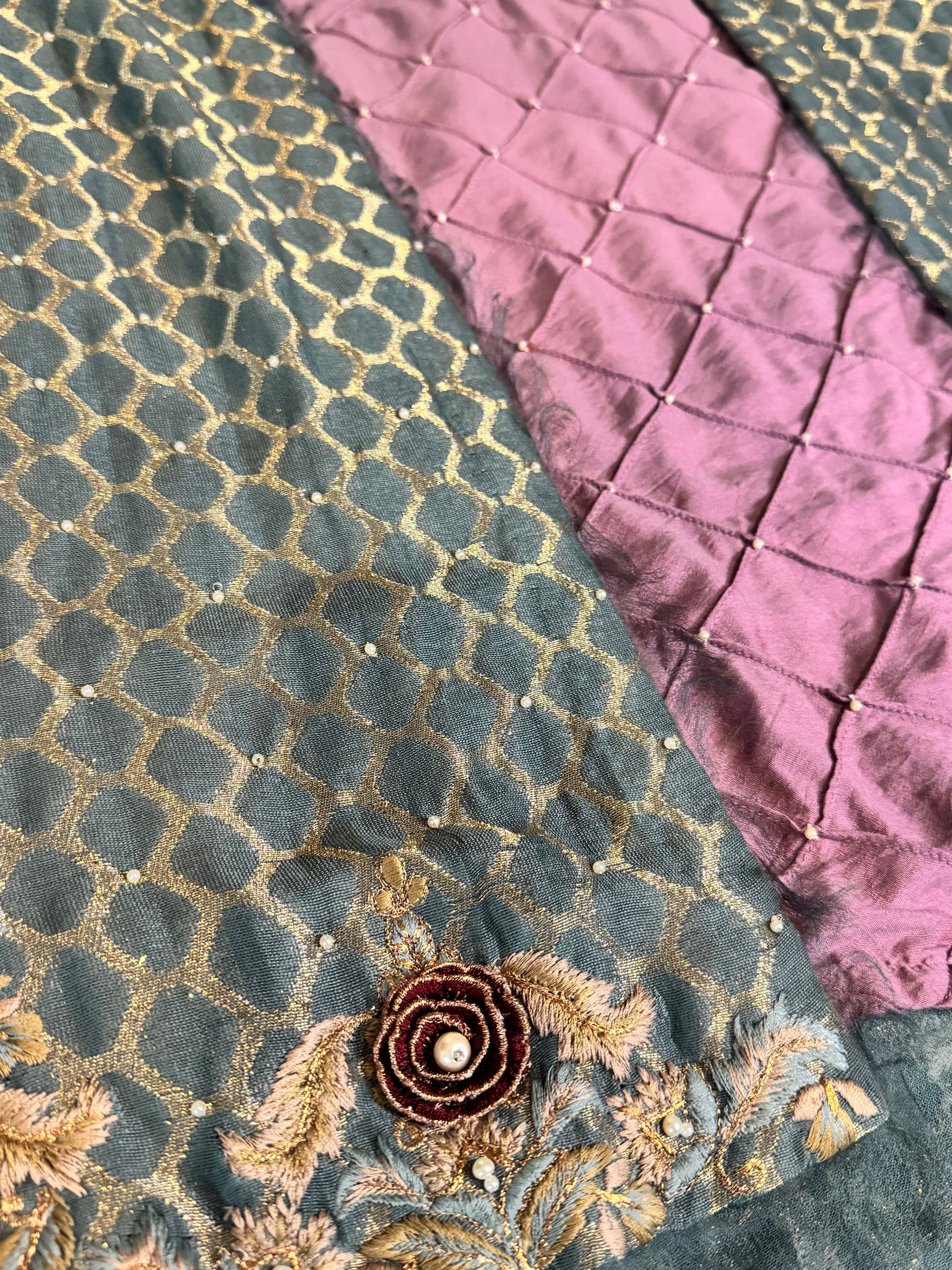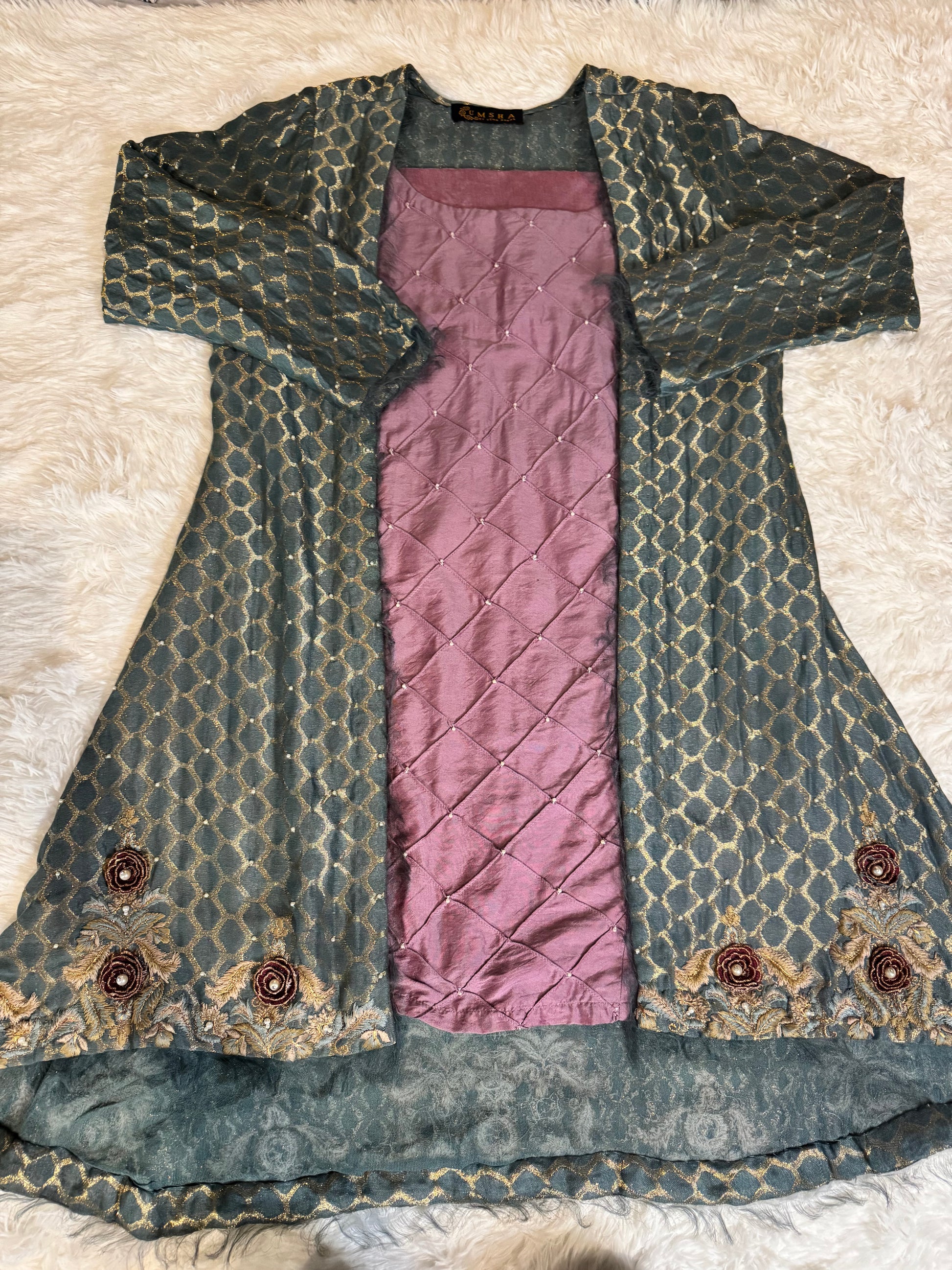 Umsha by Uzma Babbar beautiful outfit with intricate embroidery all around. Pictures don’t do justice to the details in the shirt and jacket. Slip and gharara pants are made of silk material, jacket is Jamawar chiffon with lining.