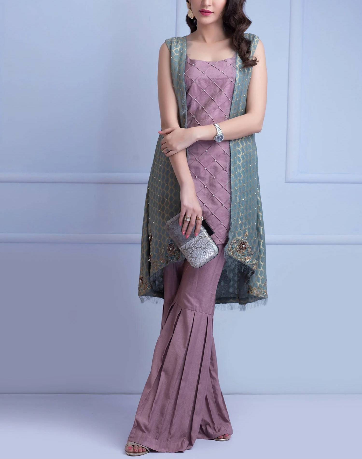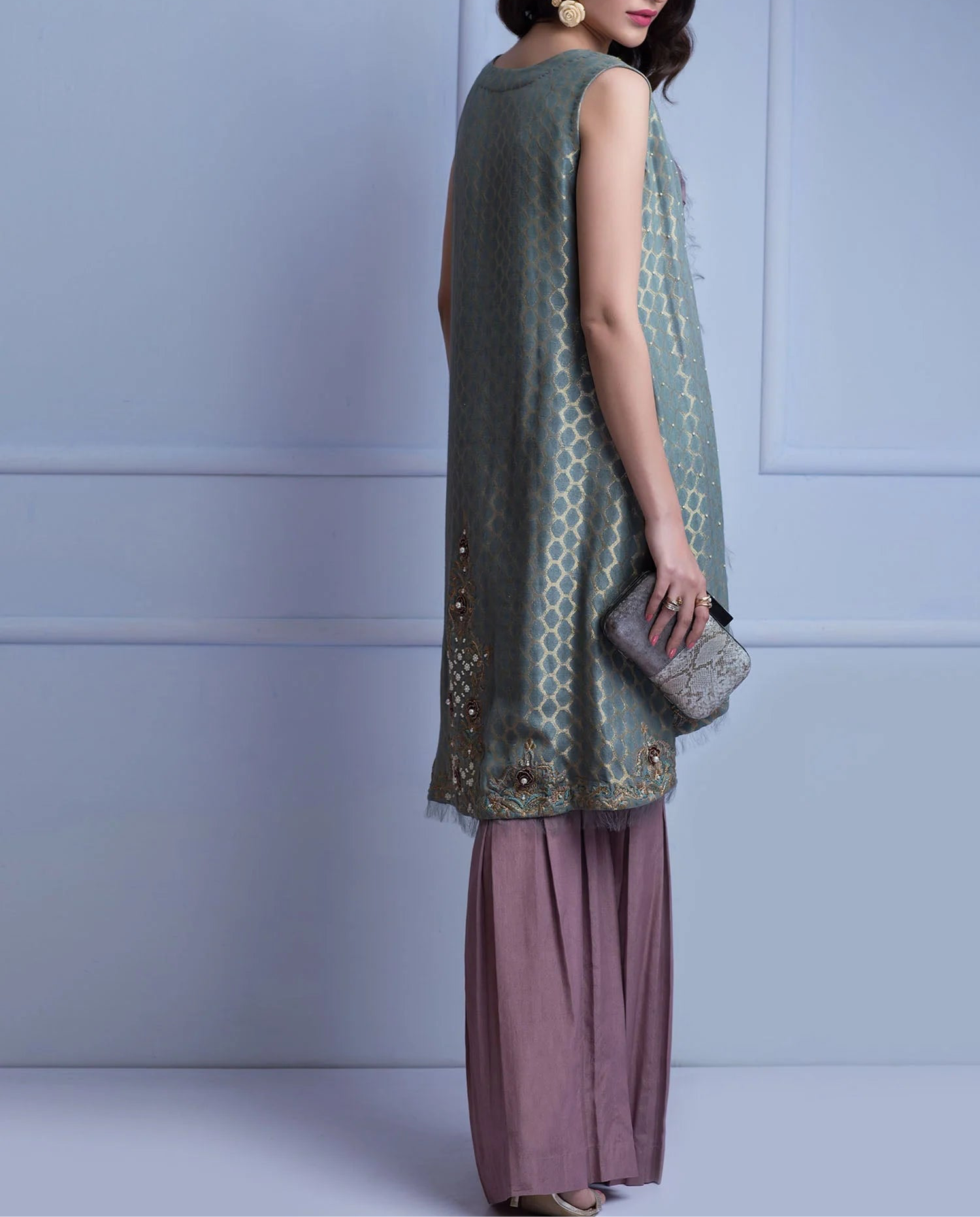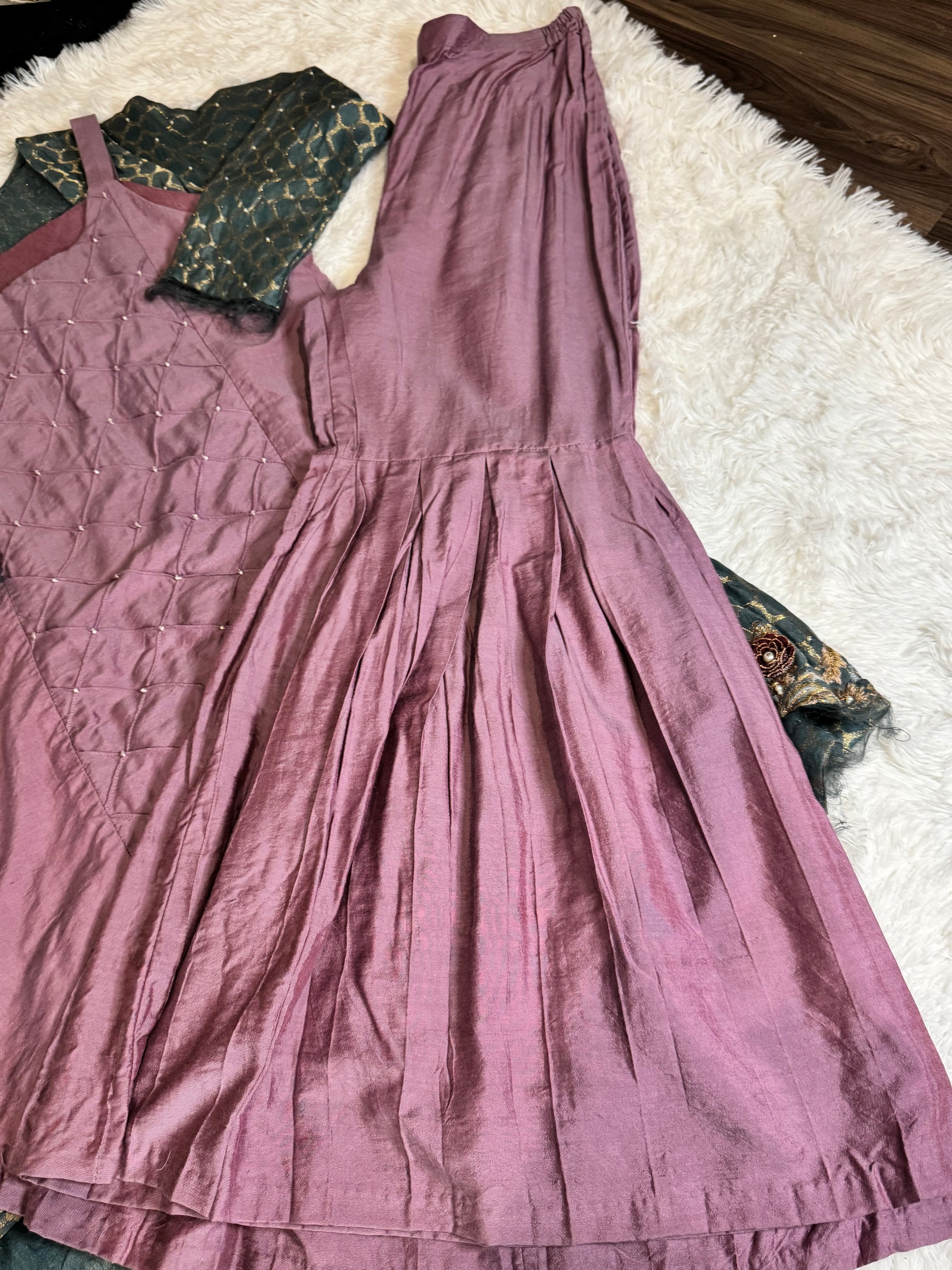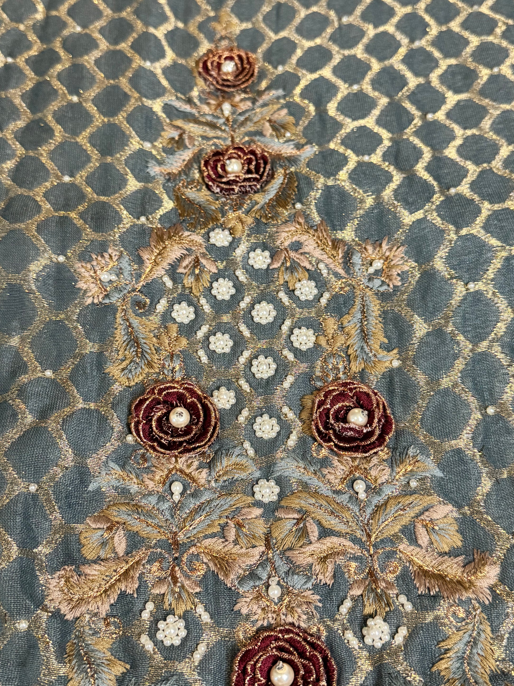 Umsha by Uzma Babbar beautiful outfit with intricate embroidery all around. Pictures don’t do justice to the details in the shirt and jacket. Slip and gharara pants are made of silk material, jacket is Jamawar chiffon with lining.