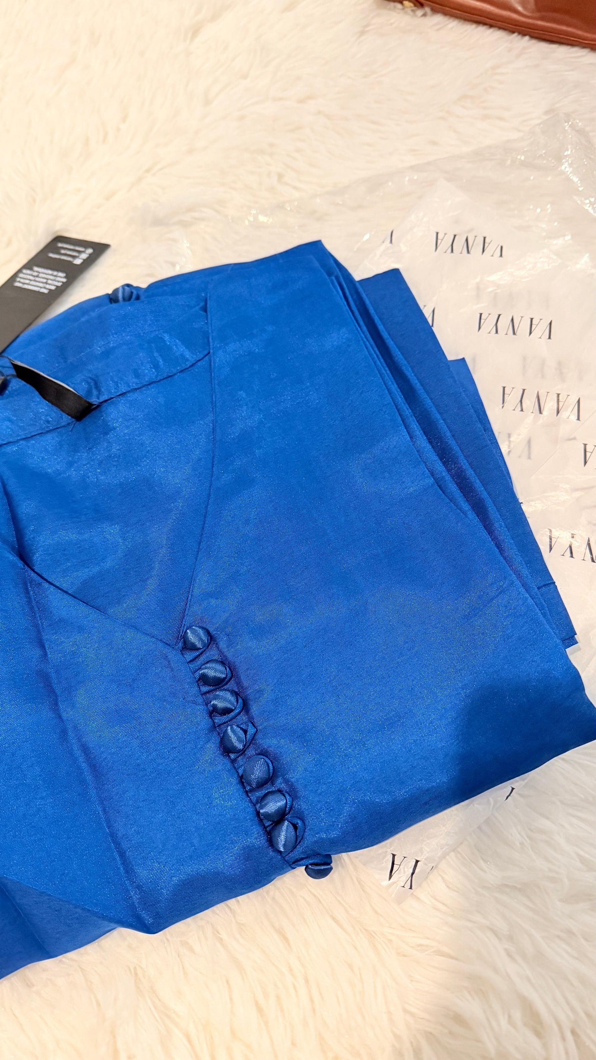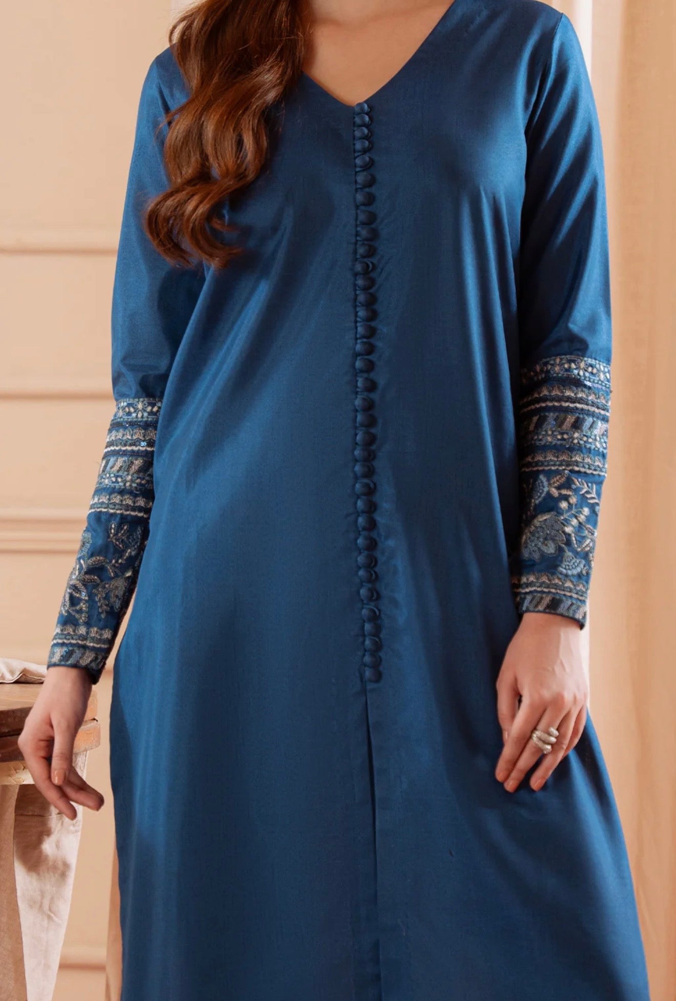 Vanya Blue Long Silk Shirt with Trousers and Embroidery on Sleeves.