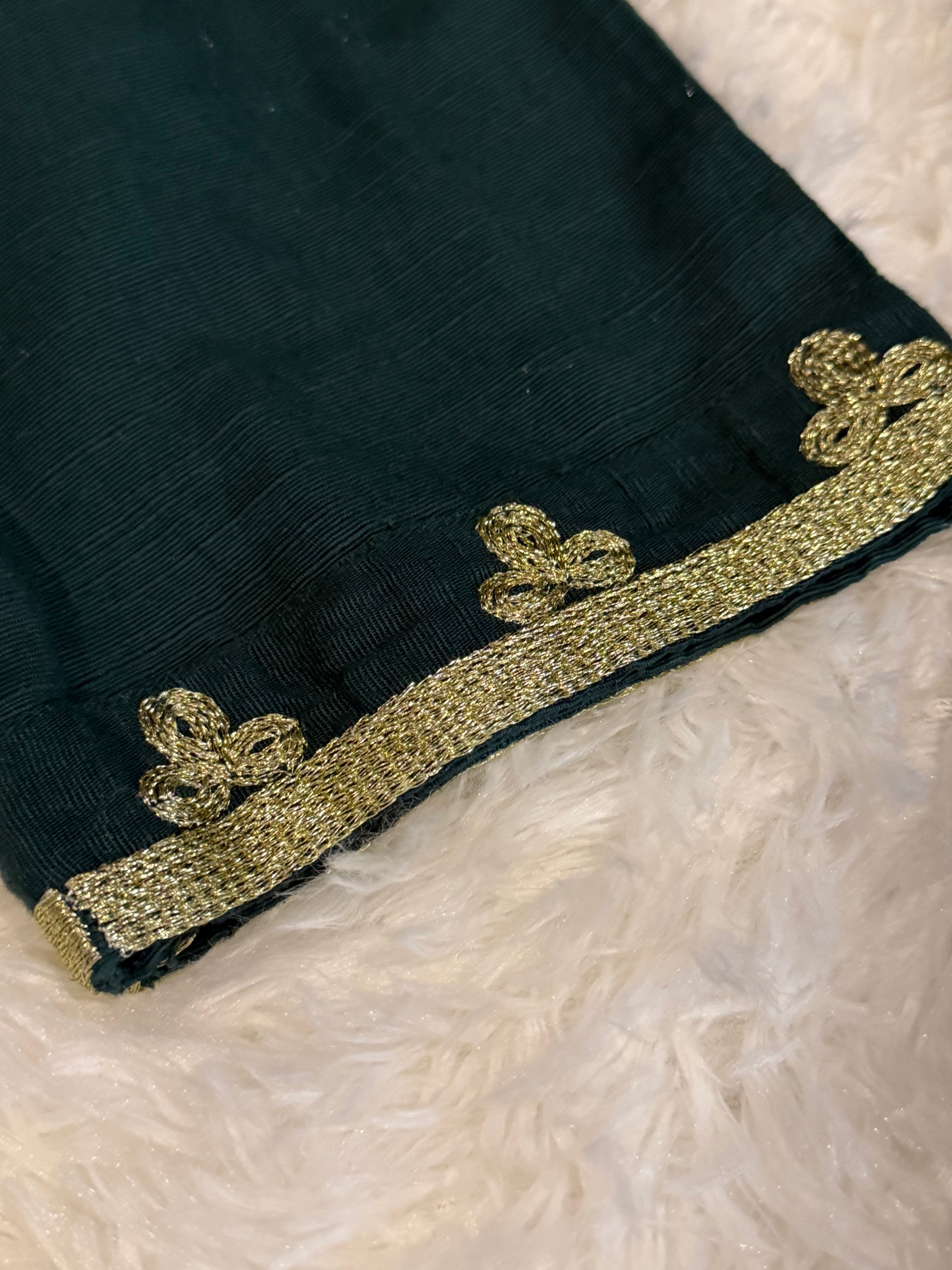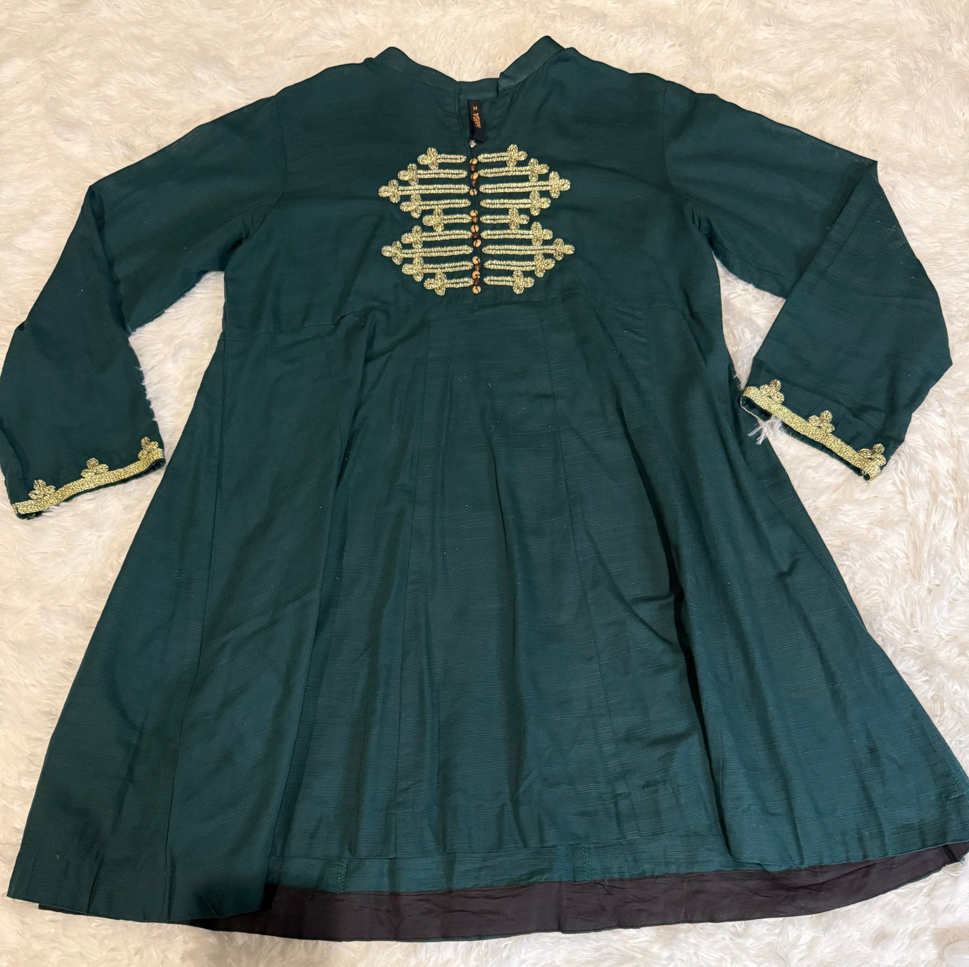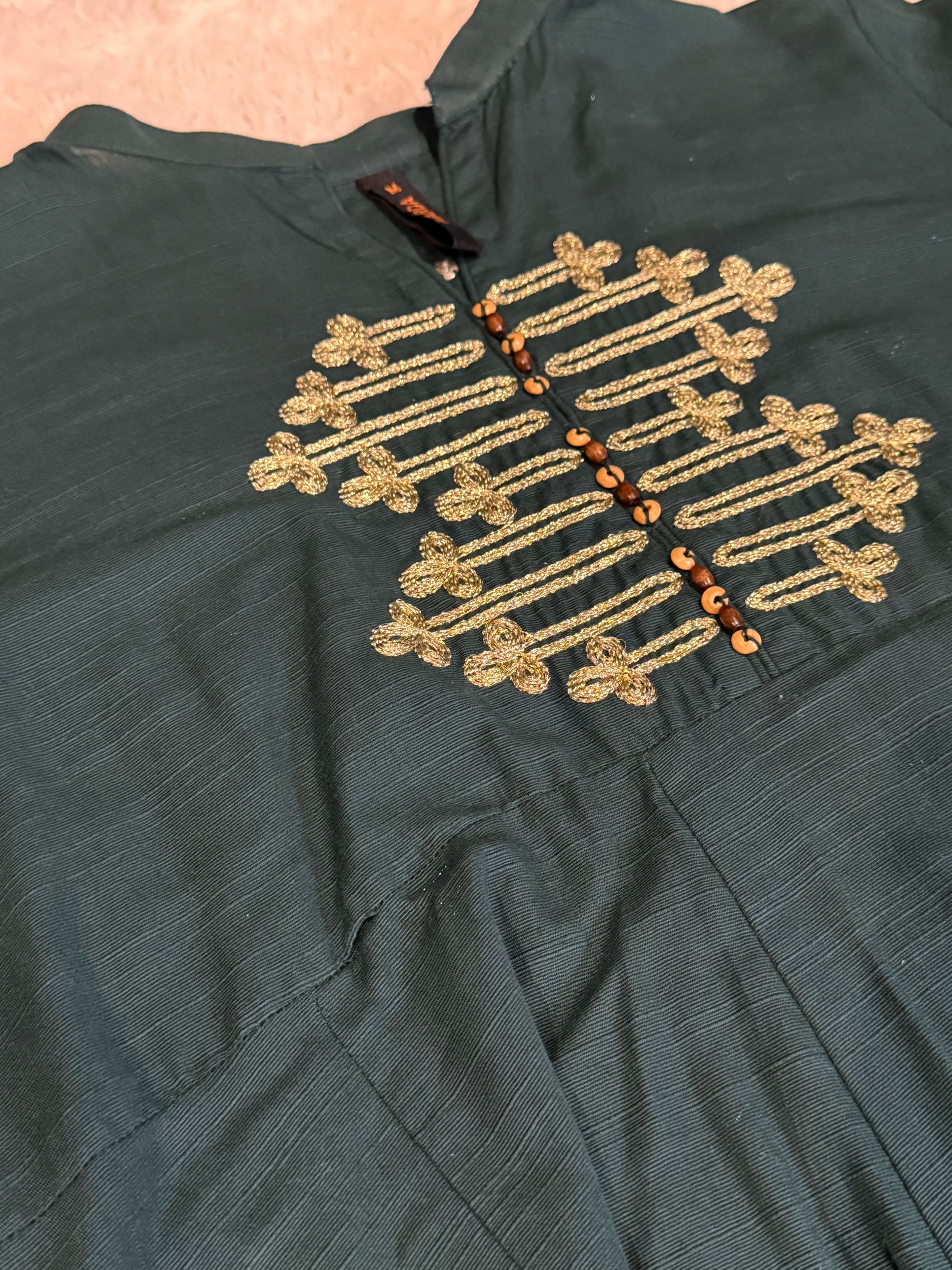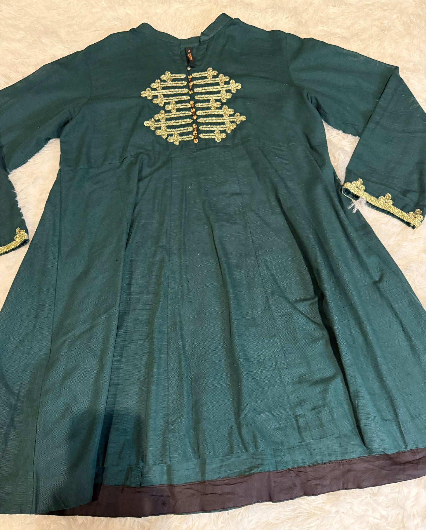 Warda Teal Kameez with Gold Embroidery. Can be paired with black or golden bottoms.