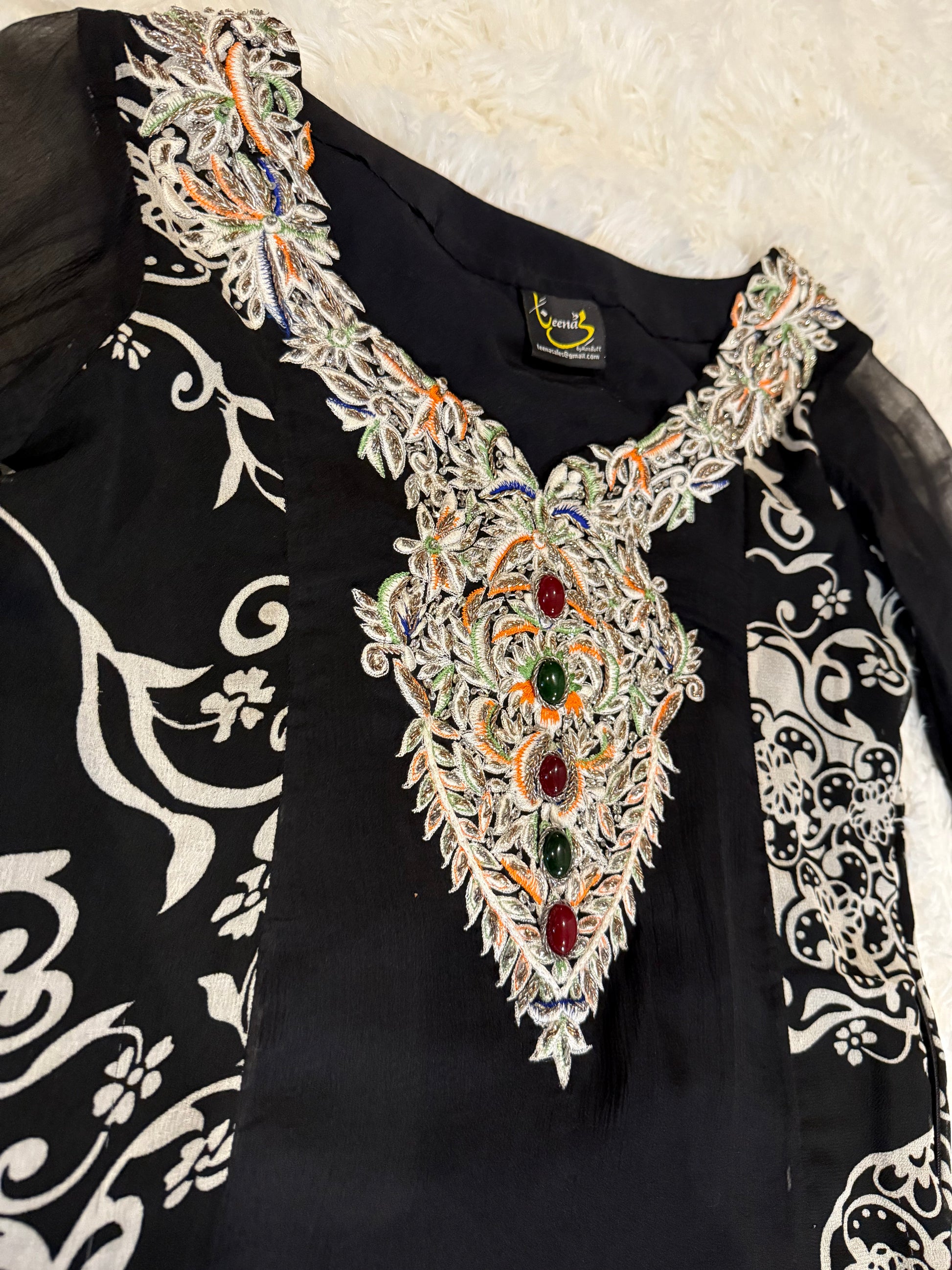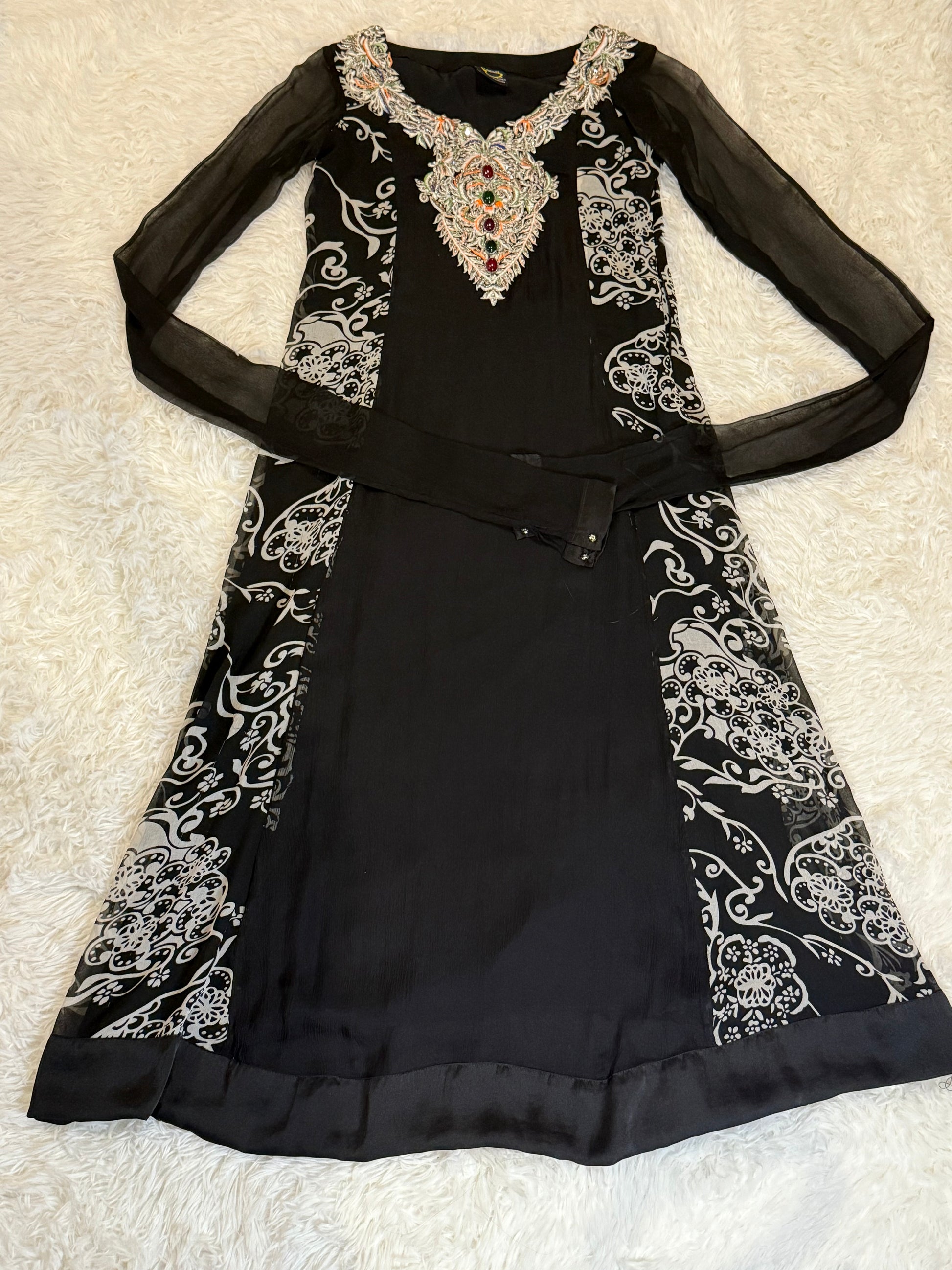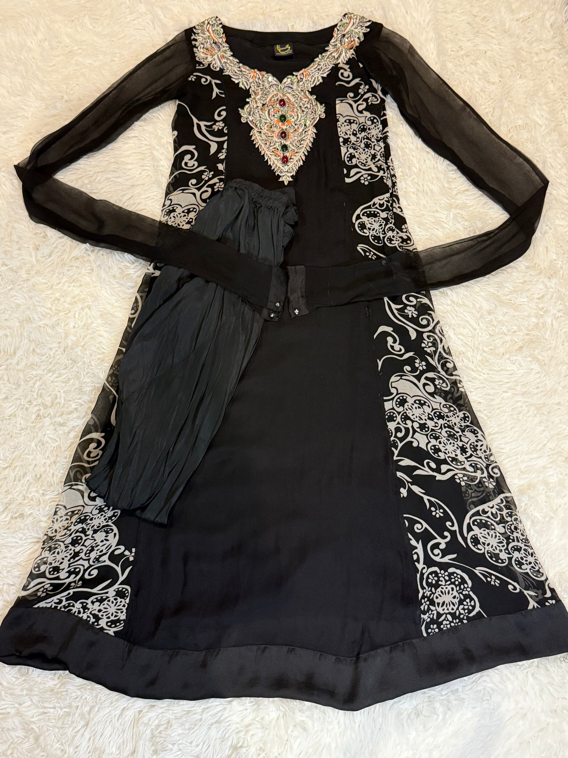 Zeenat by Hina Butt Black Chiffon Anarkali Style Suit with Pajama Pants and “Chinyere” Sleeves
